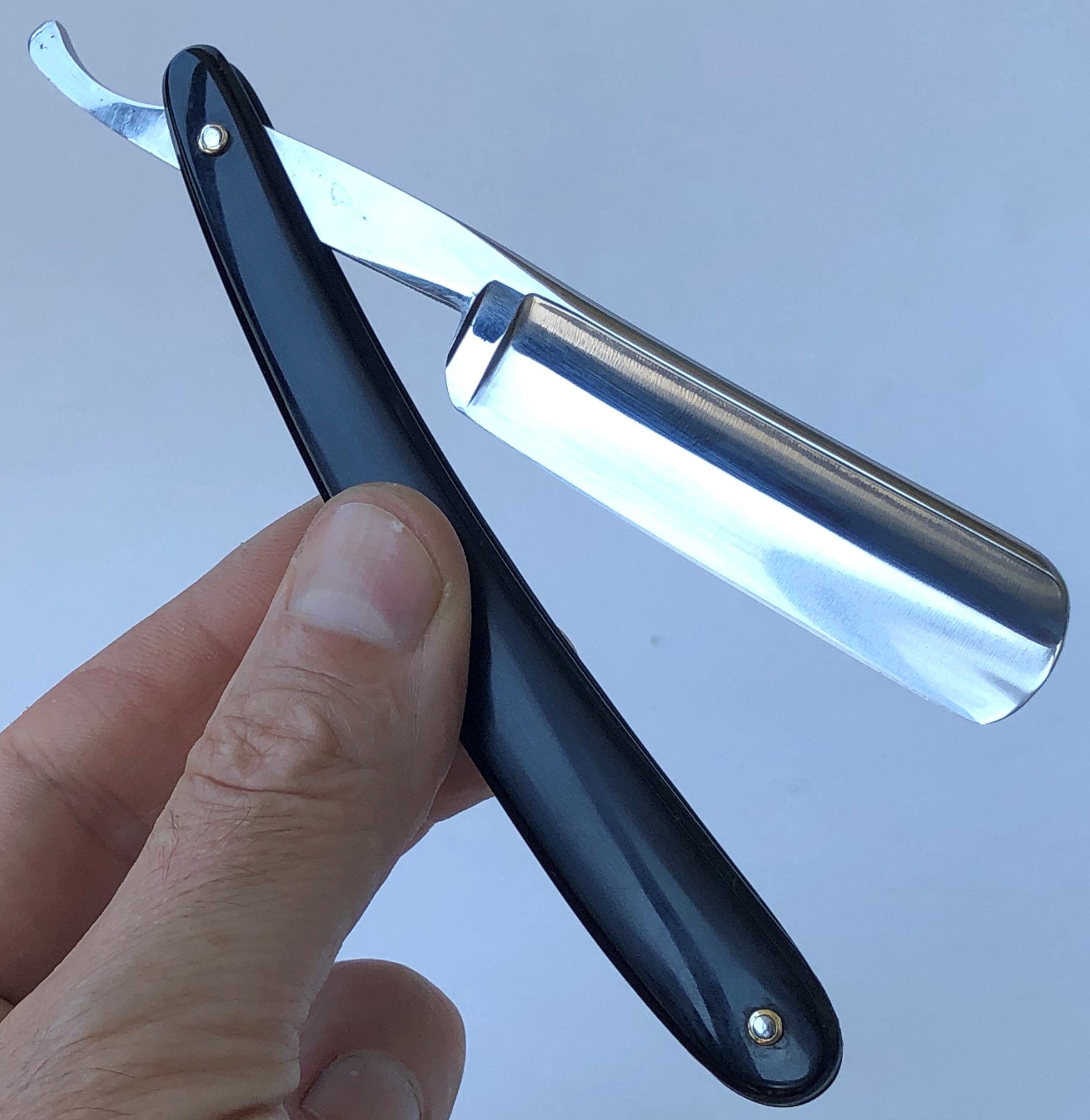 Бритва в очень хорошем состоянии.Непонятно, была ли в пользовании или нет, так как следов на обушке от заточных камней не наблюдается, но ширина полотна неоригинальна.Возможно был изначально скол, а может быть просто правильная и профессиональная эксплуатация.Бритва была разобрана для удаления следов окисления и царапин.Добавил внутренние шайбы и поставил втулку.Кромочка почти равномерна по всей длине. Сталь чистая от видимых дефектов.
