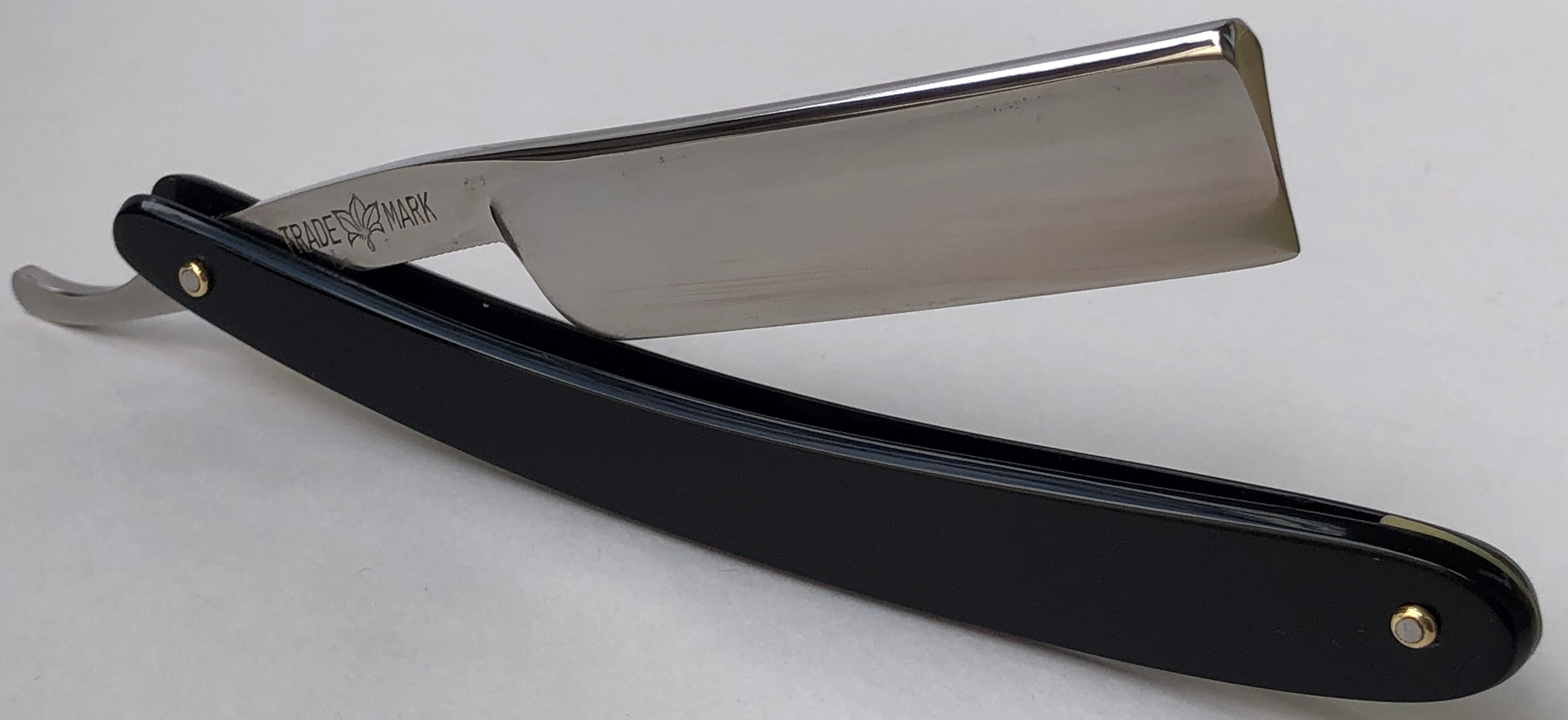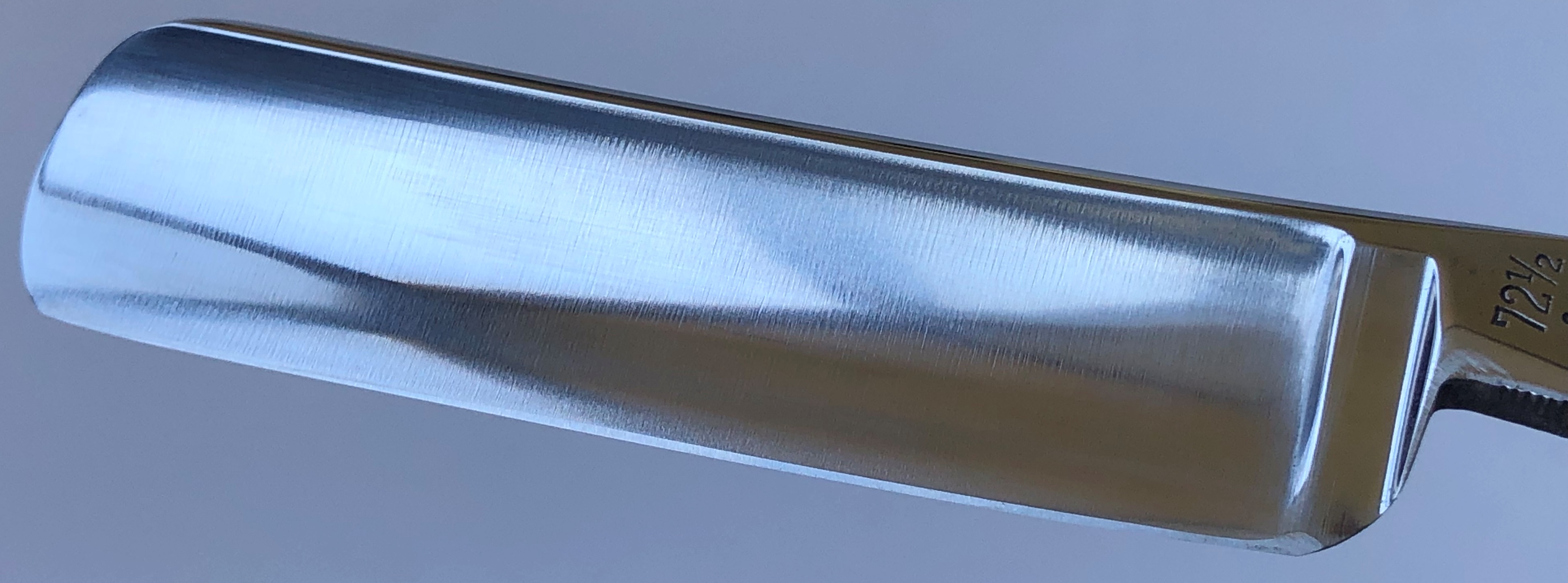 Бритва в очень хорошем состоянии.Непонятно, была ли в пользовании или нет, так как следов на обушке от заточных камней не наблюдается, но ширина полотна неоригинальна.Возможно был изначально скол, а может быть просто правильная и профессиональная эксплуатация.Бритва была разобрана для удаления следов окисления и царапин.Добавил внутренние шайбы и поставил втулку.Кромочка почти равномерна по всей длине. Сталь чистая от видимых дефектов.