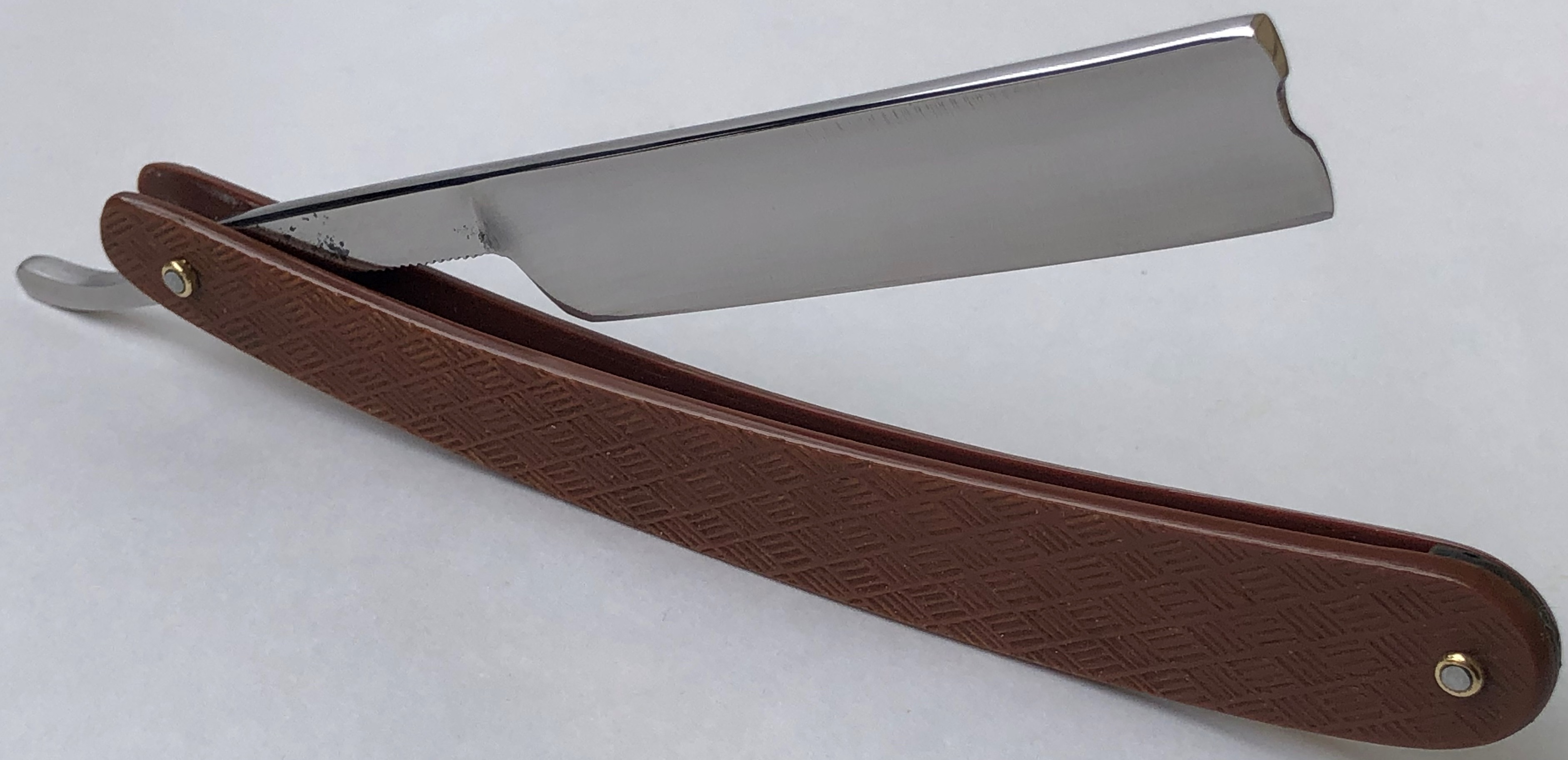 Бритва сохранилась очень хорошо. Немного откорректировал утОчку обушка, заново перешлифовал и умеренно отполировал.Рытвинки в районе осевого пина оставил, чтобы не убирать лишнего, да это собственно и не нужно.На сколько известно, данная модель бритвы комплектовалась рифлёной оправой из прессованного картона. Не стал переустанавливать родную оправу, а поменял ее на примерно такую же(и того же периода производства), только пластиковую , от Труд Вача.Новые пины и внутренние шайбы, для надежности. Очень приятная, не часто встречающаяся, элегантная бритва.Заточена и готова к бритью.