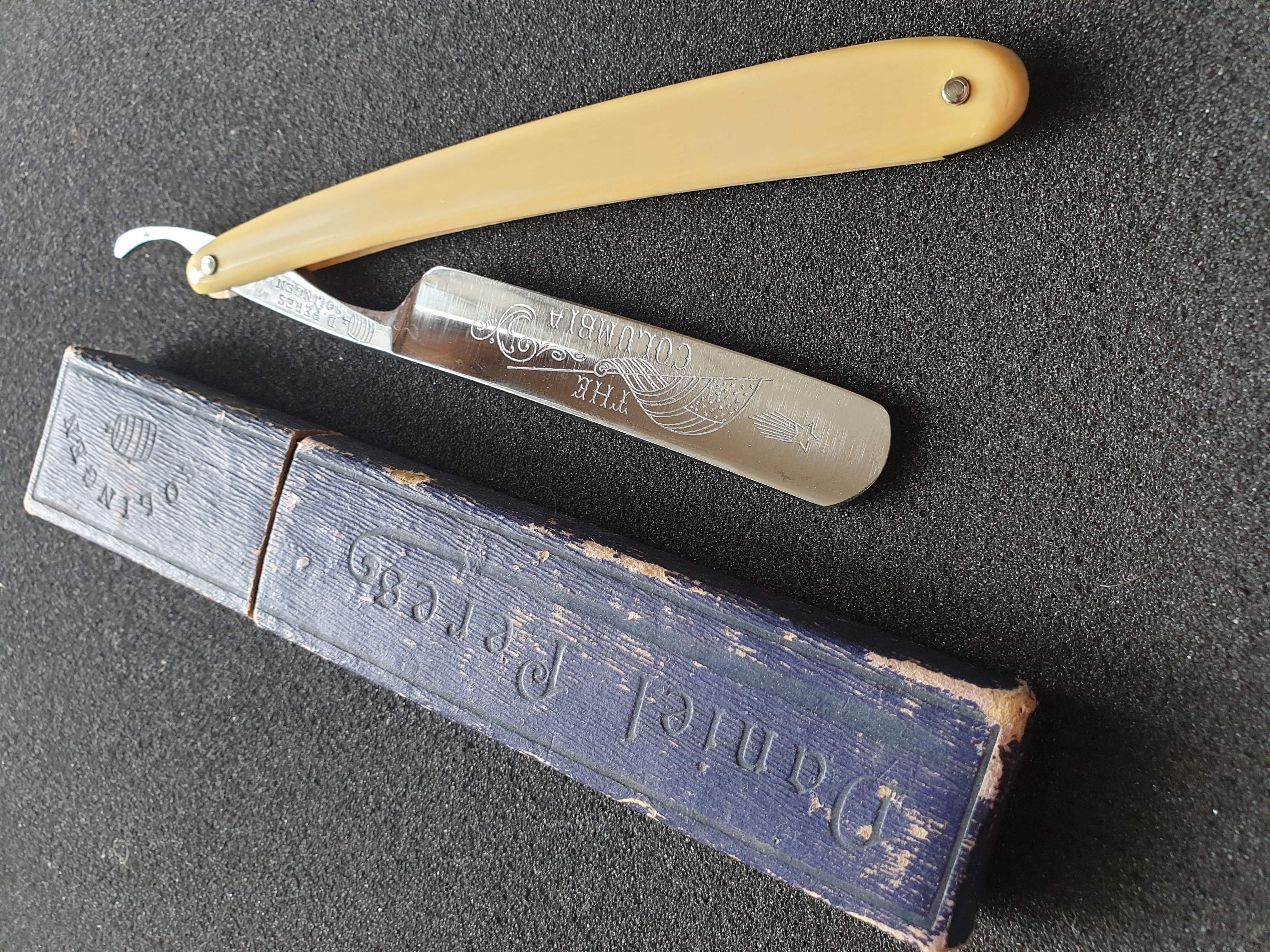 Продаётся от S&T205. Опасная бритва от производителя с богатой историей - Daniel Peres Solingen. Размер 5/8, ручка из целлулоида, на клинке декоративная гравировка The Columbia и флаг США - вероятно бритва выпущена к Всемирной выставке 1893 года в Чикаго. Выставка была приурочена к 400-летию открытия Америки Колумбом и официально называлась Chicago World's Columbian Exposition. Минимальные следы времени, всё родное, бритва не разбиралась. Удобная дугообразная подпальцевая выемка с насечкой для надёжного хвата бритвы. Сделал свежую заточку на японских камнях.