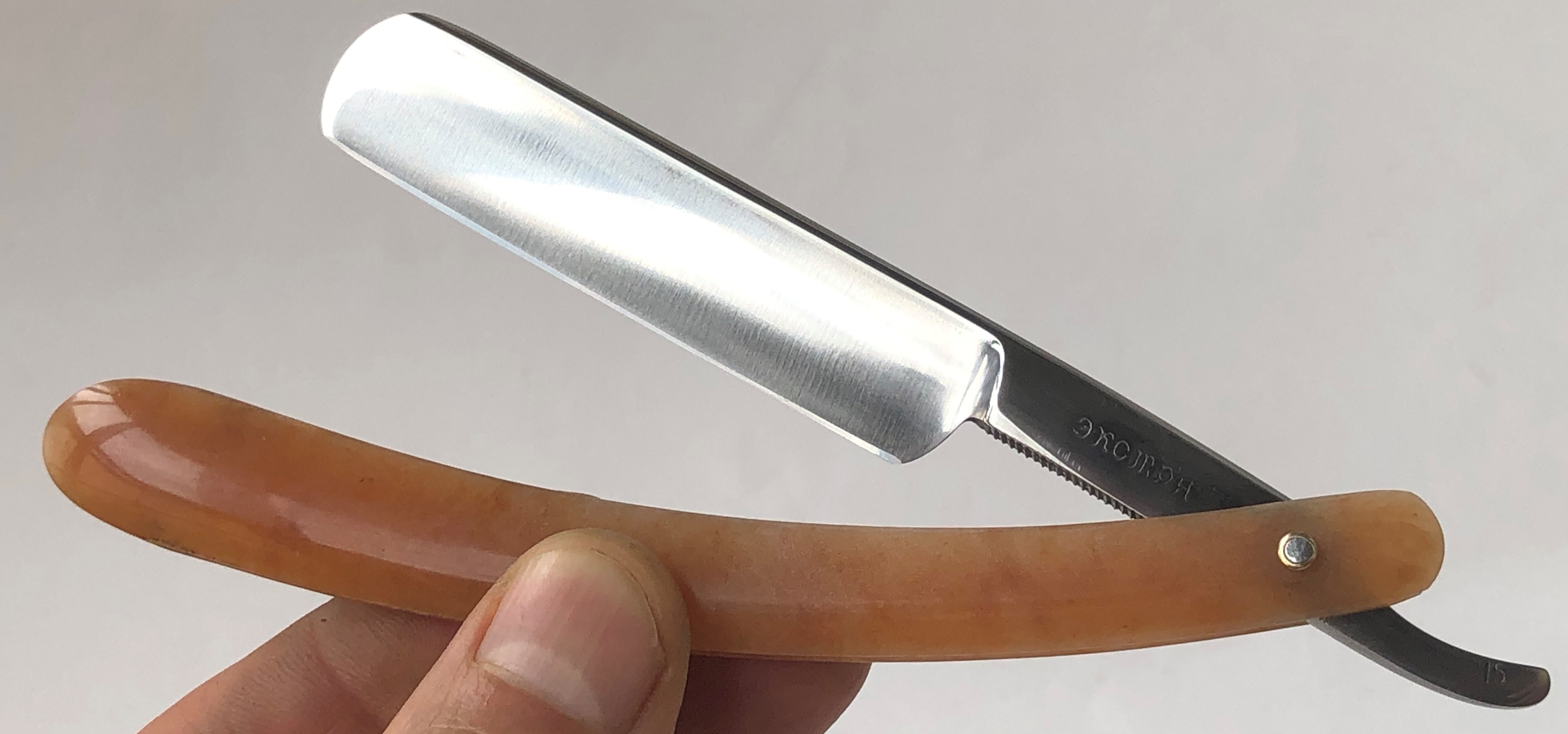 Сохранил благородный налет патины на эрле, дабы сохранить аутентичный вид и подчеркнуть почтенный возраст бритвы.Сам клинок имеет идеальную геометрию, с тоненькой кромочкой по всей длине. Редко толстый обух для бритв этого бренда.Тяжёлая. За счет такого обушка есть возможность бриться, не выставляя угла атаки, а просто кладя бритву плашмя.Бритва среднего размера, но тяжёлая и верткая. Уверен, что опытный пользователь в полной мере оценит все преимущества такого инструмента.Красивая и редкая вещь. Заточена и лично протестирована. Бритье чистое, с неким металлическим отзвоном сбриваемой щетины. Умеренно агрессивная,впрочем как и большинство немцев.Не пропустите!