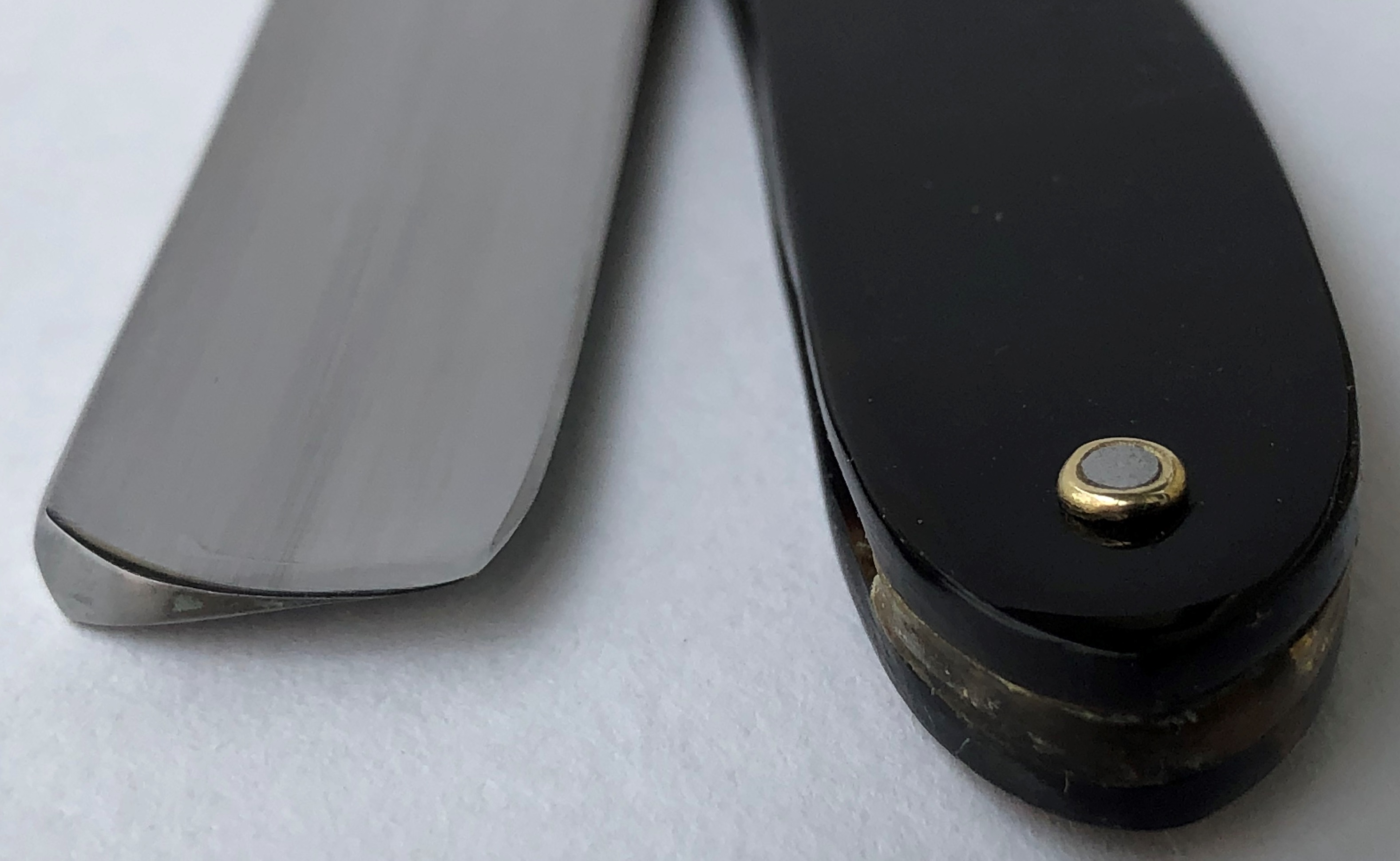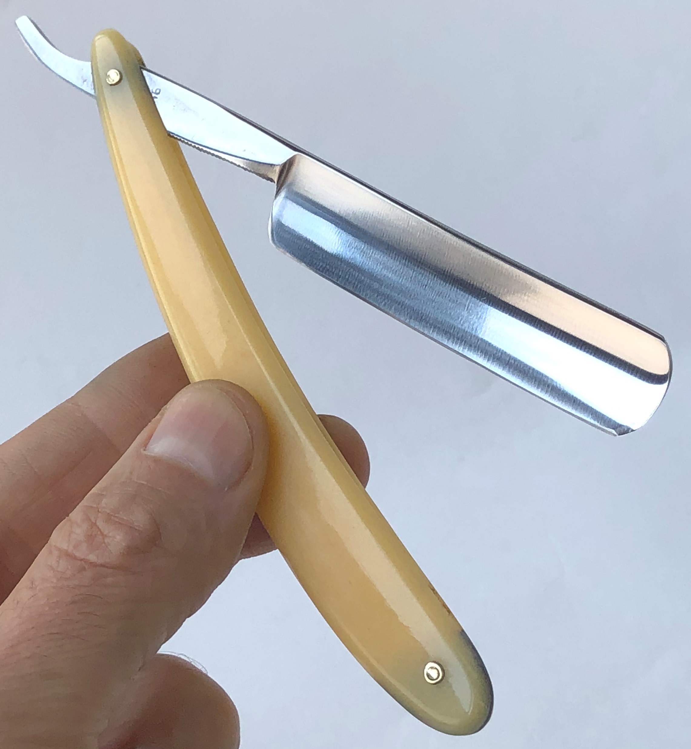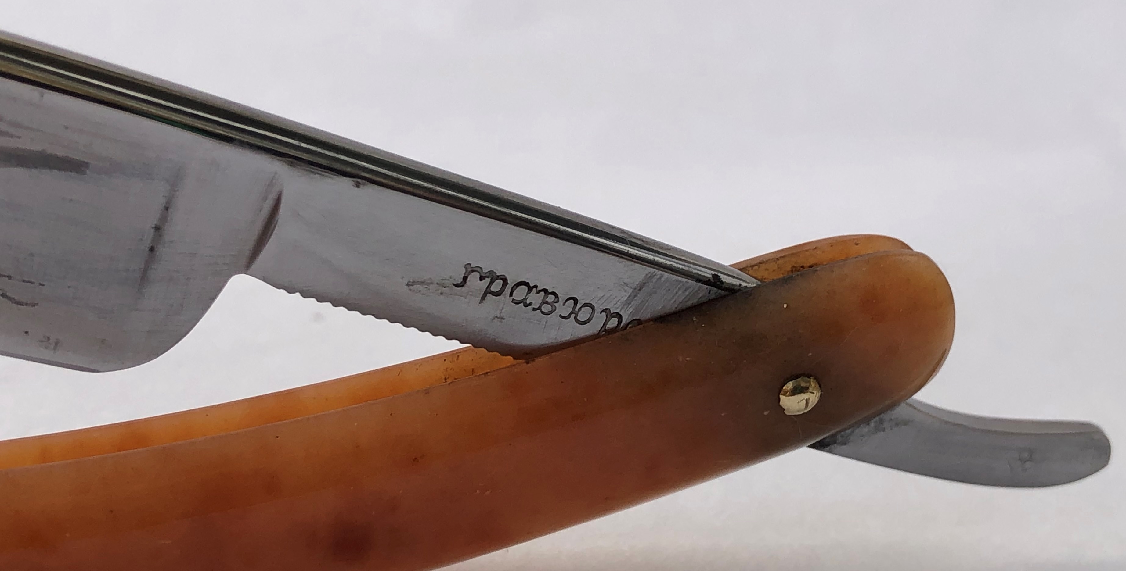 Ширина полотна-18.0 мм. Толщина обушка-5.0 мм. Полная вогнутость. Углеродистая сталь. Первая половина прошлого века. Привел в порядок старушку. Еще послужит долго.Перешлифовал и переполировал клинок. Замена пинов и внутренних шайб.Очень хорошее , рабочее состояние.Кромочка равномерна по всей длине. Красивая пластиковая ручка,"под черепаху".Удобная форма лезвия для новичка прежде всего, а также пойдет любому пользователю. Заточена и готова к бритью. Цена-9500 р с доставкой.ПРОДАН Spoiler Show