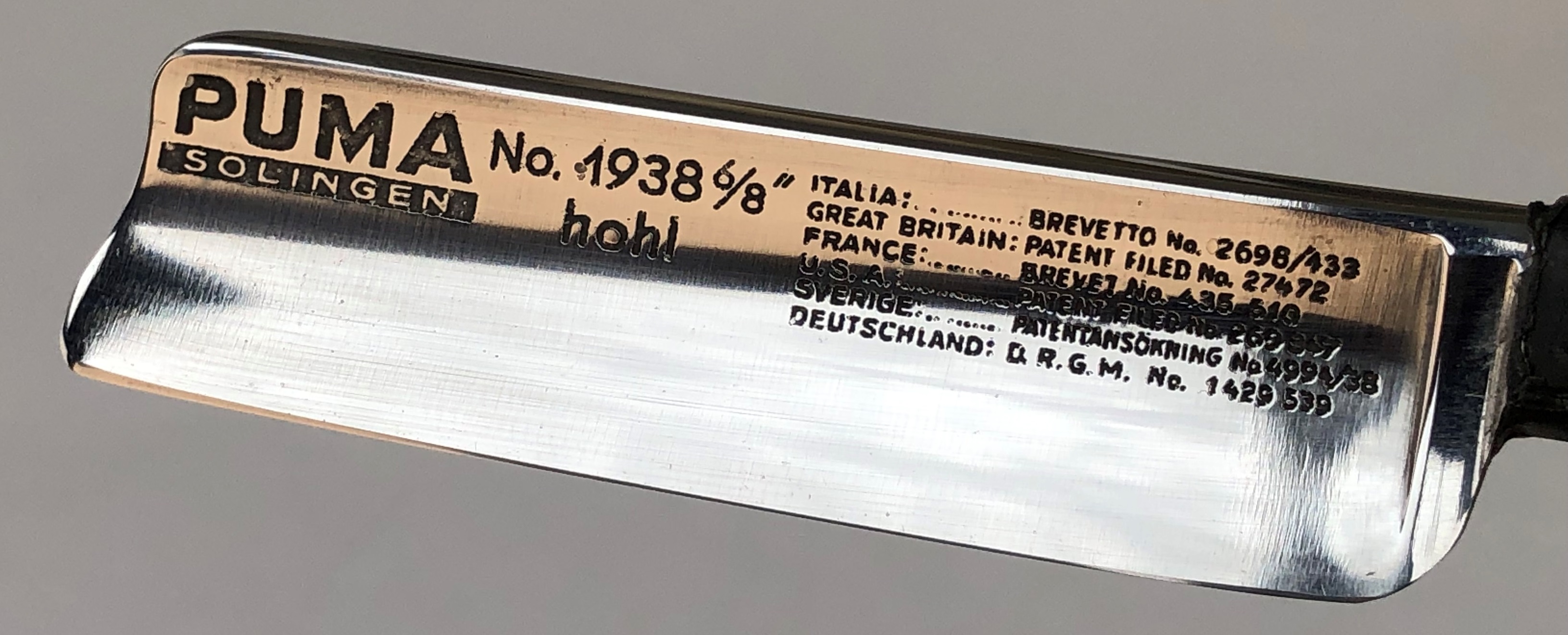 Ширина полотна-21.0 мм. Толщина обушка-5.5 мм. Полная вогнутость. Углеродистая сталь. Испанский носик. Самая топовая и редкая PUMA из всей линейки бритв этой известной фирмы. Без активных следов пользования.Возможно просто была один раз заточена и все.Заводская шлифовка полотна лезвия.Была разобрана, для удаления следов окисления металла, в районе осевого пина.Родные пины были перебраны и заново установлены.Оригинальная резинка в хорошем состоянии и еще послужит довольно долго. Была проклеена для надёжности.Под осевой были добавлены внутренние шайбы.Идеальная геометрия полотна:кромочка равномерна по всей длине и еле заметна. Фирменный бакелитовый кейс в комплекте! Бритва заточена и лично протестирована. Все на очень высоком уровне, чем в принципе и известны эти бритвы. Цена-45500 р с доставкой.b]ПРОДАН[/b] Spoiler Show