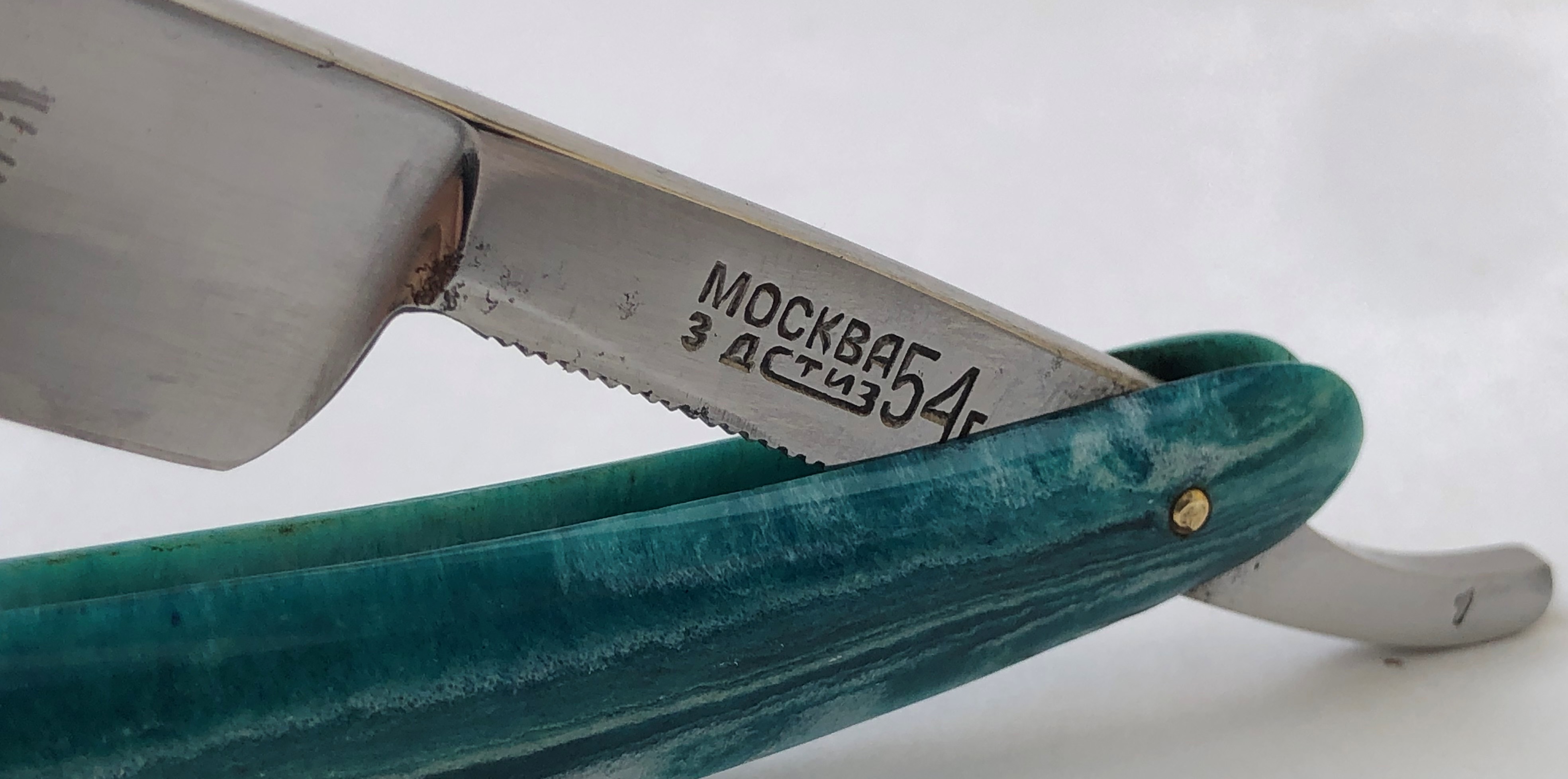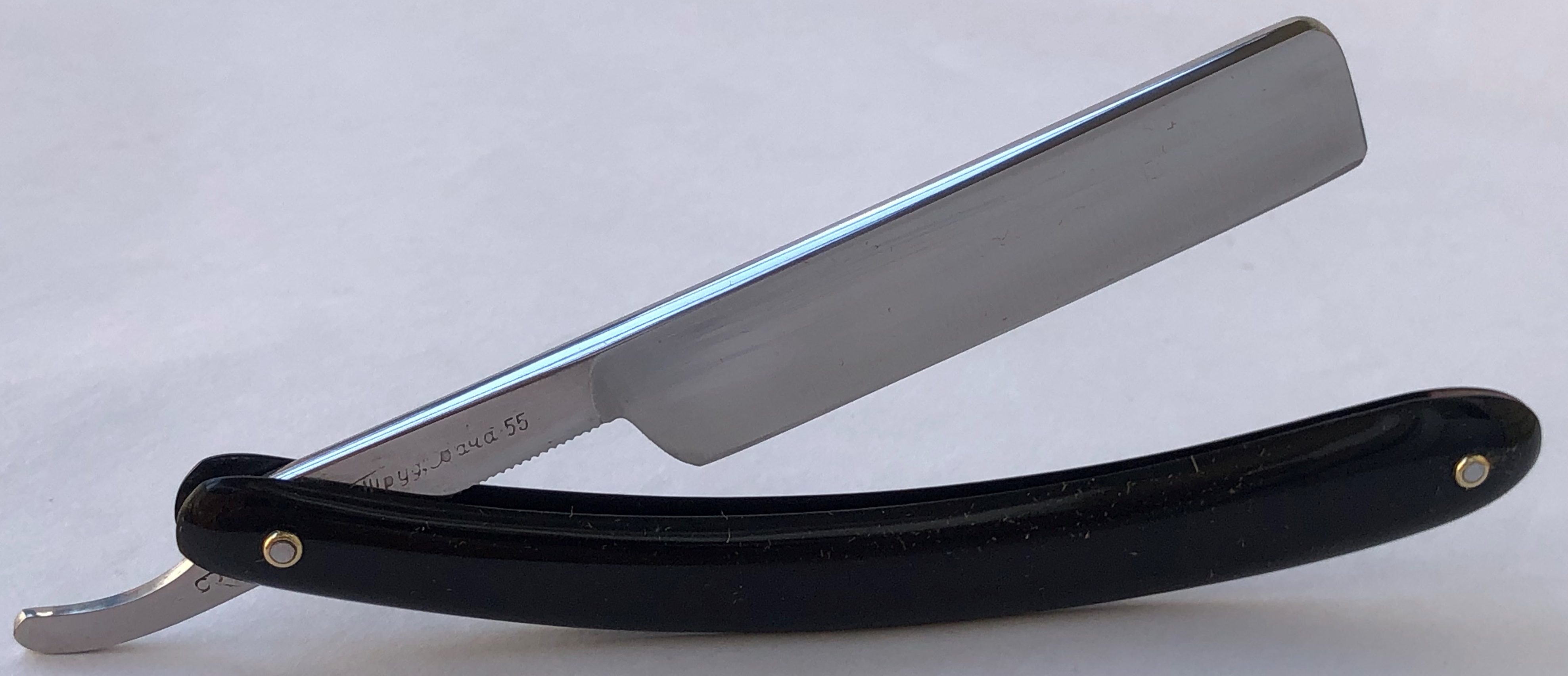 Ширина полотна-18.0 мм. Толщина обушка-5.0 мм. Полная вогнутость. Углеродистая сталь. Первая половина прошлого века. Привел в порядок старушку. Еще послужит долго.Перешлифовал и переполировал клинок. Замена пинов и внутренних шайб.Очень хорошее , рабочее состояние.Кромочка равномерна по всей длине. Красивая пластиковая ручка,"под черепаху".Удобная форма лезвия для новичка прежде всего, а также пойдет любому пользователю. Заточена и готова к бритью. Цена-9500 р с доставкой.ПРОДАН Spoiler Show