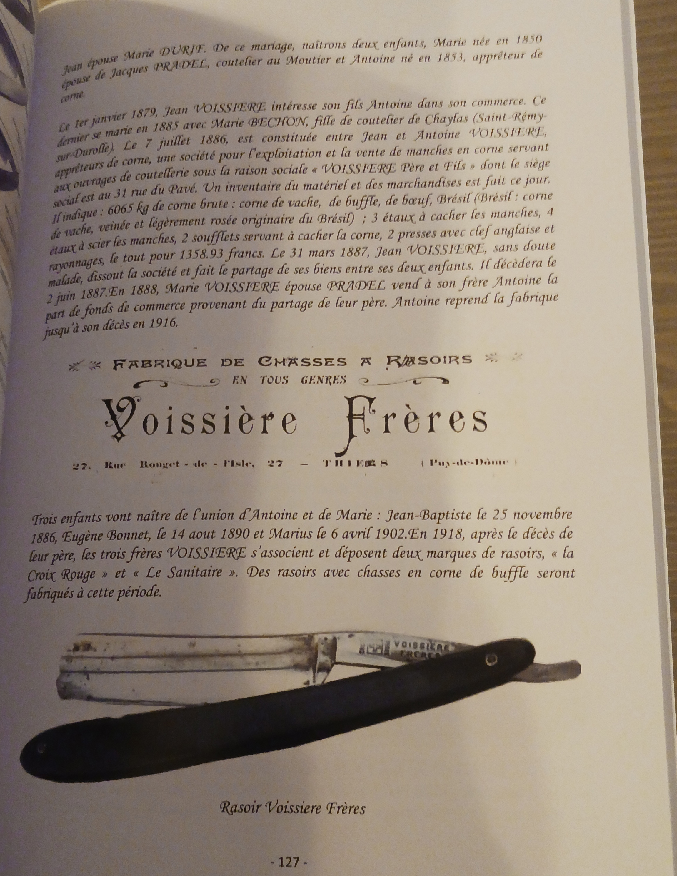 Авторы: Алекс Делэд Андре Моран Никакой мужчина не может быть по настоящему счастлив пока не постигнет умения хорошо выбриться. Жан Вуассьер (1754 - 1834) первый мастер ножевого дела женился с Жениз Буш. Семь детей родятся от этой четы, и Жильбер, рожденный в 1794, ножевик, проживал на улице Pave (Сейчас улица Rouget de l'Isle). Берет в жены Анну Лаграндж и у них три ребенка, в числе которых Жан (1818-1887), заготовщик роговой оправы на улице Pave (Подготавливал и преобразовывал рог для использования ручек и оправ) Жан берет в жены Мари Дюриф. От брака родятся дву ребенка. Мари, рожденная в 1850 выйдет замуж за Жака Прадель (Pradel), кузнеца в Мутье. Антуар, рожденный в 1853, заготовщик рога. 1 января 1879 года Жан Вуассьер (Voissiere) заинтересовал своего сына Антуана своим делом и коммерцией. И вот сын женится в 1885 с Мари Бешон, с кузнецом Chaylas (Saint-Remy-sur-Durolle). 7 июля 1886 Жан и Антуан образовали общество по использованию и продаже оправ из рога для кованных изделий под маркой "Voissiere Отец и сыновья" с офисом по адресу улица Pave 31. Справочник товаров и продаж возник в этот день. В нем указано 6065 кг необработанного рога : коровий, буйвола, быка, бразильский рог (рог коровы с рисунком и розовым оттенком) (Далее перечислены другие товары обработки рога ..., пресс для рога и прочее) 31 марта 1887 года, Жан Вуассьер, заболевает и покидает общество и делит свою часть общества между своими двумя детьми. Он умер 2 июня 1887. В 1888 Мари Вуассьер выходит замуж за Жака Pradel и продает брату Антуану часть общества от наследства их отца. Антуан ведет дело фабрики до самой смерти в 1916. Три ребенка родились от брака Антуара и Мари. Жан-Батист, рожденный 25 ноября 1886 года. Эжен Бнне, 14 августа 1890 года. Мариус 6 апреля 1902 года. В 1918, после смерти их отца, три брата Вуассьер присоединяются к производству и выпускают две марки бритв: "Красный крест" и "Санитар". Бритвы с оправой из рога буйвола будут устанавливаться на бритвы этой эпохи. Братья расходятся в 1925 году и каждый создает свое отдельное общество. Батист, старший сын, уже обладает магазином и домом с номером 23 и 25 на улице Rouget de L'Isle берет в жены Марту Arthaud. У них не будет потомства. Расположение его ателье представлено звездой в музее ножевого дела. Он будет производить оправы до 1958 года. Фабрика Voissiere-Artaud. Эжен, младше, живет с женой Мари Vallard рядом по адресу 35 Roget de L'Isle. Эжен изготавливает оправы, но особенно ручки складных ножей с инкрустацией из металла. Фабрика Voissiere Eugene. У этой пары два ребенка родятся: Roget (1922 1951) создатель бритв. В 1946 он выпускает марку бритв "2229 Veritable Voissiere". Рекламный лозунг его бритвы был очень эффектным: "Чтобы быть красивым и гордым, используйте бритву Вуассьер, которая используется, пока ей пользуются" (Игра слов и звуков, благоприятных на французском языке). Он умирает 7 февраля 1951 года в результате автомобильного происшествия в возрасте двадцати девяти лет. Мариус, младший, женится на Клавдии Angely. Их дом и мастерская находятся по адресу 27 и 29 на улице Rouget de L'Isle. Он изготавливает многослойные пластины для ружей.