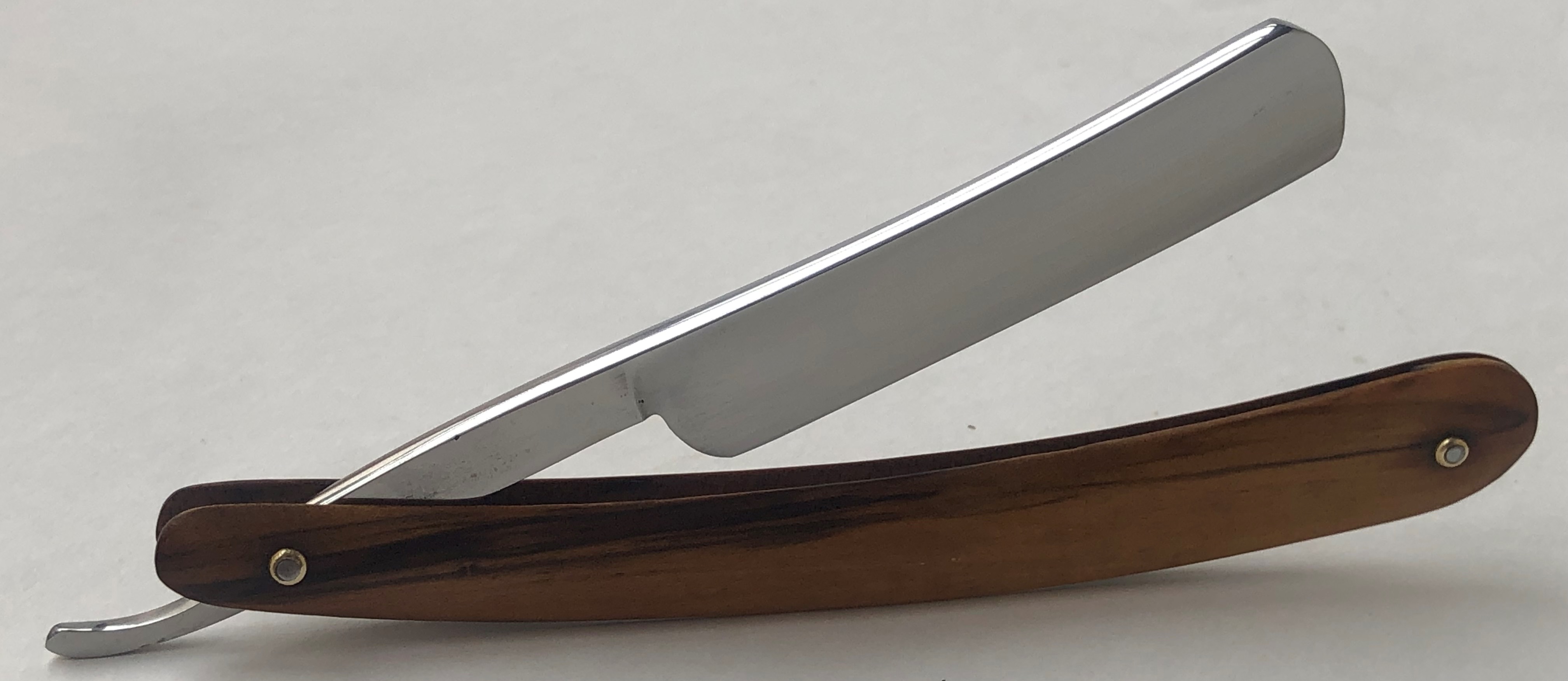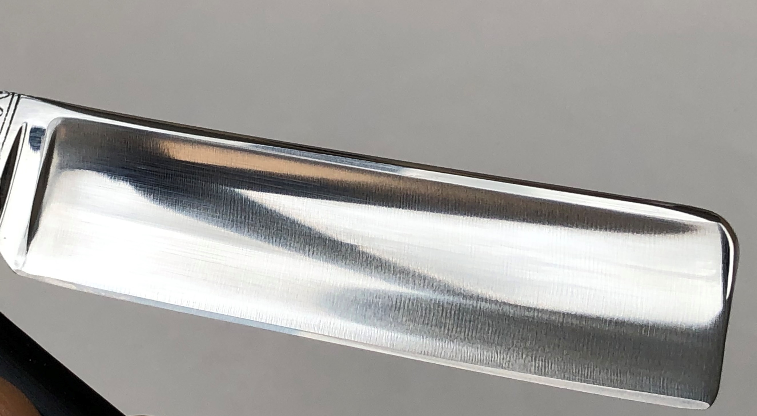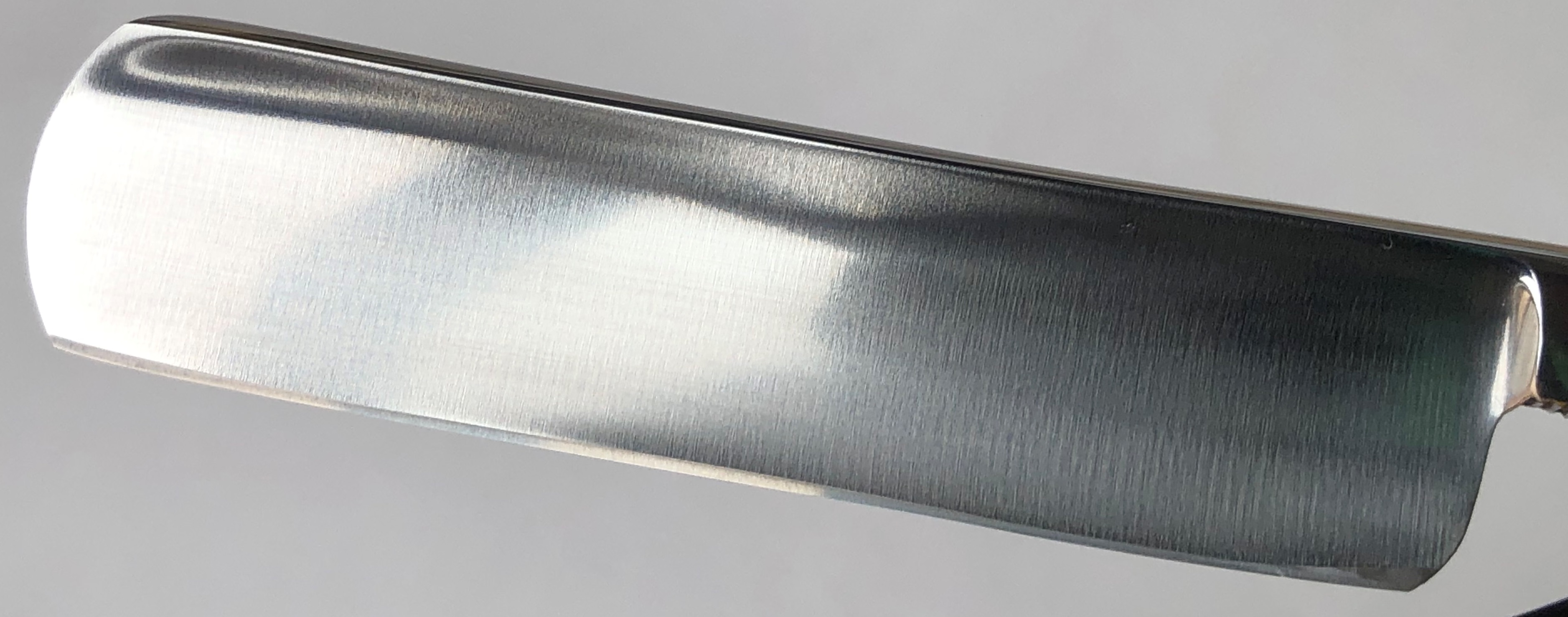 Ширина полотна-20.0 мм. Толщина обушка=5.8 мм. Полная вогнутость. Углеродистая сталь. Судя по всему это начало прошлого века. Клинок имел остатки старой сломанной оправы, с надписью "solingen".Сам клинок находится в очень приличном и аккуратно пользованном состоянии.Полотно было почищено(без регринда) и умеренно отполировано. Идеальная геометрия:кромочка равномерна по всей длине.Не долго думая,раскопал старую ,мощную немецкую ручку "под черепаху", от Бисмарка.Немного неестественно смотрится толстенный эрль относительно плашек ручки, но в общем и целом бритва получилась неплохой, особенно с клинком из высококачественной стали.Бритва достаточно крупная , с удобным хватом.Заточена и готова к бритью. Цена-10500 р с доставкой.ПРОДАН Spoiler Show