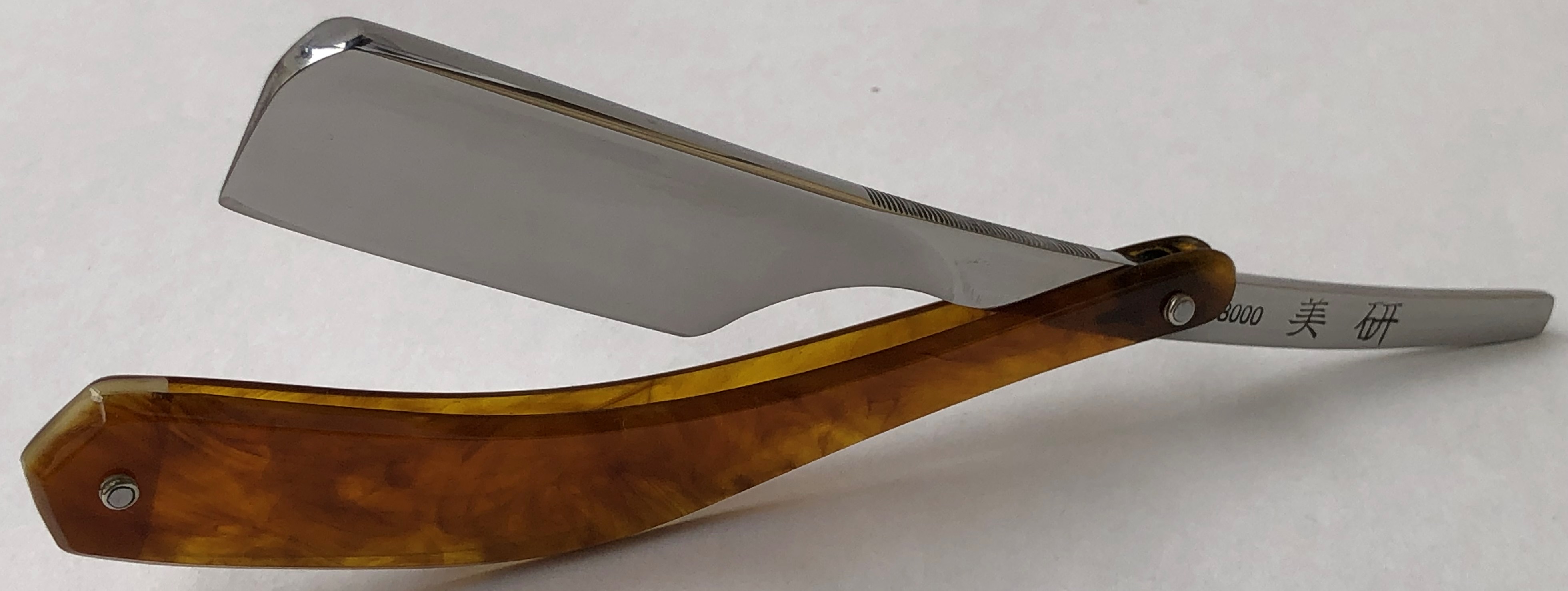 Большинство подобных бритв выпускались известной японской фирмой Хошитомбо, но вот такую "звезду" вижу второй раз, хотя думаю, что она тоже имеет какое то отношение к Хошитомбо. Ширина полотна-21.0 мм. Толщина обушка-6.2 мм. Длина РК-50.0 мм. Примерно 50-60- е годы прошлого века. Клинок без следов пользования! Никакого регринда.Оригинальная форма лезвия.Бритва была разобрана и немного освежено полотно.Оригинальные пины удалось поставить обратно. Тяжелая бритва.За счет длинного хвостовика очень удобный хват во время процесса брития.Сталь тут средней + твердости, так практически на всех японских клинах. Чистая, без видимых дефектов.Наверное новичку до такой бритвы еще нужно дорасти, а вот опытный пользователь в полной мере способен прочувствовать все достоинства такой самурая. Бритва заточена и лично протестирована. Не пропустите редкую вещь, с прекрасной сталью.. Цена-45500 р с доставкой. Внимание! Важная информация! Spoiler Show
