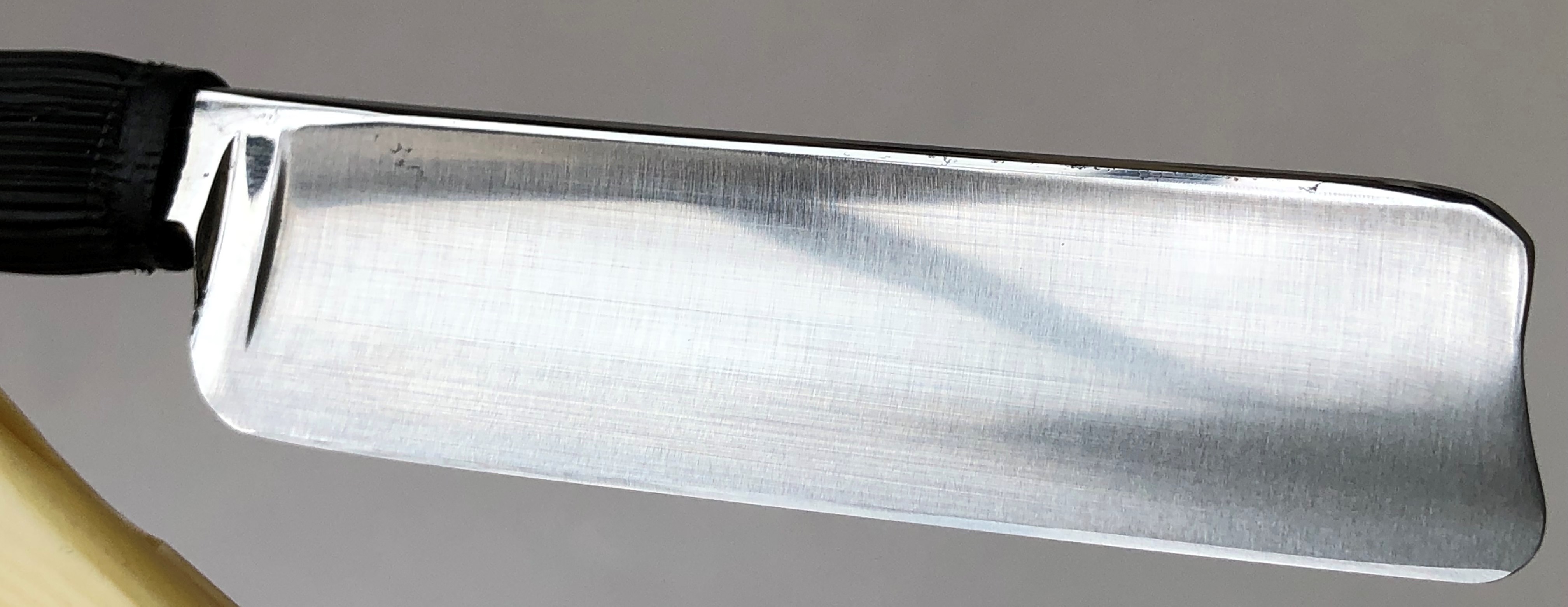 Ширина полотна-19.5 мм. Толщина обушка=6.2 мм. Форма лезвия-1/2 клин. Углеродистая сталь. Середина прошлого века. Бритва в хорошем , рабочем состоянии. Была разобрана, полотно приведено в порядок.Сталь чистая от видимых дефектов. Идеальная геометрия:кромочка равномерна по всей длине.Для тех, кто желает испробовать относительно недорогой японский полу-клин в деле. Бритва заточена и готова к бритью. Цена-10500 р с доставкой.ПРОДАН Spoiler Show