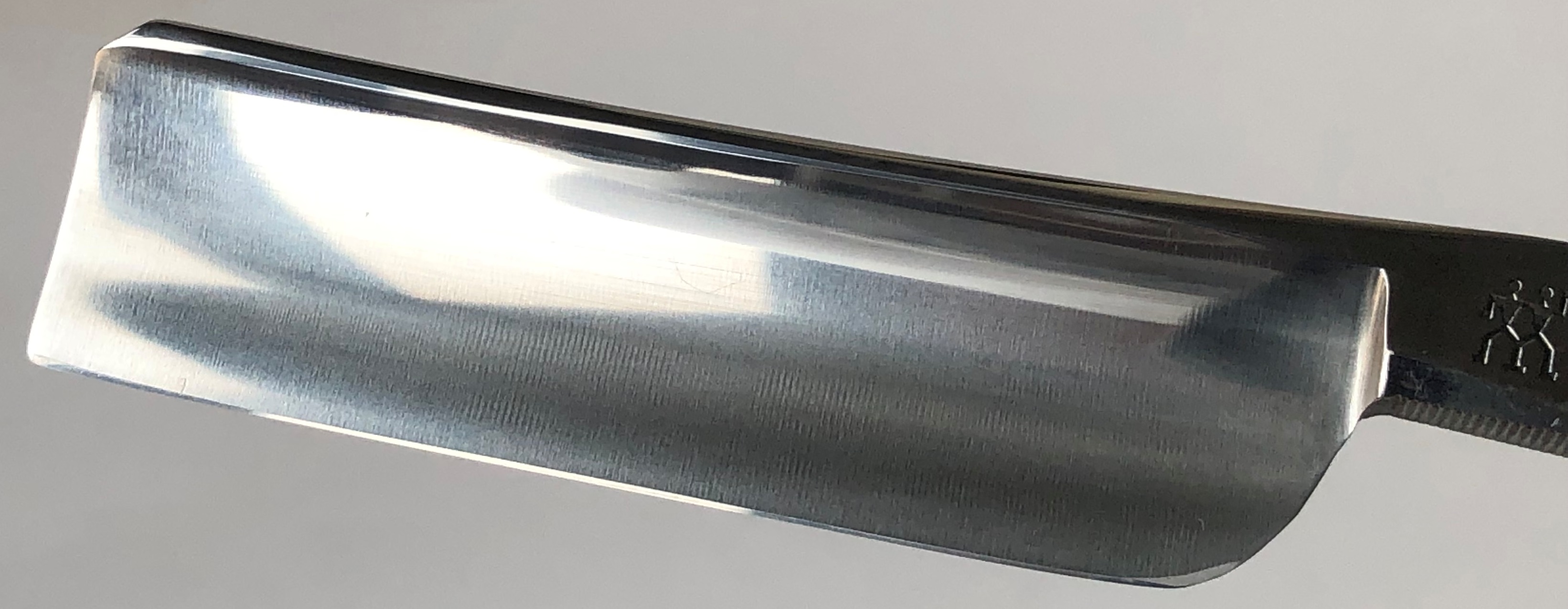 Бритва в пользовании не была, но необходимо было произвести минимальные, косметические работы.Идеальная геометрия полотна:кромочка равномерна по всей длине и еле заметна. (Трещина оправы в районе нижнего пина была намертво и надежно проклеена. Отшлифована и отполирована.Практически незаметно). Неестественная для традиционных японских евро бритв форма лезвия.Скорее похода на англичанку начала 20-го века. Что характерно, сталь (как мне показалось) несколько мягче, чем на обычных японцах. В связи с этим бритье очень напомнило именно бритье старинными английскими бритвами:приятный "шелест" сбриваемой щетины.Мягкое и комфортное бритье. Отличный вариант для новичка. Не пропустите!