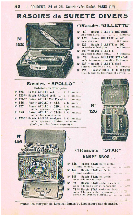 Эта продукция производилась не самим магазином, а для магазина специализированными компаниями. Что касается бритв, мы знаем, что больницы Тьера (Ле Грело), ​​Тьер-Иссар или Фонтениль поставляли большую часть качественных изделий, отмеченных их маркой. Некоторые предметы даже просто перепродавались под именем своего производителя.