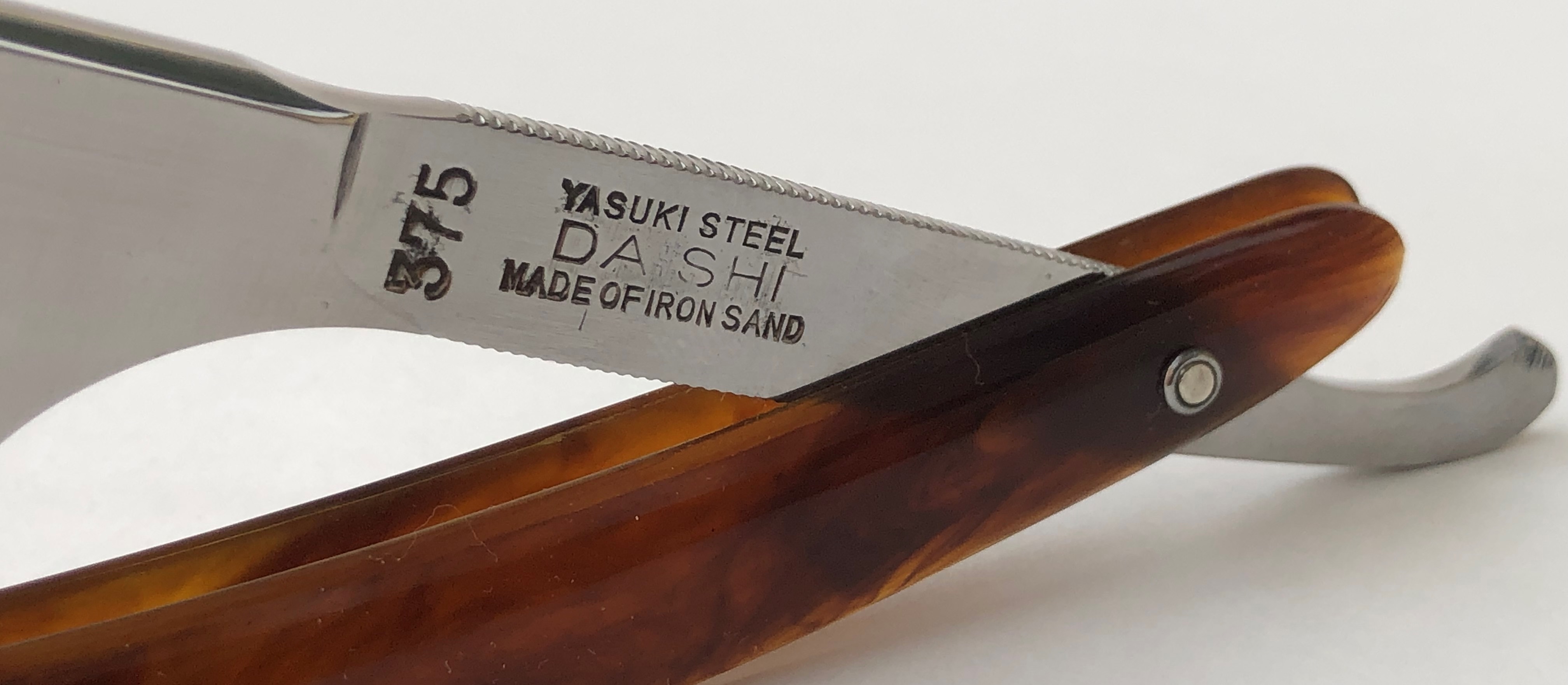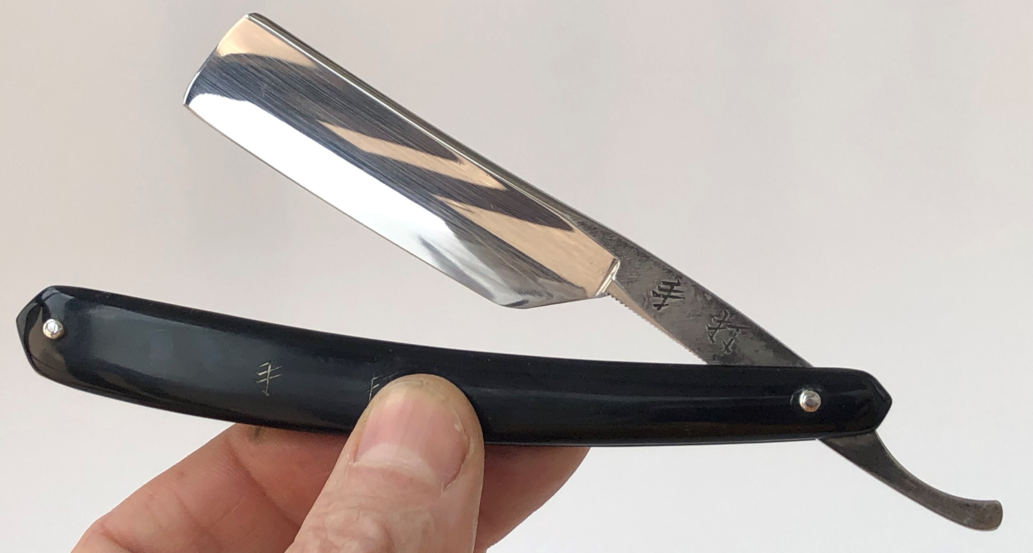 Шикарная и редкая коллекционная вещь. Одни из самых желанных японских бритв для любой коллекции, каждого разор-маньяка.Бритва в пользовании не была, но для порядка разобрал, чтобы удалить немного лишнего окисления в районе осевого пина, не стирая эффектное (родное) воронение эрля.Оригинальные пины были также перебраны и заново установлены, с добавлением еще по одной шайбе с каждой стороны, для усиления конструкции. Продольная ручная шлифовка камнями, по принципу шлифовки катан.Почти "зеркало"с элементами сатина.