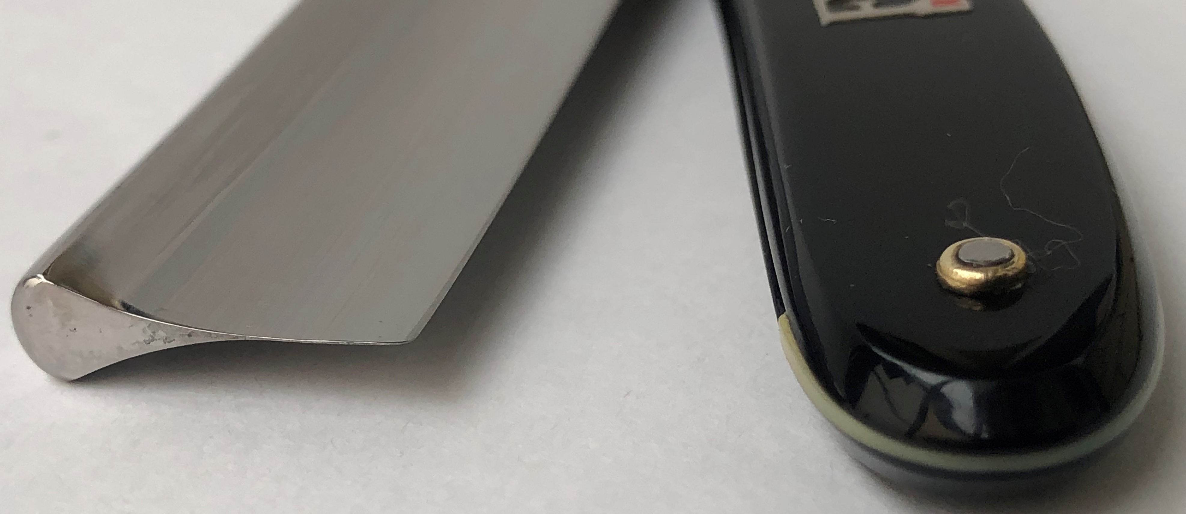Бритва в идеальном состоянии.Только отчистил от остатков масла с консервации. Ничего не разбиралось и не реставрировалось. Оригинальная шлифовка и полировка.Кромочка равномерна по всей длине и еле заметна.Сталь чистая, без видимых дефектов. (Не считая практически незаметных пятнашек у носика, от взаимодействия металла и платика оправы).Я не помню, чтобы мне попадалась SK-3 и шириной полотна в 22 мм. Крупная и тяжёлая. На некоторых 3-ках я не наблюдал фирменной "ступеньки" на полотне, как на бритвах 1-й и 2-ой модели.Тут эффектный "переход жесткости" имеется, так что все в норме.