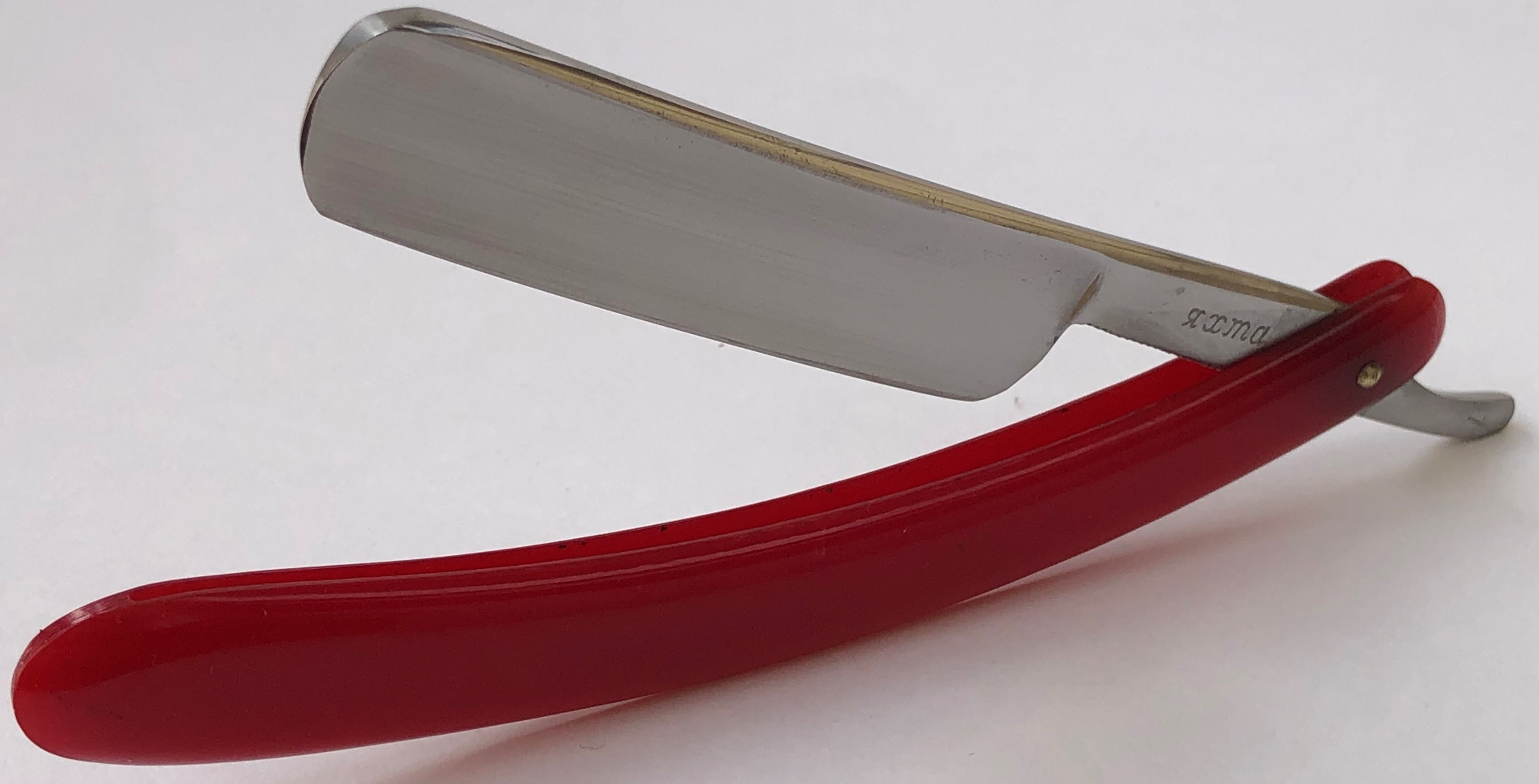 Не разбиралась и не ремонтировалась.Все в оригинале.Форма клинка представляет собой профиль обычной классической бритвы.Достаточно тяжёлая.Так как я сам не пользуюсь подобными инструментами, то ничего не могу сказать по самим лезвиям, продаются сейчас такие или нет. Но длине самого лезвия(39.0 мм)идентична длине обычного лезвия, которое можно разломить наполовину и использовать.Наверное на это тоже делался расчет, чтобы лезвия были взаимозаменяемыми.