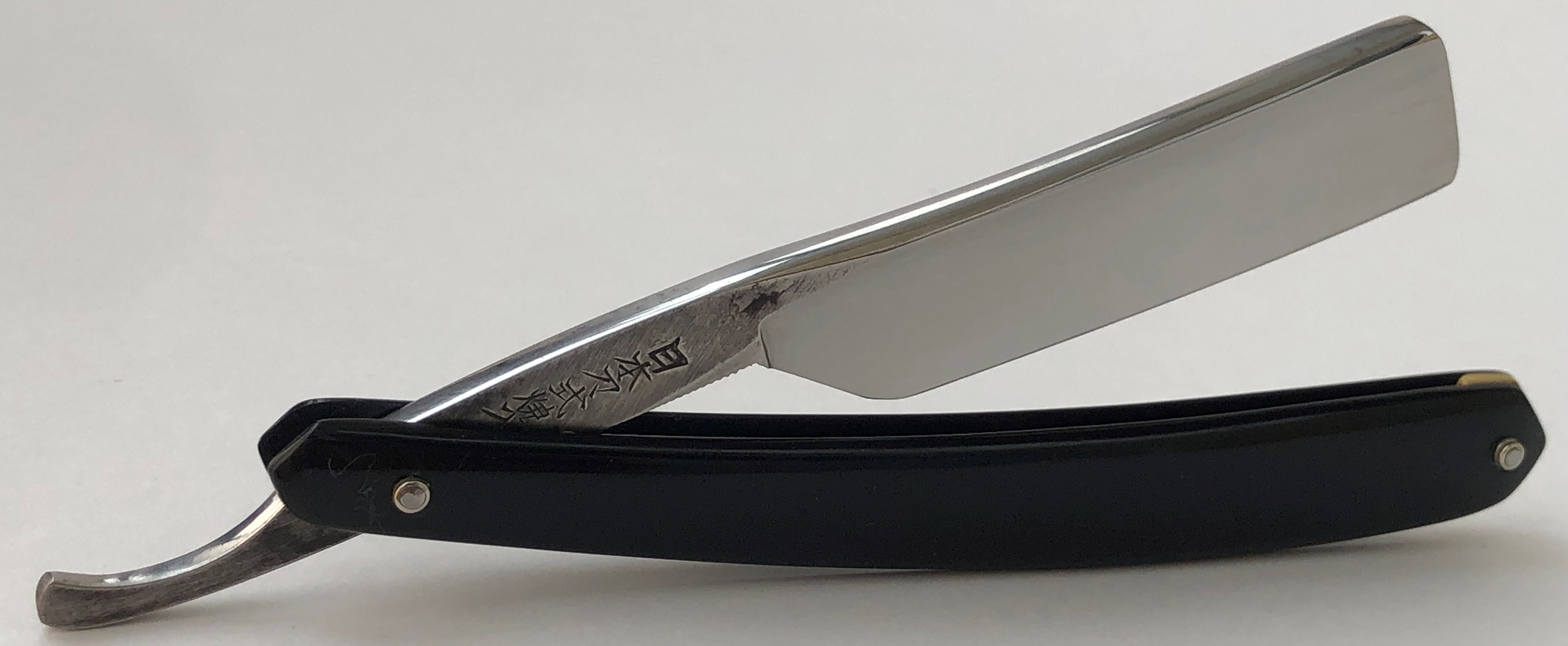 Шикарная и редкая коллекционная вещь. Одни из самых желанных японских бритв для любой коллекции, каждого разор-маньяка.Бритва в пользовании не была, но для порядка разобрал, чтобы удалить немного лишнего окисления в районе осевого пина, не стирая эффектное (родное) воронение эрля.Оригинальные пины были также перебраны и заново установлены, с добавлением еще по одной шайбе с каждой стороны, для усиления конструкции. Продольная ручная шлифовка камнями, по принципу шлифовки катан.Почти "зеркало"с элементами сатина.