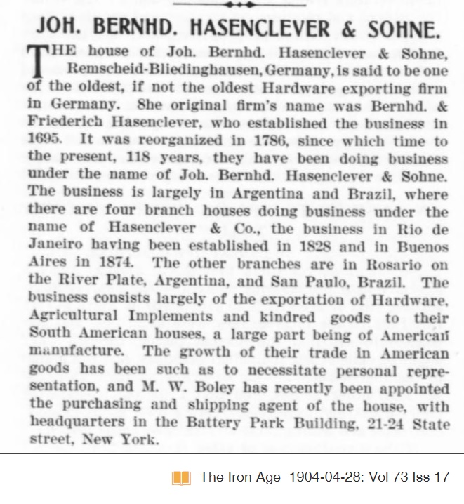 Бизнес в основном ведется в Аргентине и Бразилии, где есть четыре филиала, ведущих бизнес под названием Hasenclever & Co., бизнес в Рио-де-Жанейро был основан в 1828 году, а в Буэнос-Айресе - в 1874 году. Остальные филиалы находятся в Росарио на реке Ривер Плейт в Аргентине и в Сан-Паулу в Бразилии. Бизнес состоит в основном из экспорта скобяных изделий, сельскохозяйственных орудий и сопутствующих товаров в их южноамериканские дома, большая часть которых приходится на американское производство. Рост их торговли американскими товарами стал таким, что потребовалось личное представительство, и М. У. Боли недавно был назначен агентом по закупкам и доставке компании со штаб-квартирой в Бэттери-Парк-билдинг, Стейт-стрит, 21–24, Нью-Йорк. Spoiler Show Кто сейчас на конференцииСейчас этот форум просматривают: нет зарегистрированных пользователей и 2 гостя | |