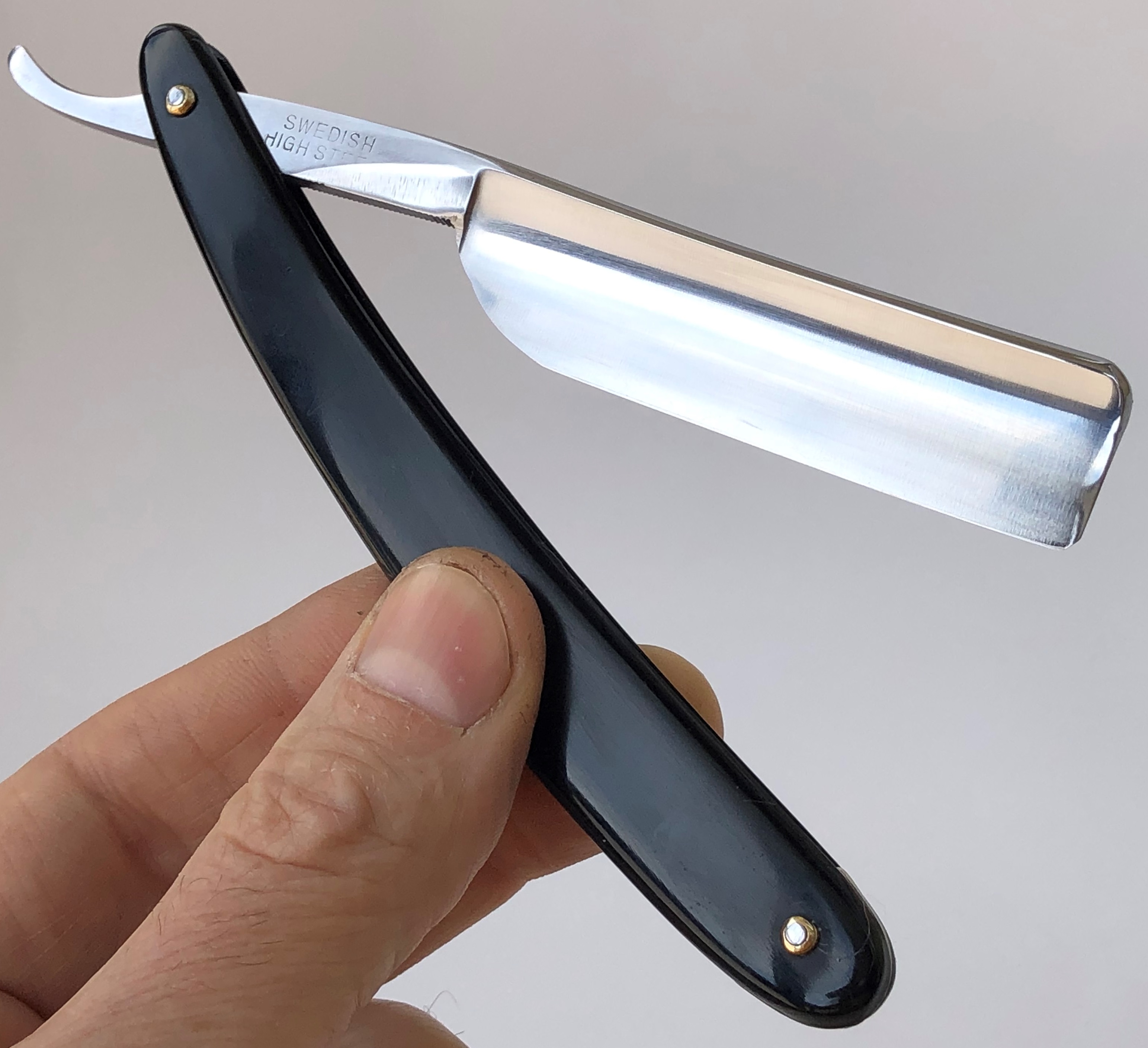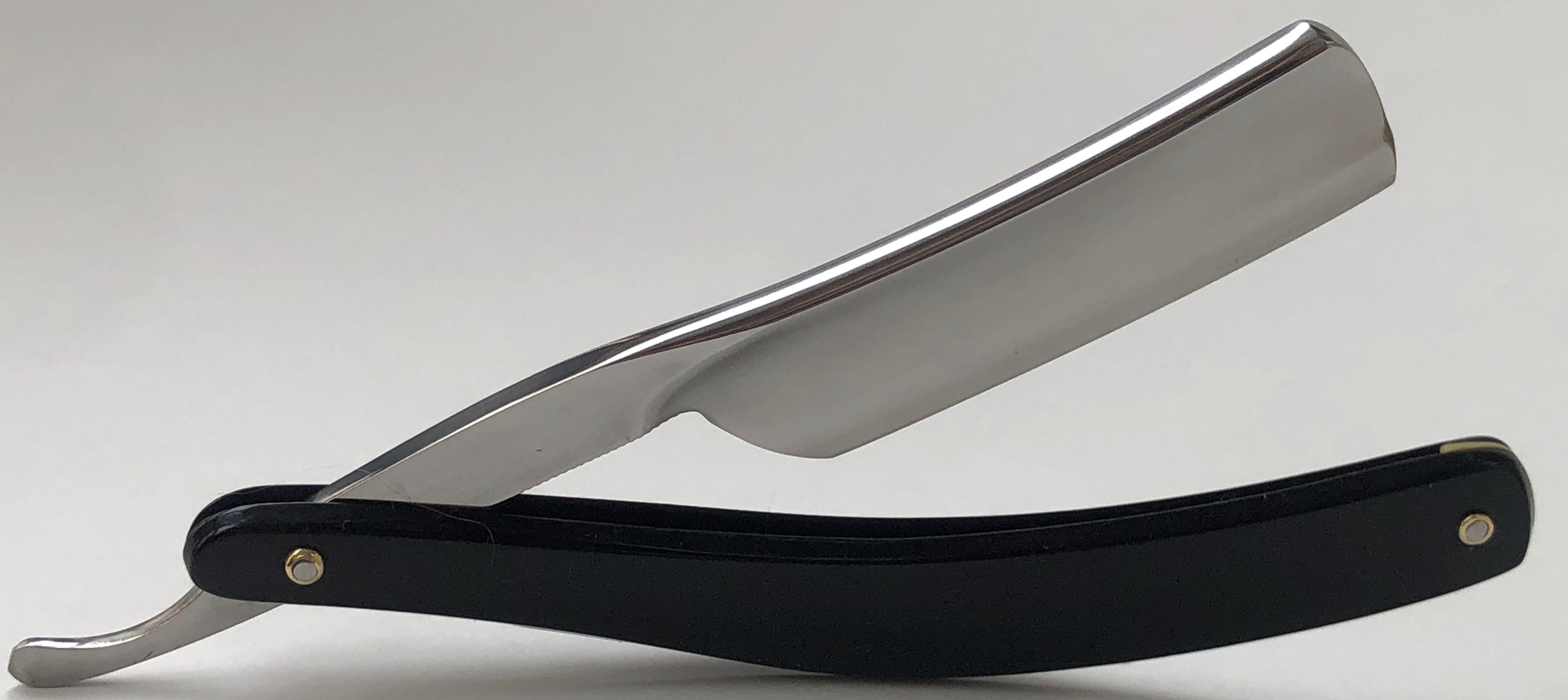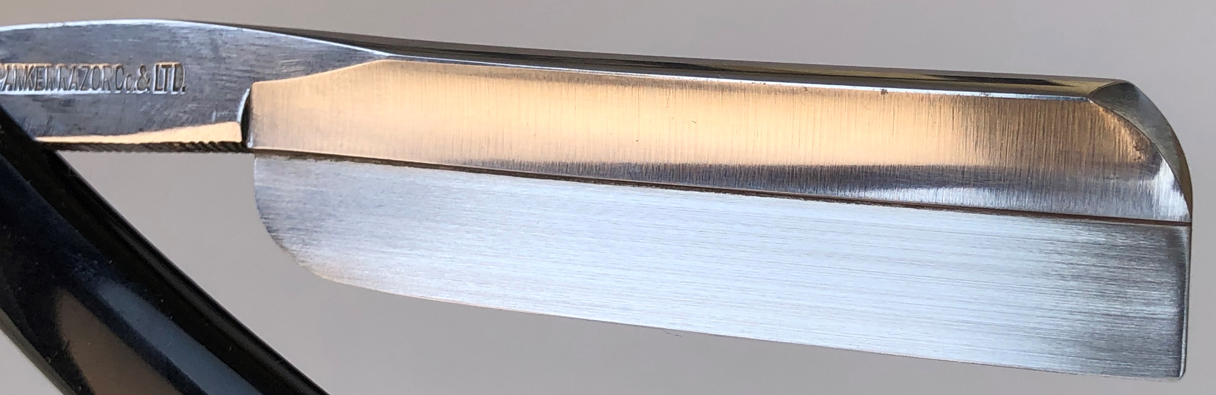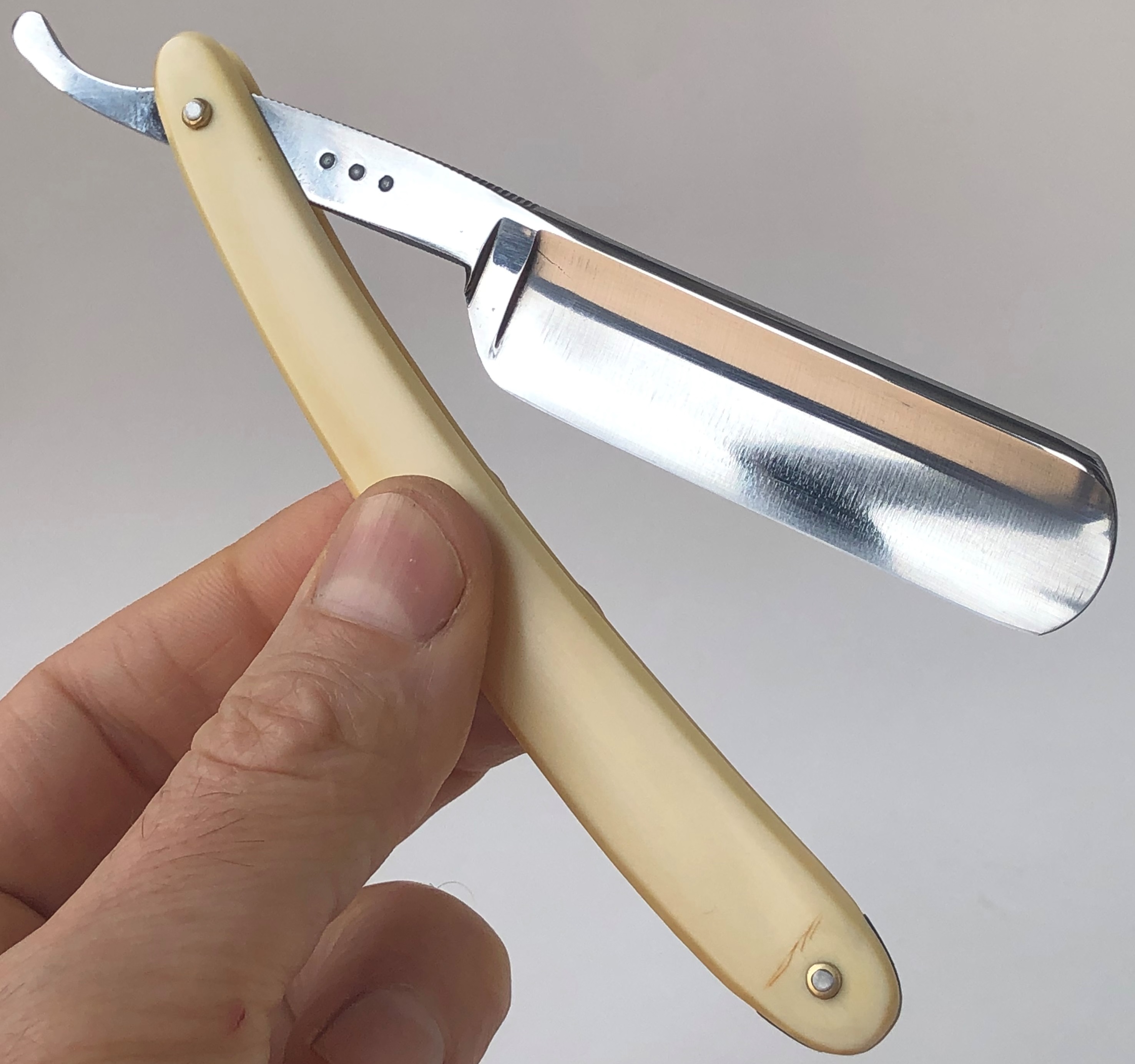 Далее уже мной сделана ручная шлифовка(до 10000 грит) и полировка.Практически в "зеркало".Остатки патины и каверн на эрле также оставил. Идеальная геометрия клинка:кромочка равномерна по всей длине и практически незаметна.Оригинальная, старинная оправа из натурального рога была отремонтирована и сейчас продолжит и далее радовать своего пользователя.Родные пины были заново переустановлены.Заточена и готова к бритью.