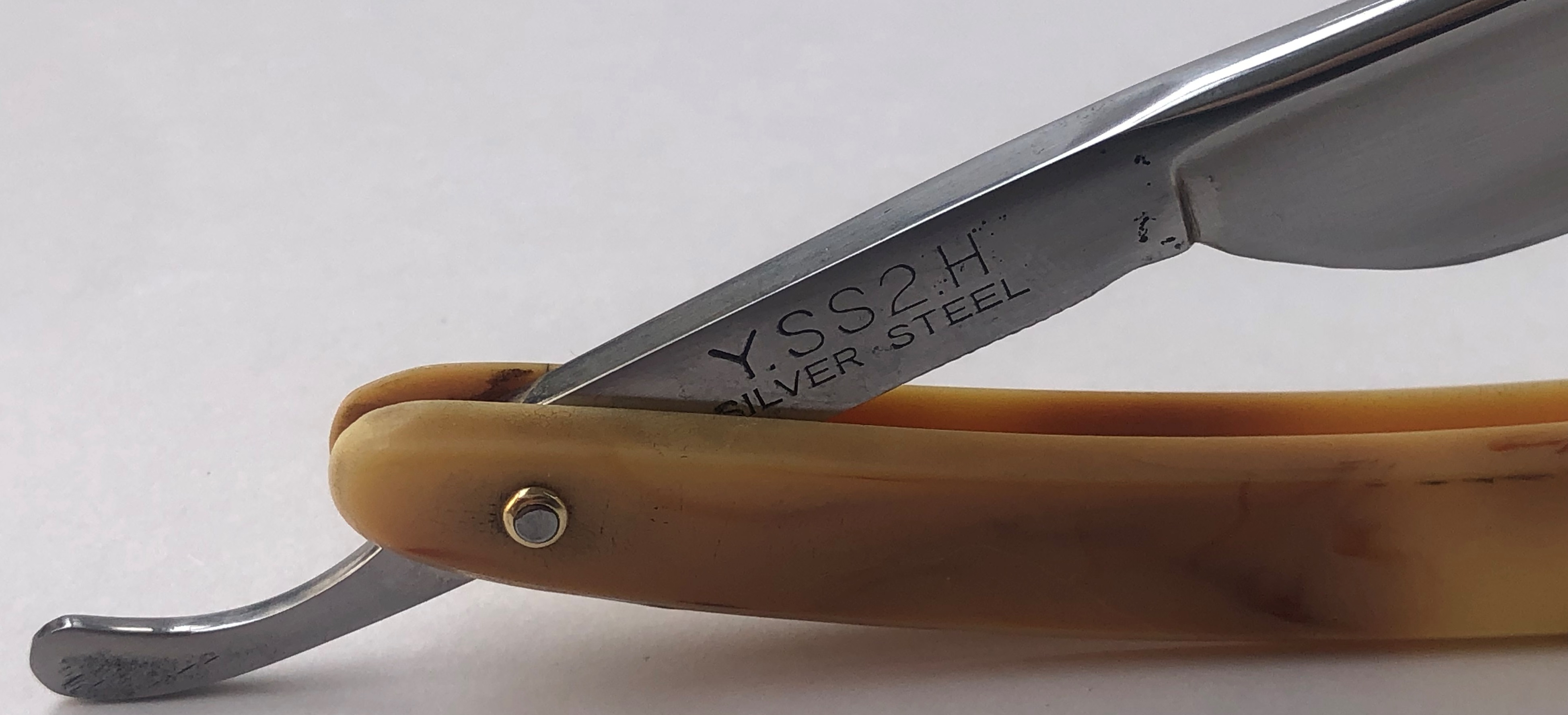 Бритва в состоянии приближенном в идеальному.Была разобрана, для удаления окисления в районе осевого пина, а также для добавления внутренних шайб.Оригинальная продольная шлифовка самого полотна.Умеренная полировка.Идеальная геометрия клинка:кромочка равномерна по всей длине и еле заметна.Родная оправа цвета белого перламутра также в очень хорошем состоянии, за исключением совсем небольшой и неглубокой микротрещинки,которая ни на что влиять не будет.Бритва заточена и готова к бритью.
