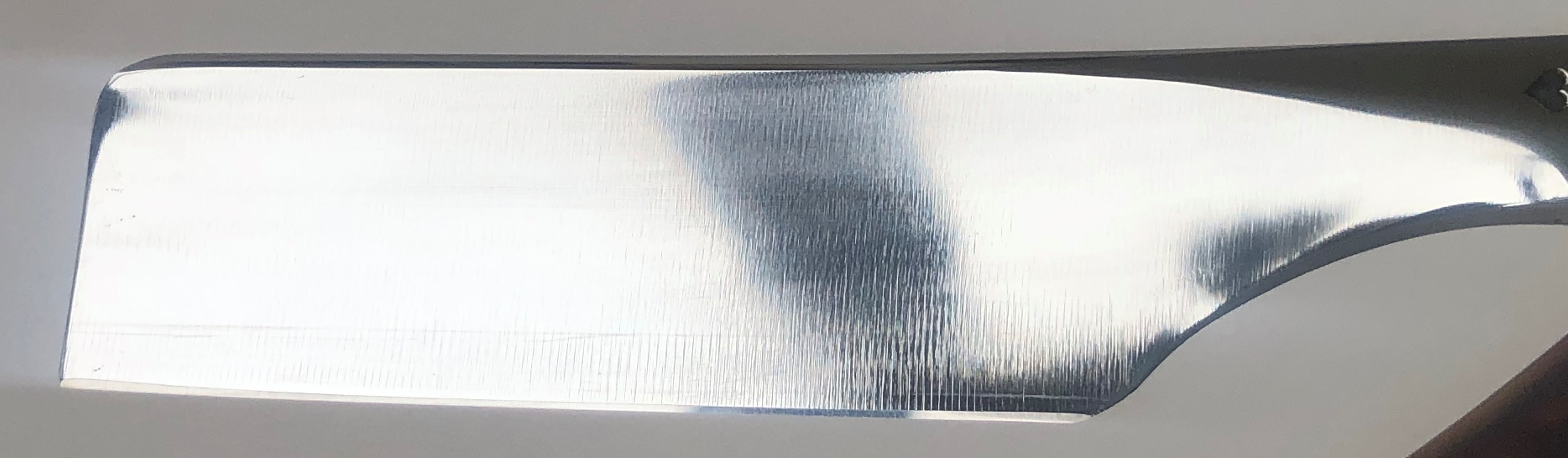 Далее уже мной сделана ручная шлифовка(до 10000 грит) и полировка.Практически в "зеркало".Остатки патины и каверн на эрле также оставил. Идеальная геометрия клинка:кромочка равномерна по всей длине и практически незаметна.Оригинальная, старинная оправа из натурального рога была отремонтирована и сейчас продолжит и далее радовать своего пользователя.Родные пины были заново переустановлены.Заточена и готова к бритью.