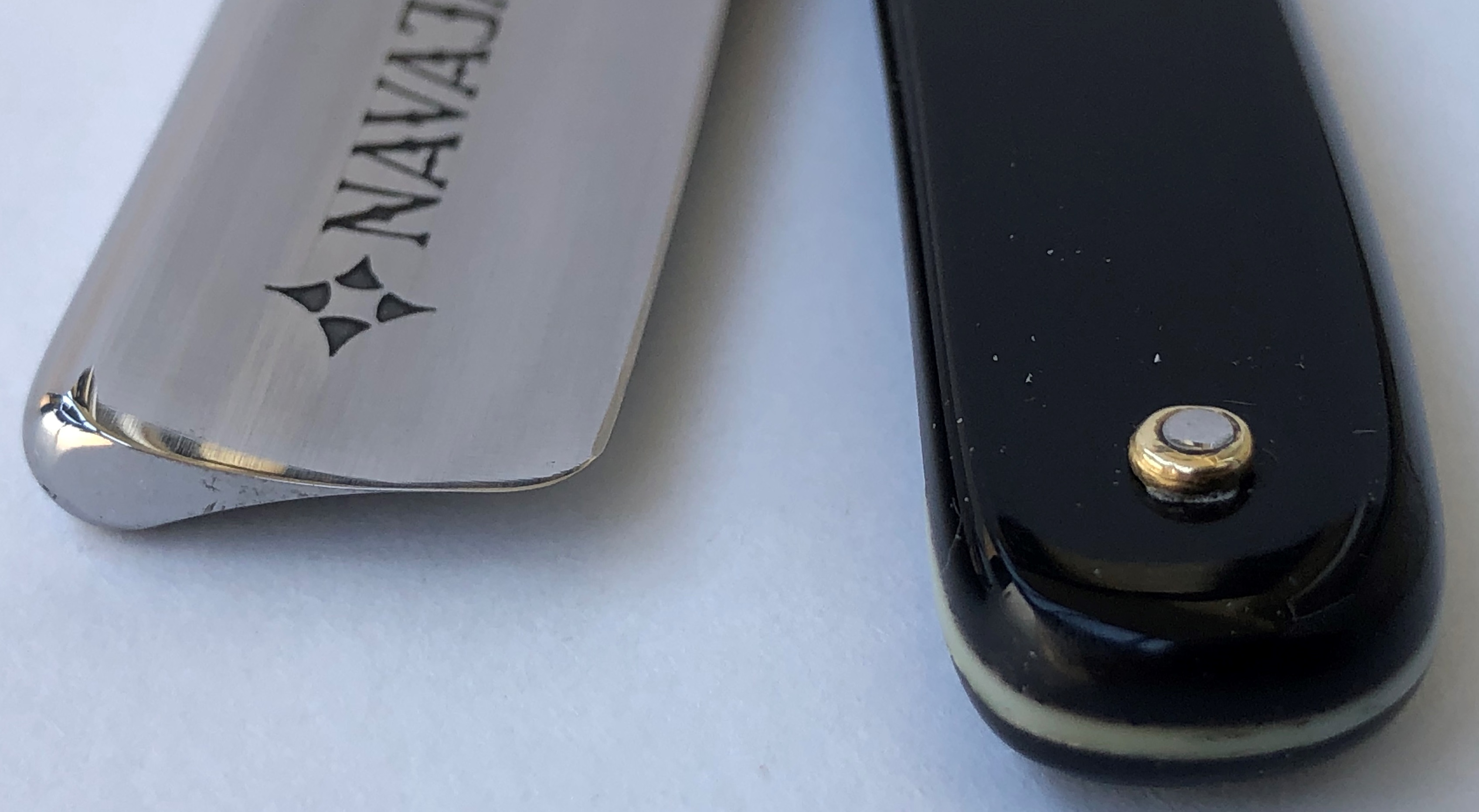 Ширина полотна-17.0 мм. Толщина обушка-4.3 мм. Длина РК-65.0 мм. Форма лезвия ближе к полу-клину. Углеродистая сталь. Барберский вырез. Скорее всего бритва первой половины прошлого века. Компактная и удобная во всех отношениях Ракушка, с прекрасной древней патиной на клинке,которую рука не поднялась вычищать.Поэтому только немного освежил металл полиролью и все.Оставил небольшую и аккуратную утОчку обушка,как дань преклонному возрасту бритвы.К тому же клинок имеет идеальную геометрию:кромочка равномерна по всей длине.Ручка сохранилась прекрасно. Немного полирнул ее тоже,после чего она снова заиграла прежними красками.. . Новые двух-цветные втулки и внутренние шайбы. В итоге получилась отличная Ракушка,совершенно недорогая, но с отличной сталью и,думаю,что в бритье тоже не должна разочаровать.. Да и просто красивая,старинная бритва, так что не пропустите! Заточена и готова к бритью. Цена-6550 р с доставкой.color=#FF0000]ПРОДАН [/color] Spoiler Show Spoiler Show