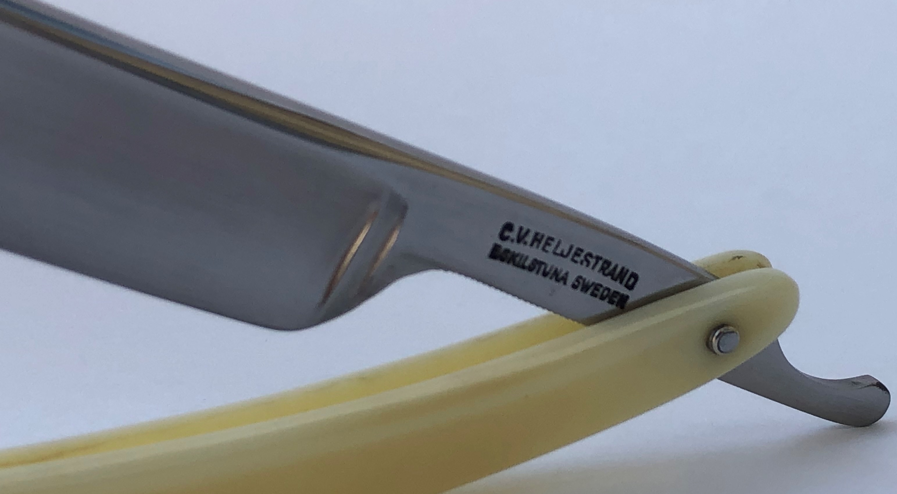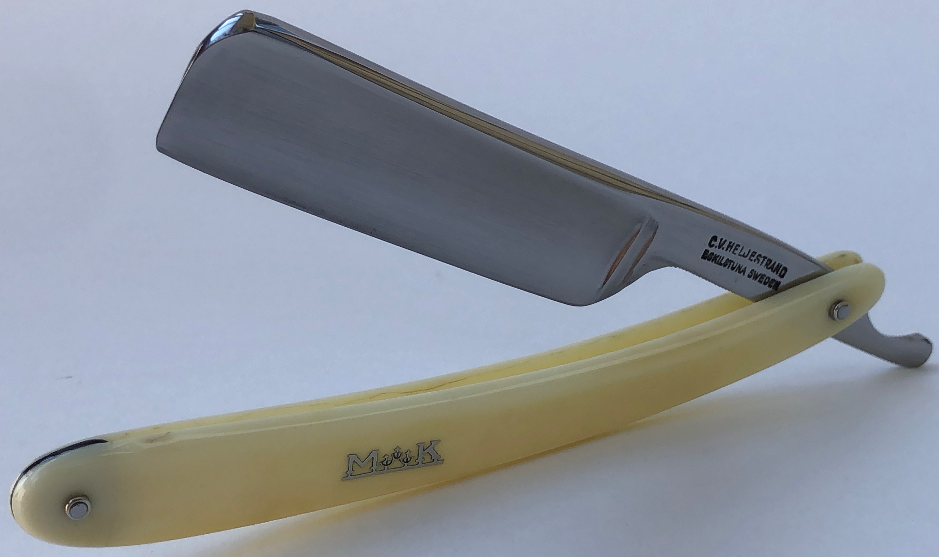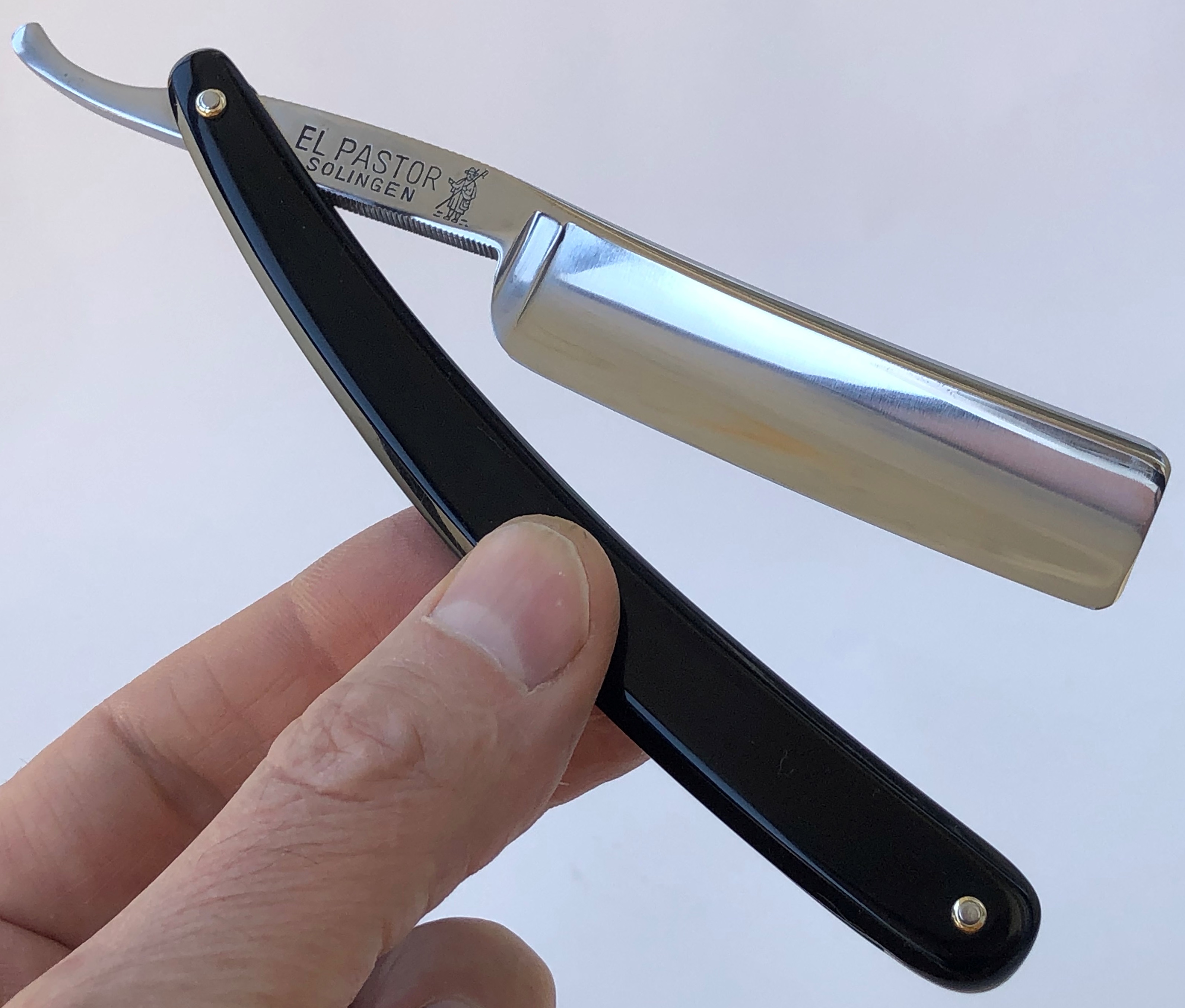 Ширина полотна-20.0 мм. Толщина обушка-6.0 мм. Форма лезвия-полная вогнутость. Углеродистая сталь. Бритва середины прошлого века. Добротный парикмахерский инструмент на все случаи жизни.Высококачественная шведская "звонкая" углеродка на клинке.Толстый обушок даёт возможность не выставлять угол атаки, а класть бритву по-барберски-плашмя на лицо и таким образом брить/бриться. Идеальная геометрия полотна:кромка равномерна по всей длине. Бритву немного освежил от древней патины и окисления,с минимальной шлифовкой и полировкой. Мощную и тяжёлую родную оправу решил все таки сохранить и небольшую трещинку хорошо пропаял с обеих сторон и залил эпоксидной смолой.( Думаю, что намертво).Но, в любом случае,на оправу будет распространяться гарантия. Мало ли что.. Новые внутренние шайбы и двух-цветные пины. В общем и целом,отличная профессиональная бритва, за вменяемые средства. Да, на последнем фото можно увидеть рекламу этой фирмы,с журнала для парикмахеров,1957 года.(каталог из личной коллекции). Бритва заточена и готова к бритью. Цена-11500 р с доставкой.ПРОДАН Внимание! Важная информация! Spoiler Show