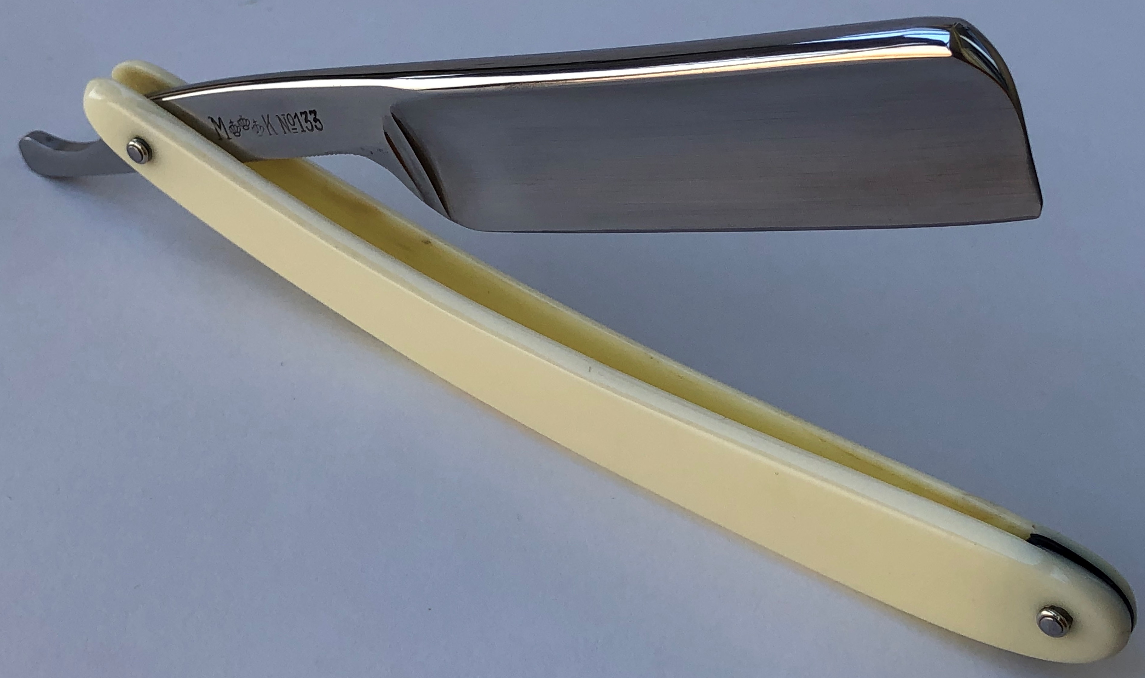 Ширина полотна-18.3 мм. Толщина обушка-4.5 мм. Полная вогнутость. Углеродистая сталь. Бритва совершенно новая и была заточена мной впервые. Ничего не разбиралось и не ремонтировалось.Только немного полирнул 80 летний клинок,чтобы немного вернуть ему былой блеск. Бритву сначала хотел оставить в своей коллекции,но посмотрел,что такая у меня уже есть,поэтому есть возможность стать обладателем достаточно редкой вещи "сталинского" времени.Идеальная геометрия полотна:кромочка равномерна по всей длине и еле заметна.Осевой пин немного подтянул,чтобы клинок не болтался,как обычно они болтаются на новых бритвах. Бритва заточена и готова к бритью. Не пропустите отличную коллекционную бритву ! Цена-12500 р с доставкой. Внимание! Важная информация! Spoiler Show