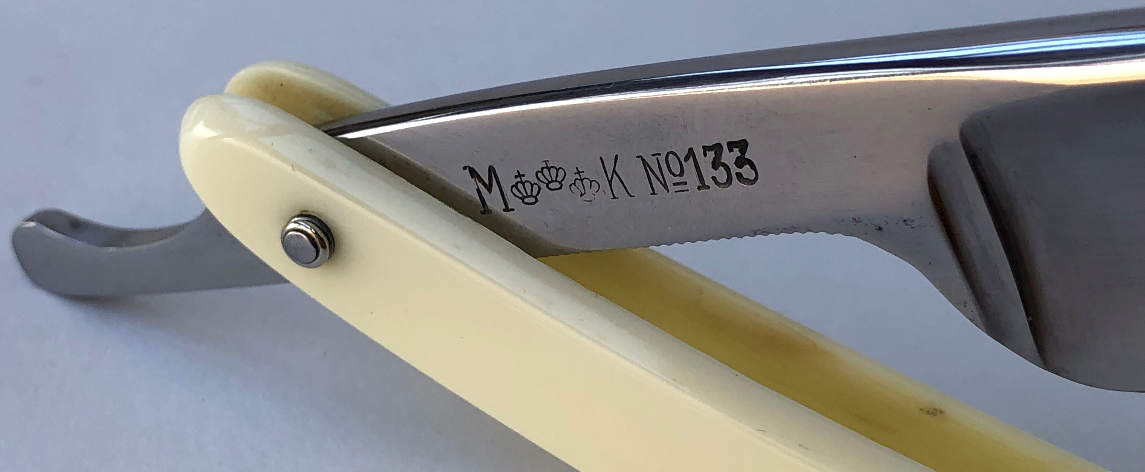 Ширина полотна-17.5 мм. Толщина обушка-4.5 мм. Форма лезвия ближе к полу-клину. Углеродистая сталь. Информации по производителю не нашел,но по косвенным признакам, а также исходя из своего опыта,могу сказать,что бритва начала 20-го века.Возможно была сделана на рубеже 19 и 20-х веков. Бритва в прекрасном состоянии и без видимых следов пользования. Скорее в пользовании не была,хотя за столько времени могло быть всё.. Бритву разобрал,немного освежил металл и заново собрал, с сохранением внутренних шайб и оригинальных пинов.Идеальная геометрия полотна:кромочка равномерна по всей длине и еле заметна.Барберский носик. Бритва заточена и готова к бритью.Была лично протестирована.Могу сказать, что в бритье тут классическая немка:своенравная,дерзкая, не прощающая ошибок. Но в тоже время всегда выполнена на самом высоком уровне,как все немецкое.. В итоге,чистое и комфортное бритье,с неким "металлическим" характером сбриваемой щетины. Можно где то сравнить с советскими Вачами и Росинструментами военного периода. Короче, отличная и недорогая старинная вещь. Не пропустите. Цена-9500 р с доставкой. Внимание! Важная информация! Spoiler Show