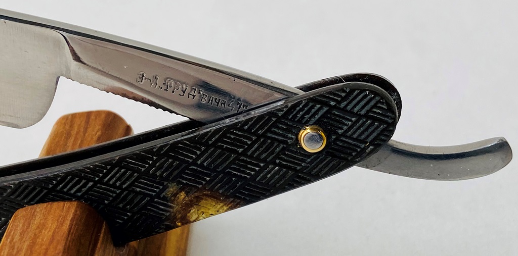 Бритва в пользовании не была,но требовала косметических работ.Минимальная шлифовка и полировка клинка. Геометрия на уровне.Новые втулки, с добавлением внутренних шайб.Родная ручка имеет "рисунок" желтоватого оттенка,по всей видимости заводского происхождения.Заточена и готова к бритью.
