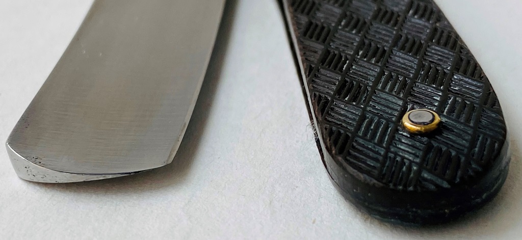 Бритва в пользовании не была,но требовала косметических работ.Минимальная шлифовка и полировка клинка. Геометрия на уровне.Новые втулки, с добавлением внутренних шайб.Родная ручка имеет "рисунок" желтоватого оттенка,по всей видимости заводского происхождения.Заточена и готова к бритью.
