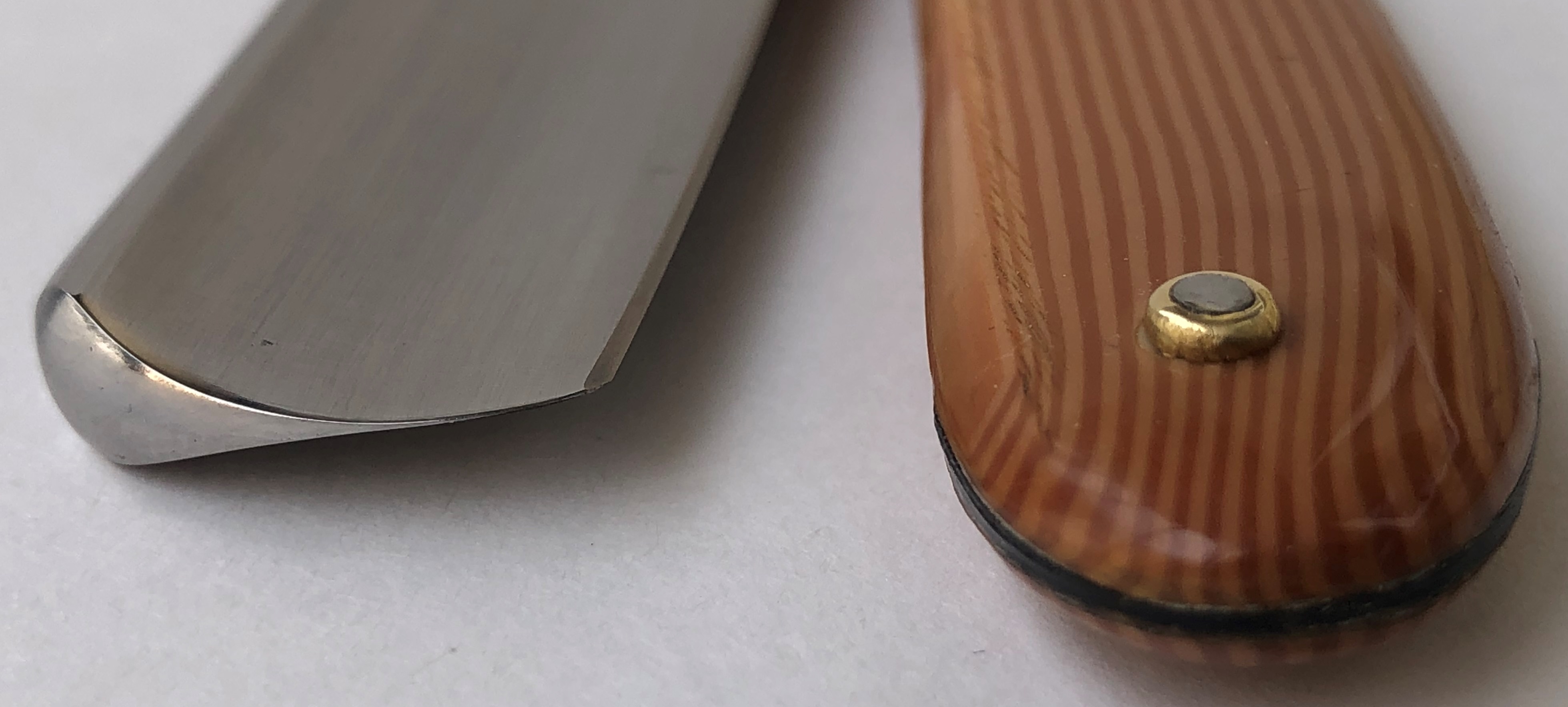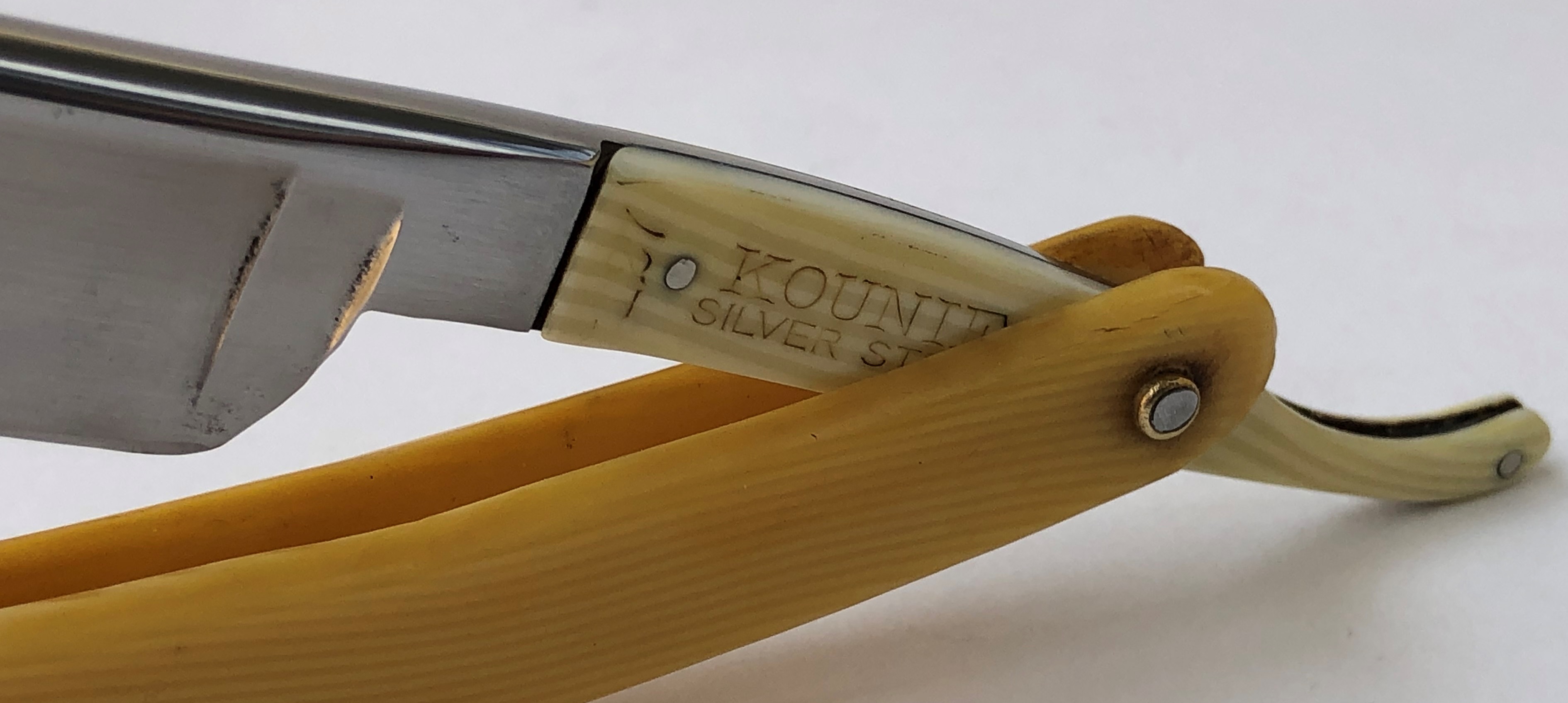 Бритва в хорошем, рабочем состоянии. Была разобрана для добавления внутренних шайб и замены пинов на втулки.Полотно было немного освежено и умеренно отполировано.Кромка равномерна по всей длине.Удобная пластиковая накладка.Бритва идеально подойдет для новичка в качестве стартовой и совершенно недорогой.Высококачественная сталь.Бритва заточена и готова к бритью.