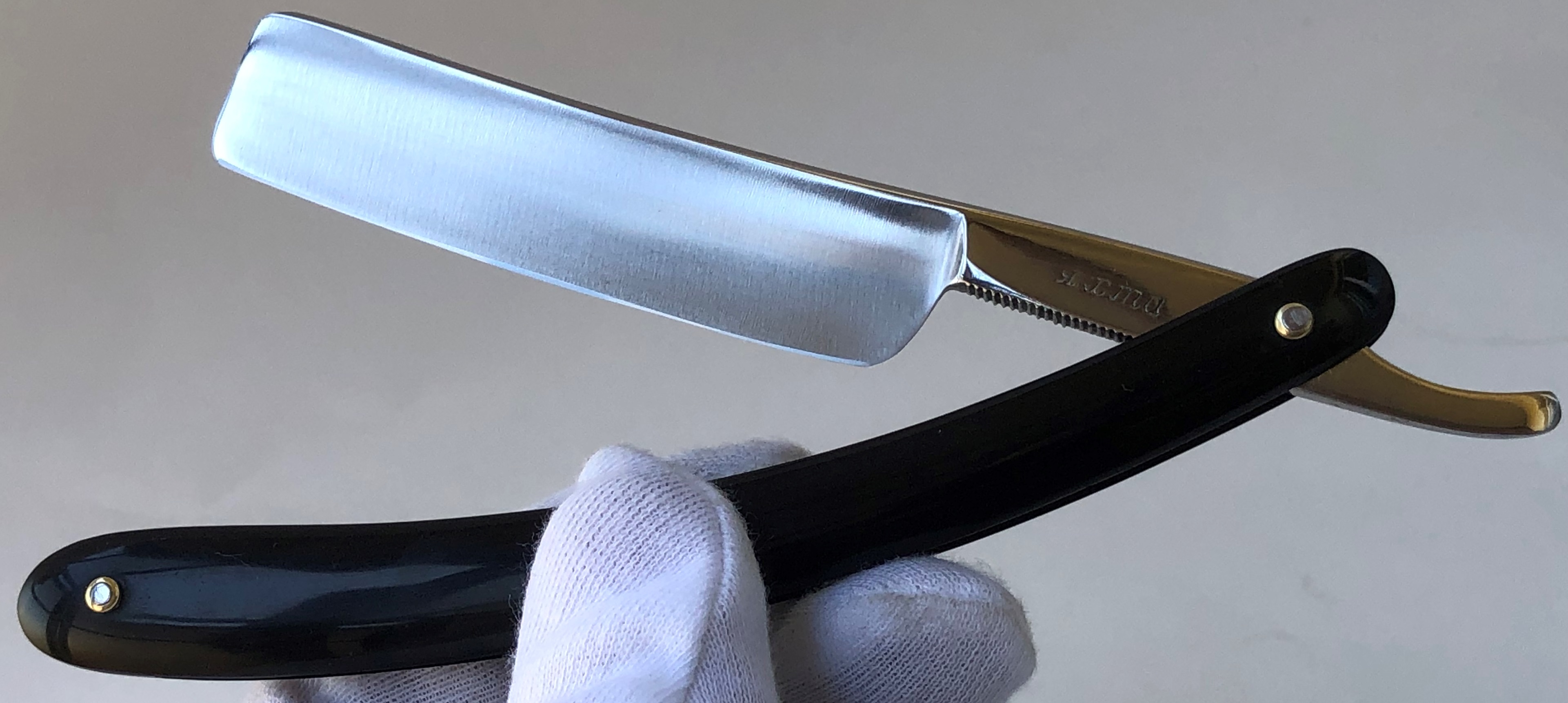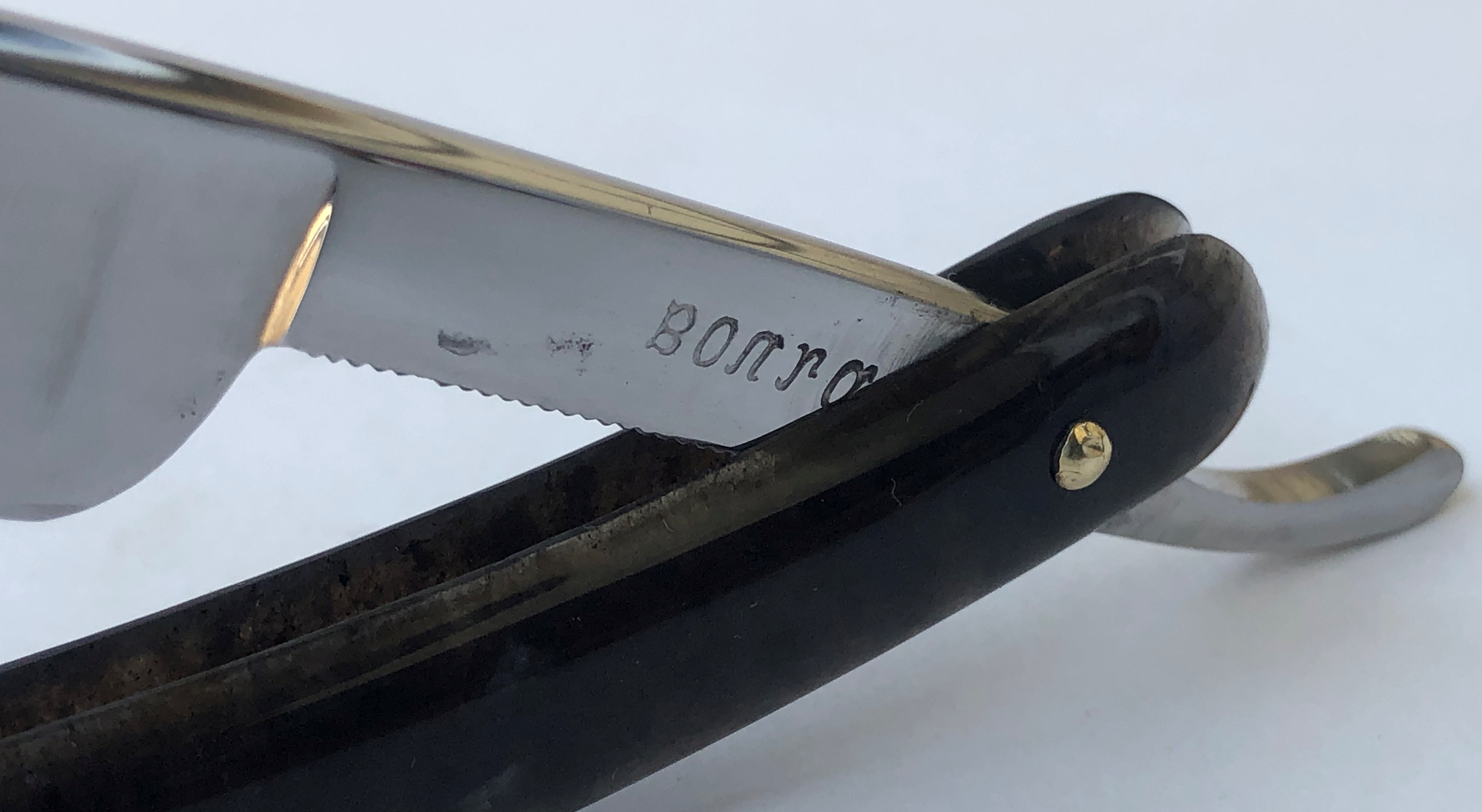 Бритвы данного бренда были как полноразмерные, так и укороченные.Тут имеет место быть как раз укороченная тяжёлая,парикмахерская бритва.Состояние близко к идеальному. Родная шлифовка клинка! Бритва была перебрана, для удаления "следов времени" в районе осевого механизма.Родные пины были заменены на более эффективные двух-цветные втулки , а также добавлены внутренние шайбы.Умеренная полировка.Идеальная геометрия клинка:кромочка равномерна по всей длине и еле заметна.Оригинальная форма клинка для более удобного хвата при бритье, а укороченная РК также прекрасно работает с проблемными и менее доступными участками лица. Серьёзная, с отличной сталью, парикмахерская бритва. Не пропустите!