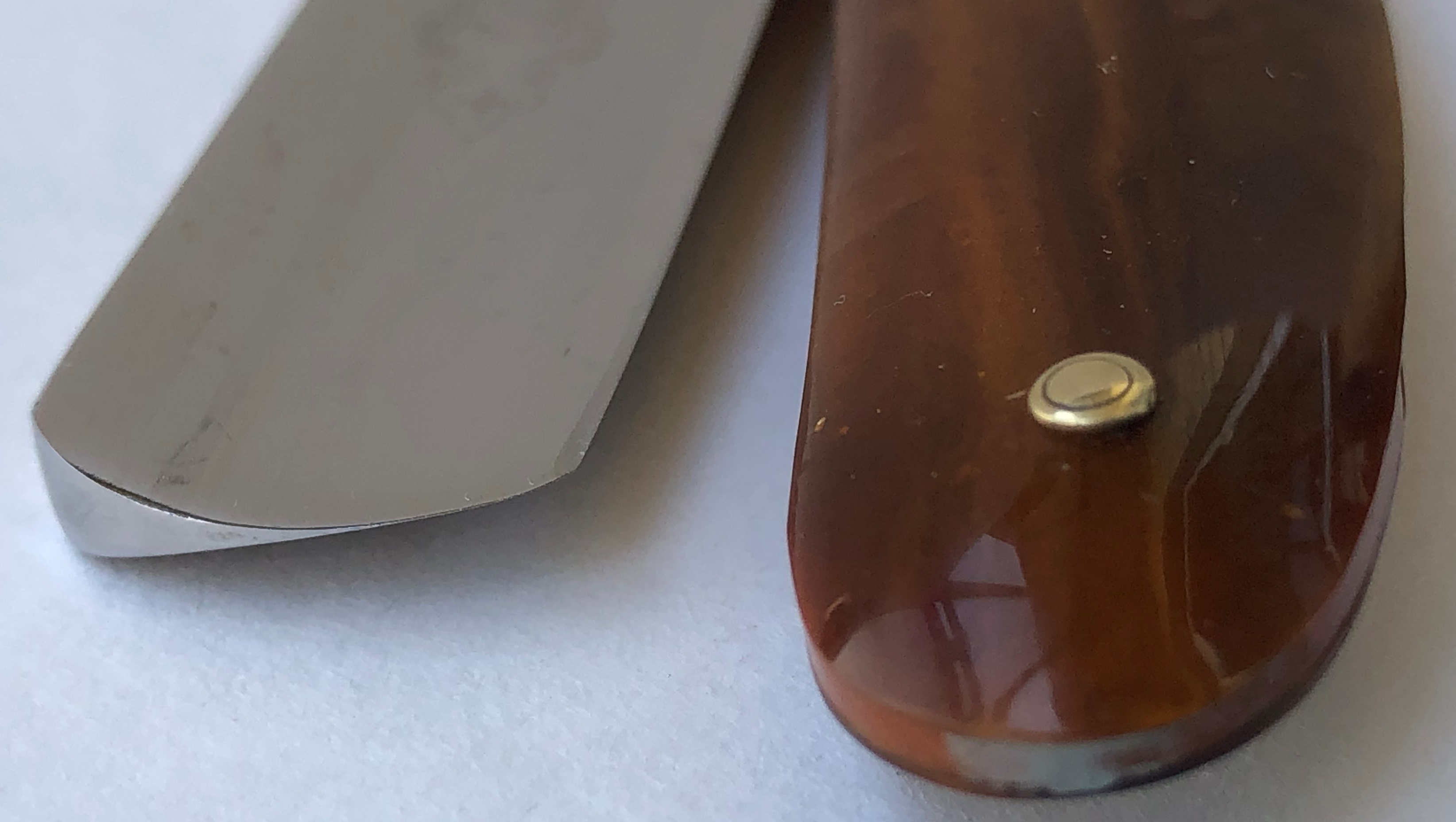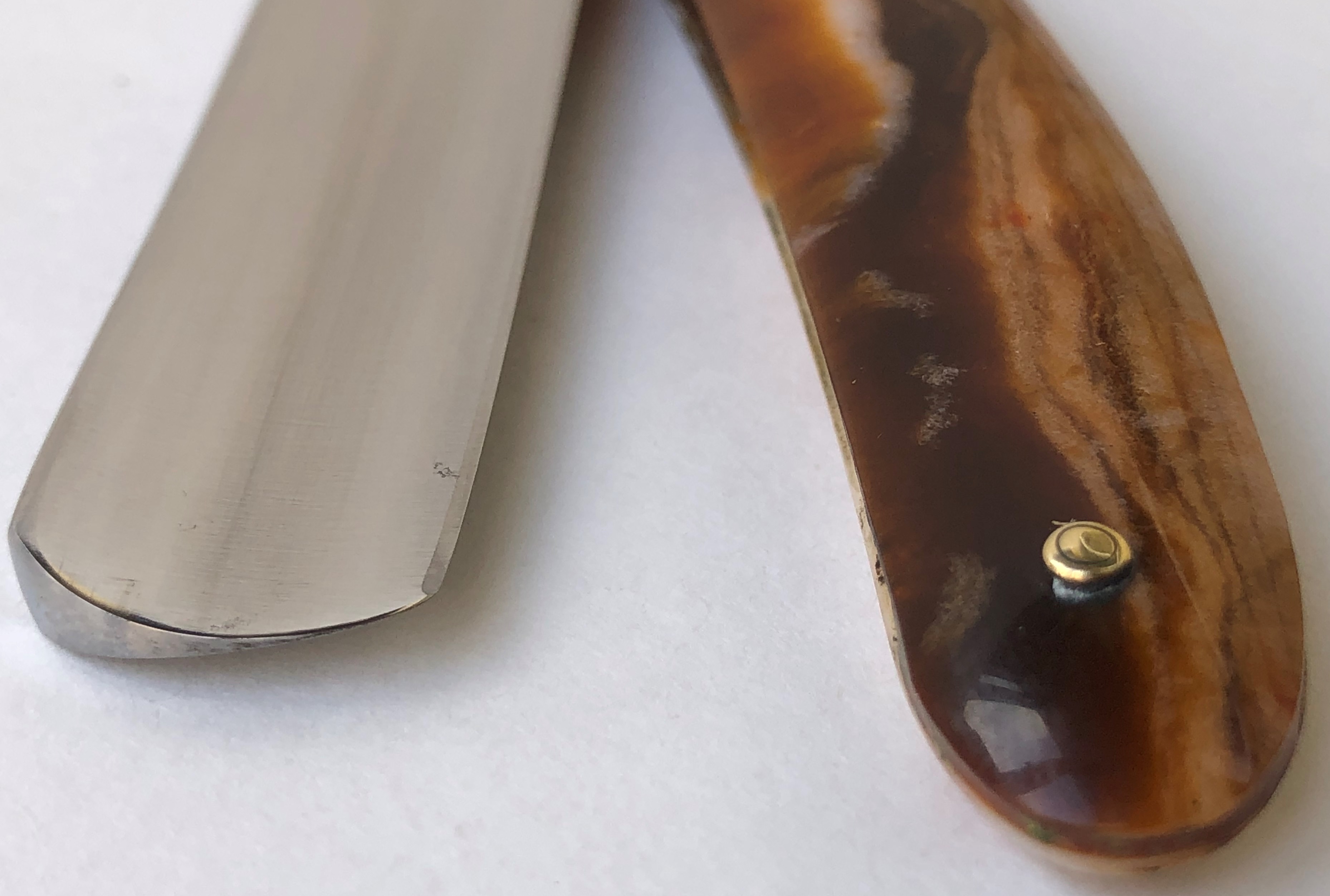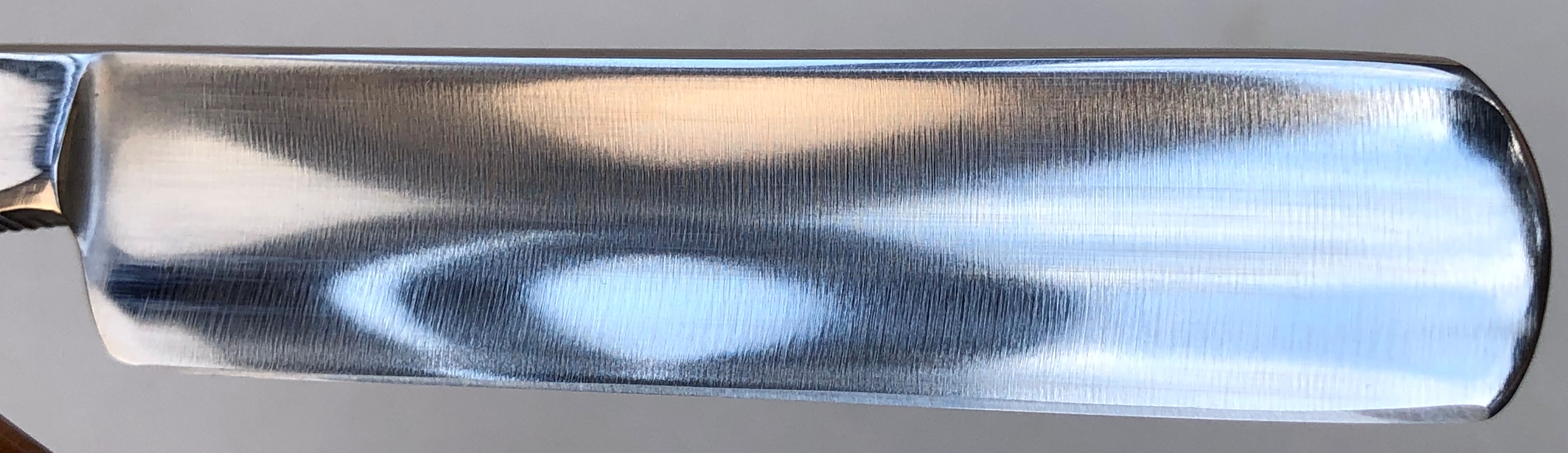 Бритва в пользовании не была, но нуждалась в чистке и полировке. Небольшое количество "следов времени" осталось, но никоим образом не повлияют на дальнейшую эксплуатацию.Комбинированная продольно-поперечная шлифовка.Новые втулки и внутренние шайбы. Идеальная геометрия полотна:кромочка равномерна по всей длине и еле заметна.