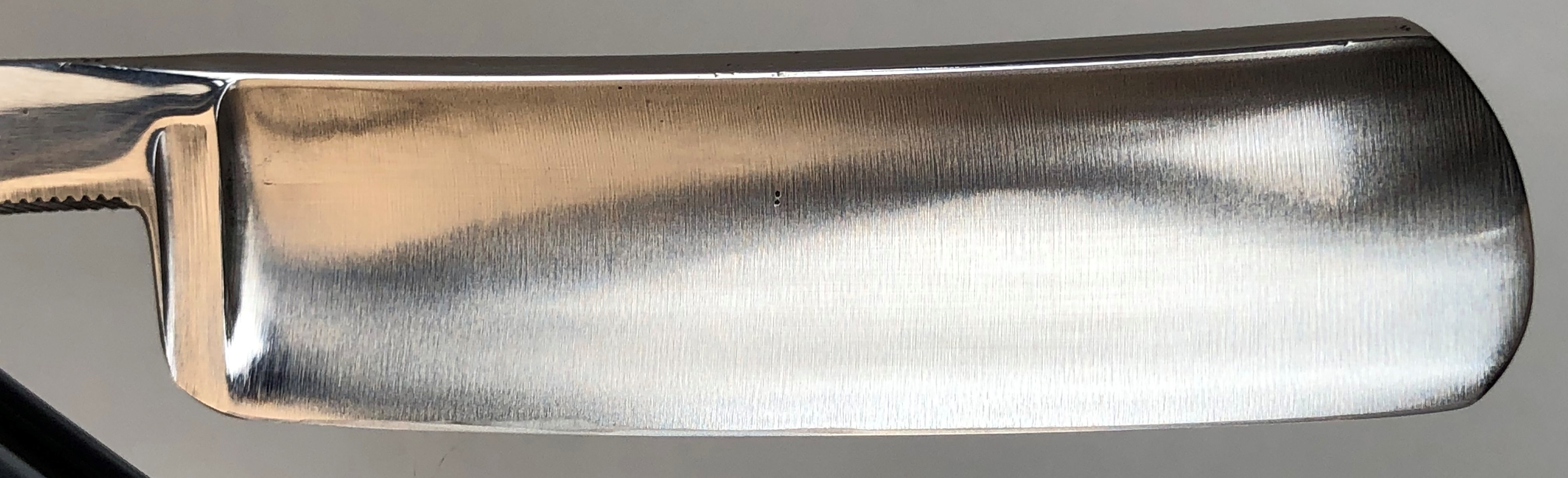 Бритва в пользовании не была, но нуждалась в чистке и полировке. Небольшое количество "следов времени" осталось, но никоим образом не повлияют на дальнейшую эксплуатацию.Комбинированная продольно-поперечная шлифовка.Новые втулки и внутренние шайбы. Идеальная геометрия полотна:кромочка равномерна по всей длине и еле заметна.