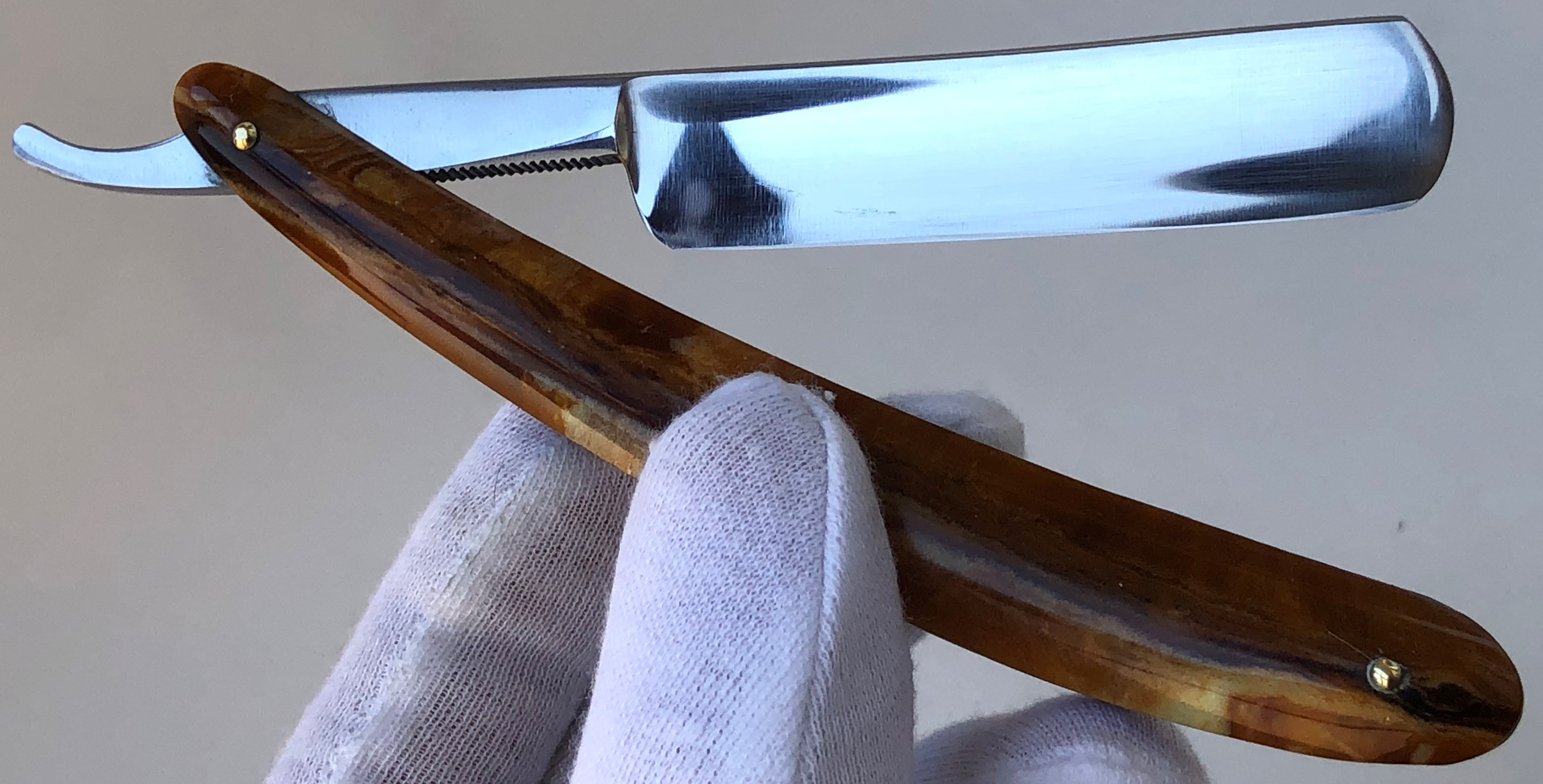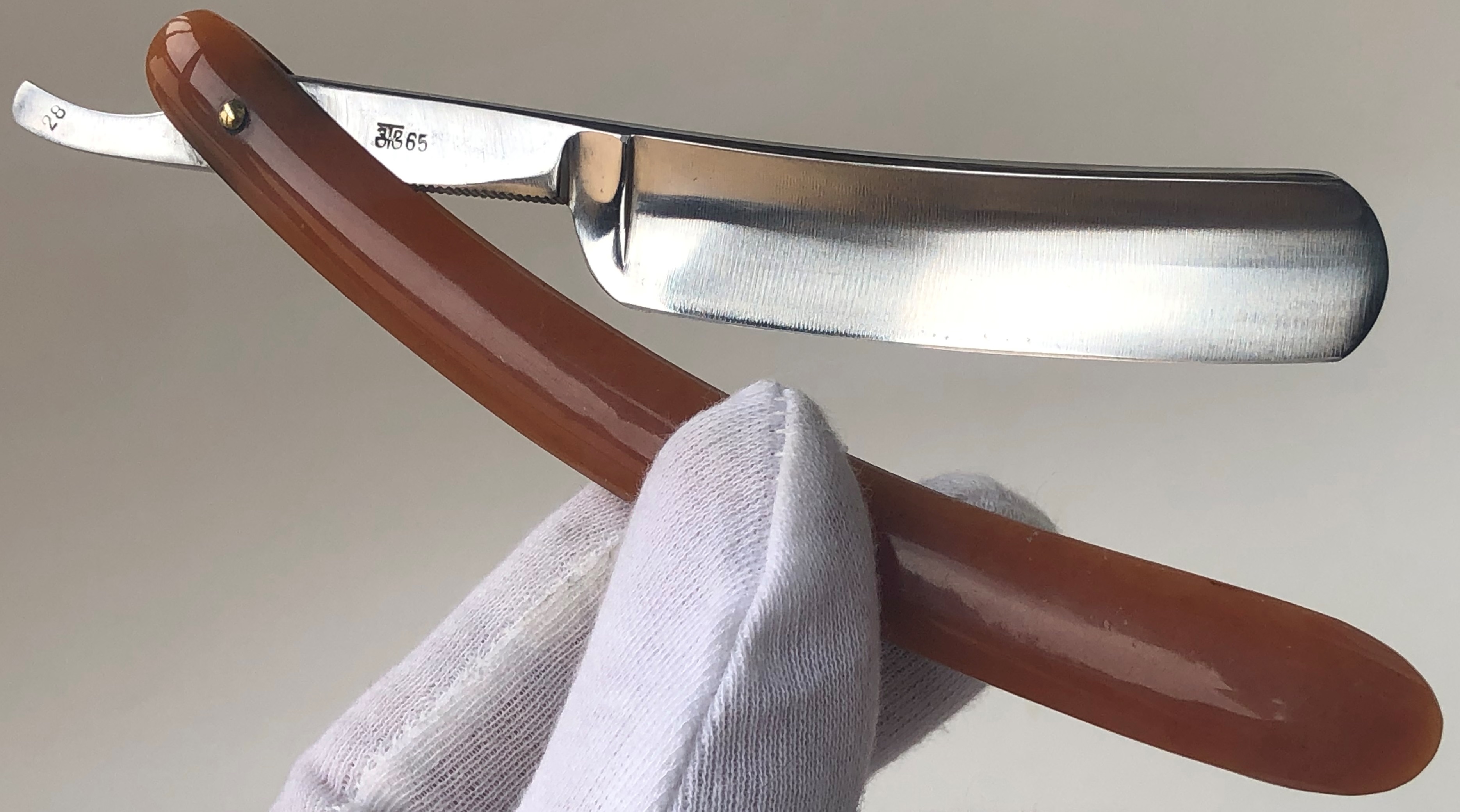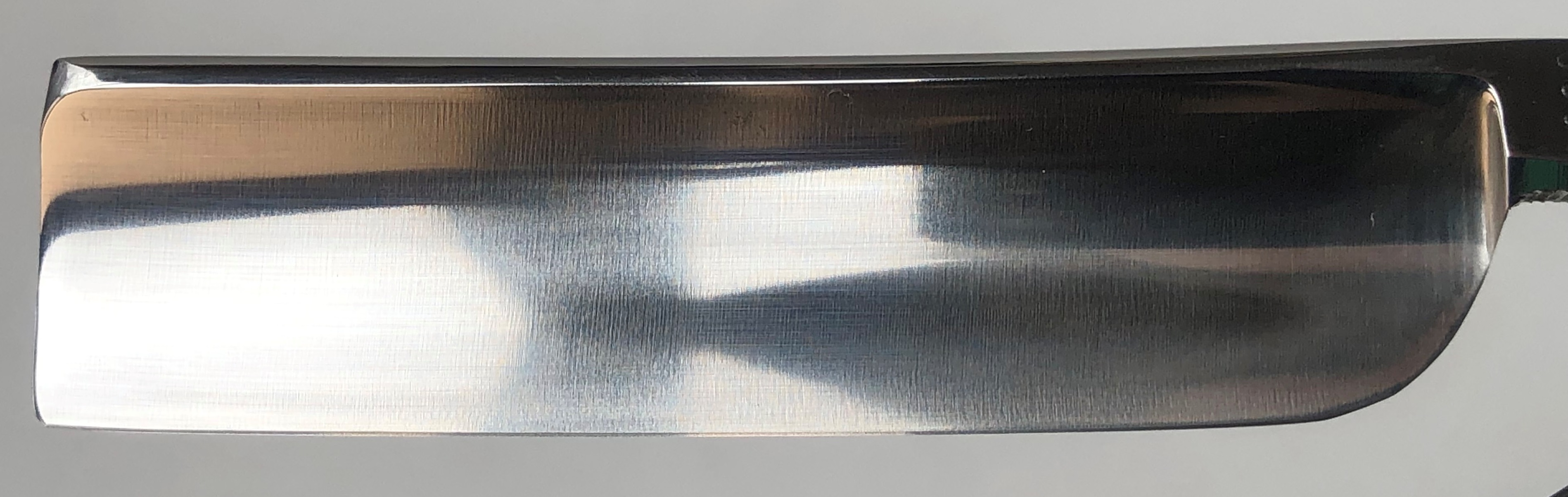 Бритва в пользовании не была, но требовала минимальных, косметических работ.Была разобрана-собрана,с освежением клинка до былого блеска и добавлением внутренних шайб.Попробовал повторить "заводской" гринд полотна.Кромочка равномерна по всей длине.