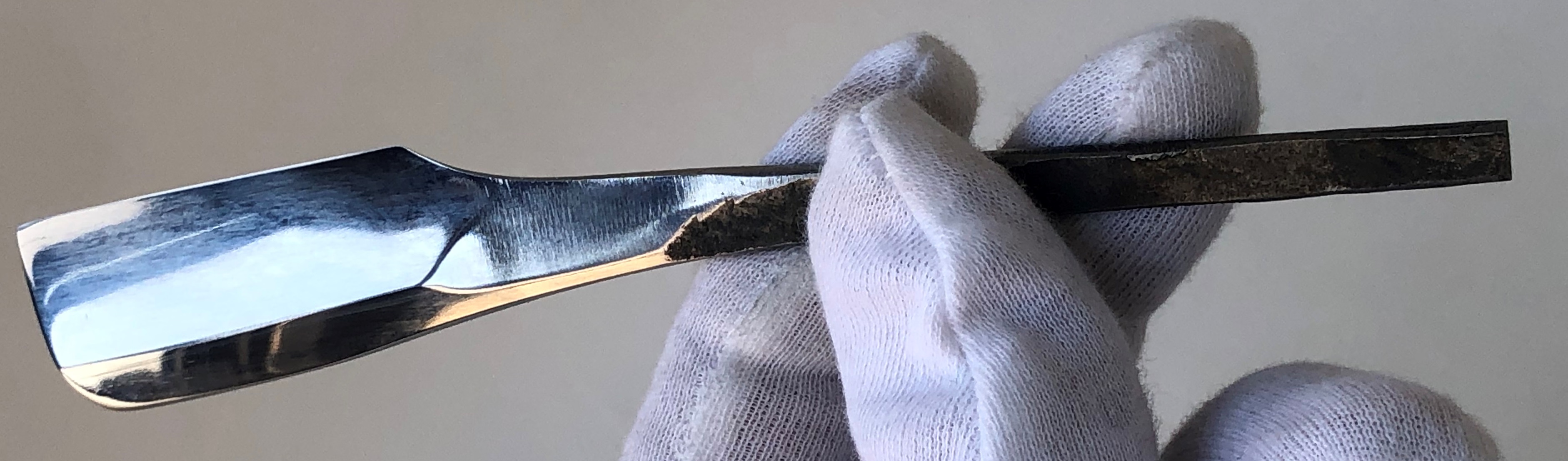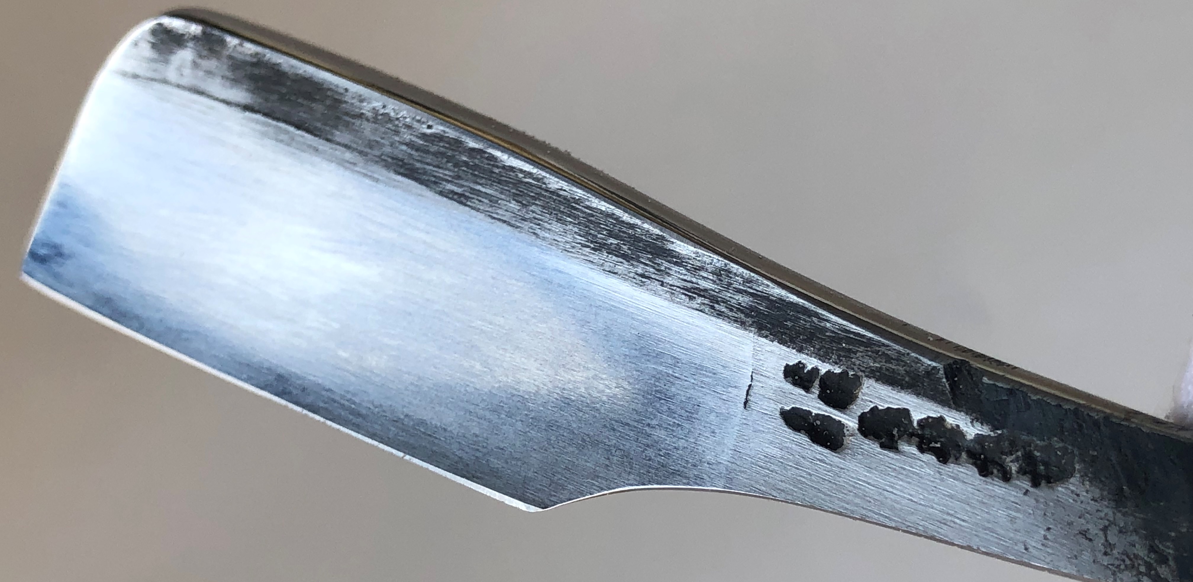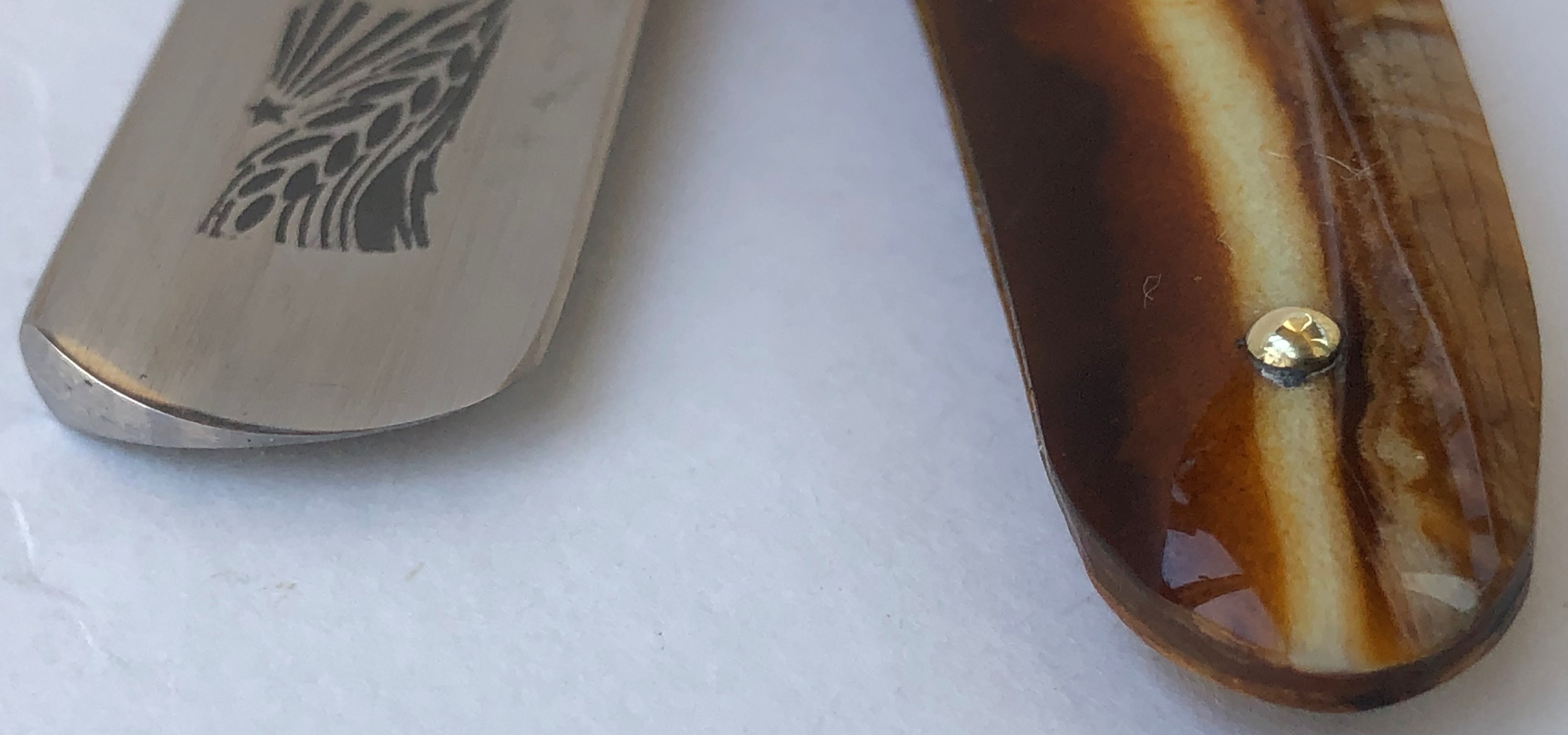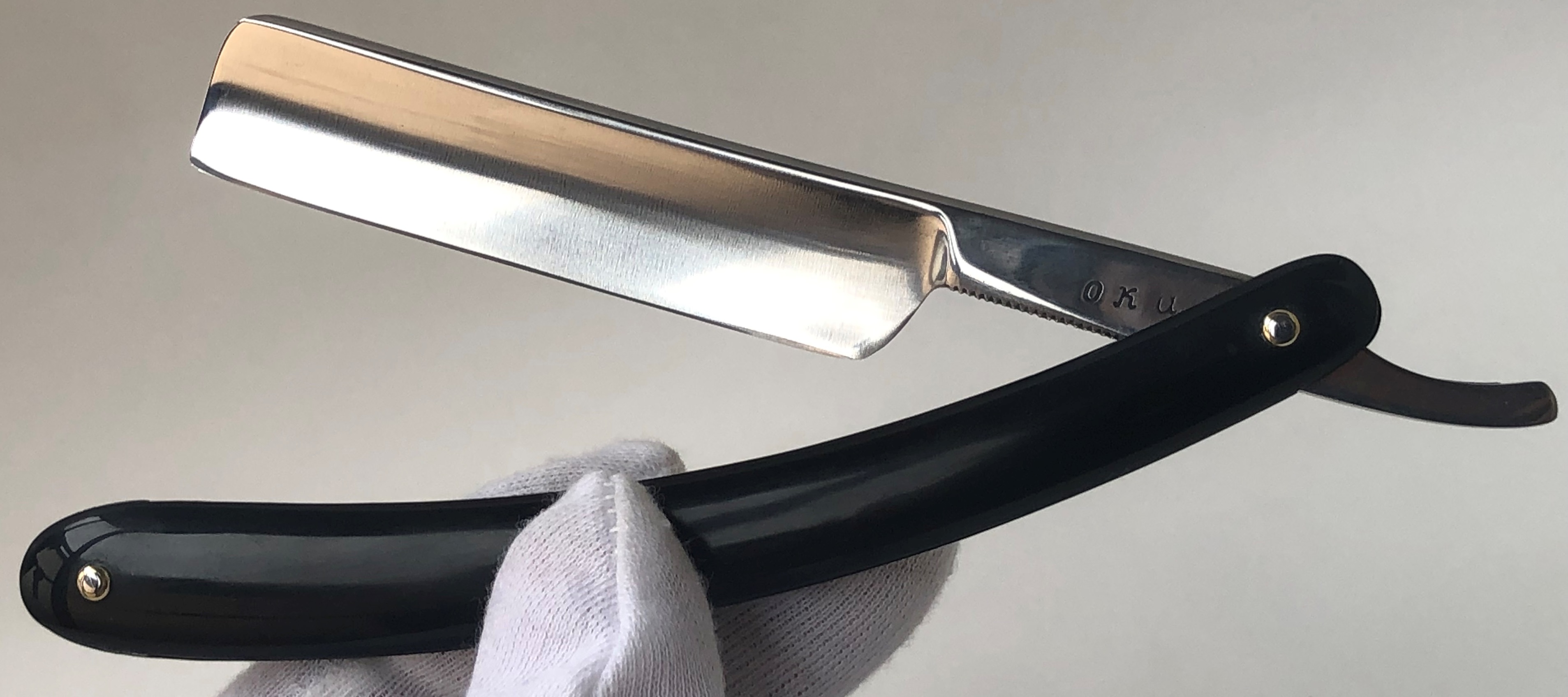 Бритва в пользовании не была, но требовала минимальных, косметических работ.Была разобрана-собрана,с освежением клинка до былого блеска и добавлением внутренних шайб.Попробовал повторить "заводской" гринд полотна.Кромочка равномерна по всей длине.