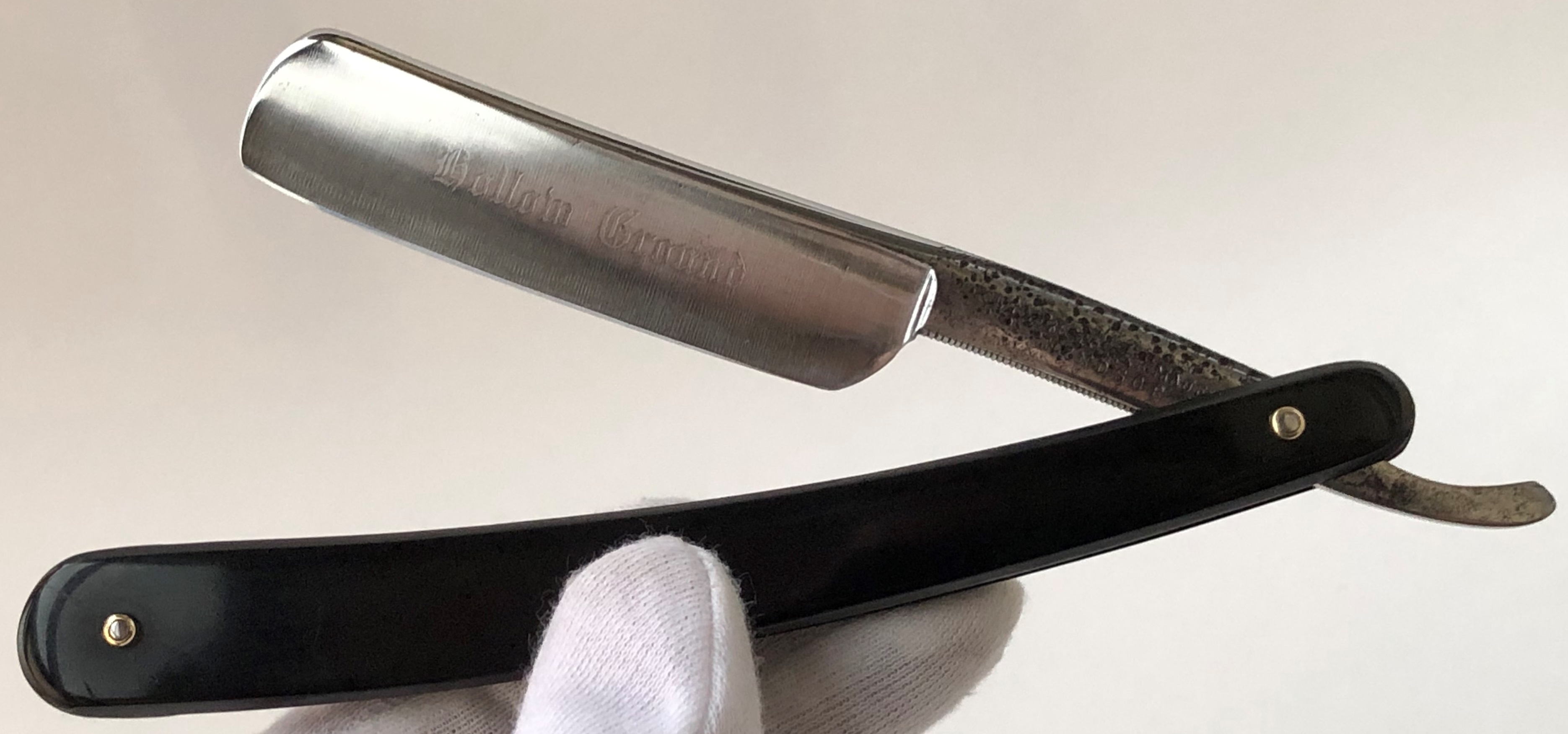 Ширина полотна-17.2 мм. Толщина обушка-4.3 мм. Полная вогнутость. Углеродистая сталь. Бритва в очень хорошем состоянии. Клинок немного освежен от старинной питины.(Небольшое пятнашко на лицевой стороне полотна не в счет).Идеальная геометрия клинка:кромочка равномерна по всей длине. Добавил внутренние шайбы и поставил двух-цветные втулки. Родная коробочка! Бритва заточена и готова к бритью. Отличный вариант для новичка и не только . Не пропустите недорогой и полностью готовый в бритью вариант. Цена-3850 р с доставкой.ПРОДАН Внимание! Важная информация! Spoiler Show