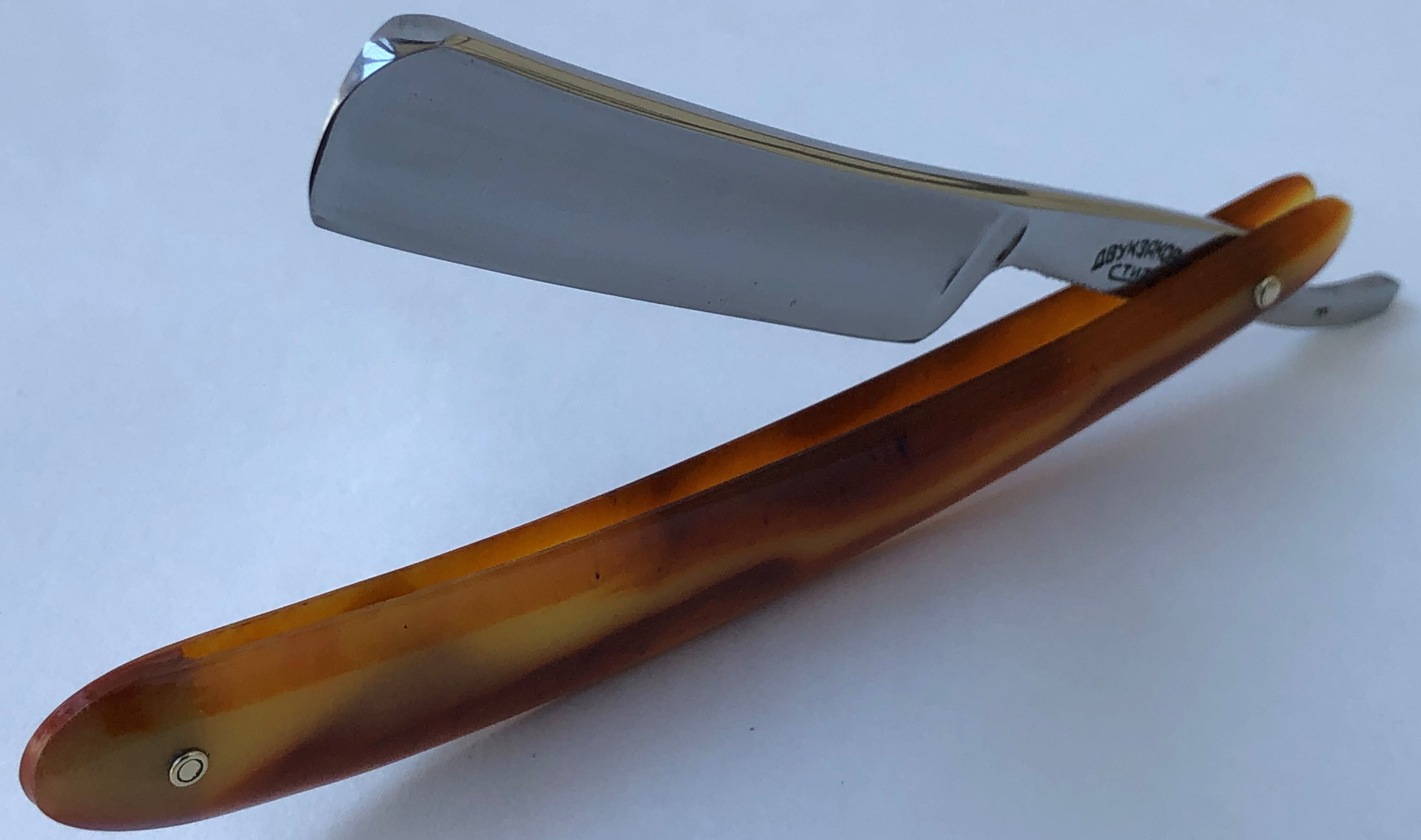 Ширина полотна-21.0 мм. Толщина обушка-6.0 мм. Полная вогнутость. Углеродистая сталь. Середина прошлого века производство. Бритва в пользовании не была, но немного пришлось пройтись на самых мелких абразивах,чтобы удалить микроцарапины, патину и окисление с металла. Состояние практически оригинальное.Ручка была перебрана,добавлены внутренние шайбы, а также обратно установлены родные пины.Идеальная геометрия клинка:кромочка практически незаметна и равномерна по всей длине.Красивая бритва, в прекрасном состоянии,с отличной "звонкой" сталью. Шикарный вариант как для новичка, так и для любого разор-маньяка.. Заточена и готова к бритью. Не пропустите редкую и красивую вещь... Цена-25500 р с доставкой.ПРОДАН Внимание! Важная информация! Spoiler Show