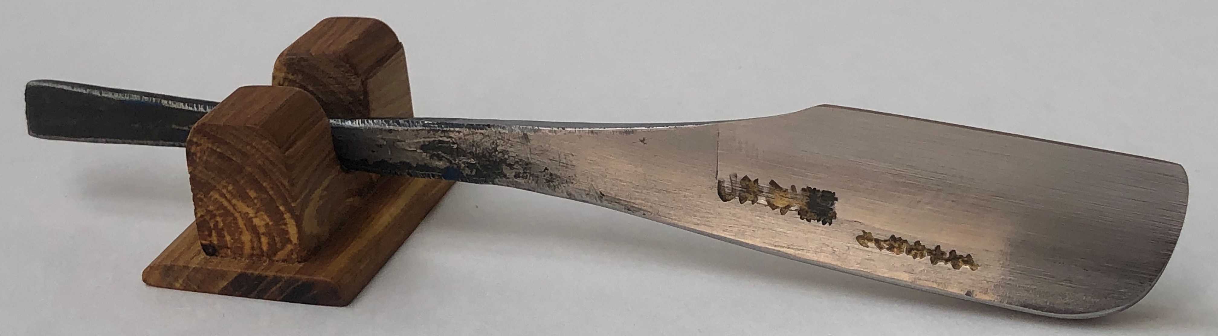 Изготовлена традиционным способом,из двух частей. Немного освежил клинок с обратной стороны. Сторона "УРА" осталась нетронутой. Минимальная полировка,не считая "зеркального" обушка.Бритва достаточно тяжёлая,потому что размер почти 7/8. Очень красивая и мощная бритва, так что не пропустите, кто хочет попробовать японскую классику в деле..