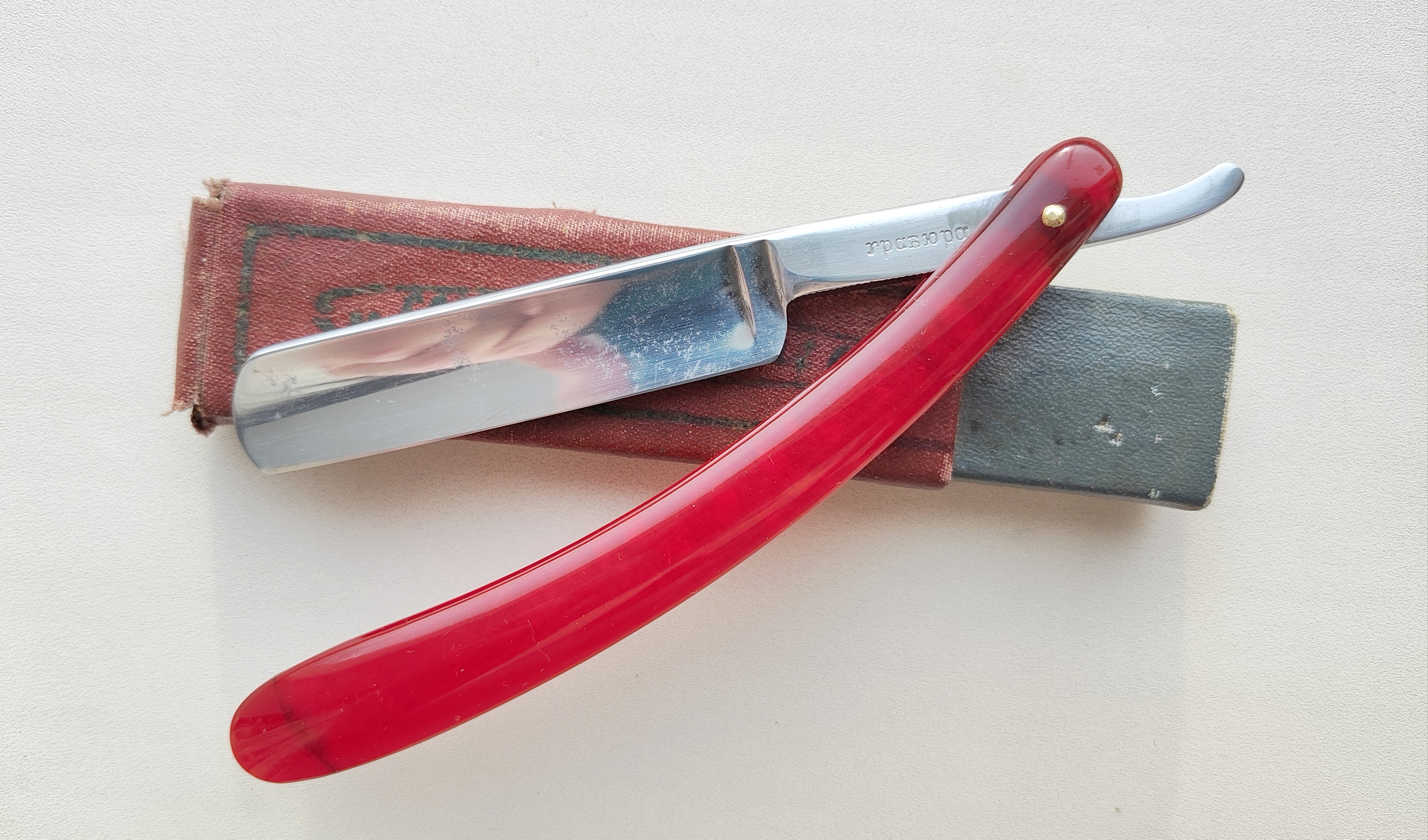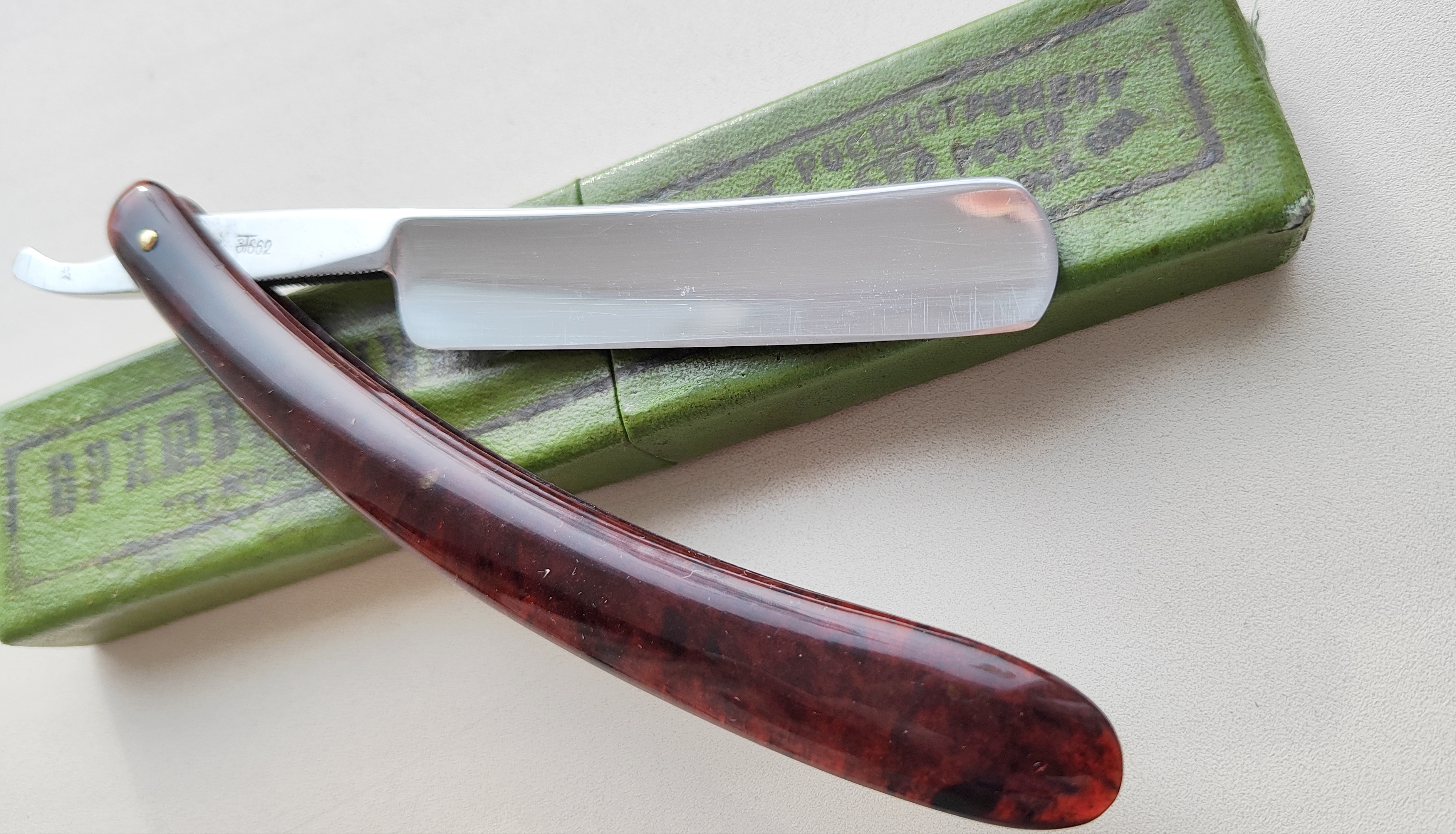 Опасная бритва Экстра, завод СТИЗ, 1953 год. Ширина полотна 16.5 мм, все родное, футляр тоже. Подготовлена мной к бритью. Отличная сталь конца сталинского периода, красивая оправа вишнёвого цвета, сама модель Экстра от СТИЗ встречается нечасто. Геометрия чуть нарушена с завода, но заточку я вывел полностью, в последующем затачиваться и правиться будет без проблем. Цена 4640 руб. К бритве рекомендую приобрести ремень для правки опасных бритв моего изготовления из итальянской кожи (подробнее на странице 17, объявления: 261, 262, 264, 265). Spoiler Show