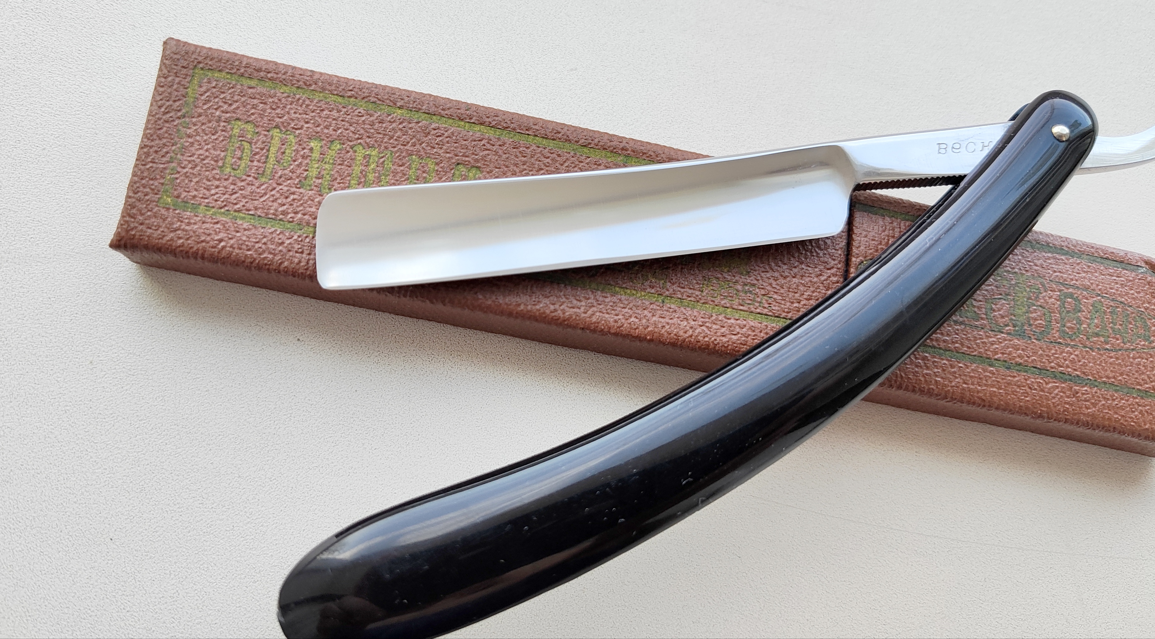 Опасная бритва фабрики Feinster, Solingen-Garantie (г. Золинген, Германия), первая половина 20 века. Ширина полотна 20 мм, оправа установлена от СТИЗ с сохрнанением пина, футляр без крышки от Henckels. Подготовлена мной к бритью. Сталь Best Silver Steel - лучшая серебряная сталь, звонкая и отлично бреет, великолепно держит заточку. Цена 7800 руб. К бритве рекомендую приобрести ремень для правки опасных бритв моего изготовления из итальянской кожи (подробнее на странице 17, объявления: 261, 262, 264, 265). Spoiler Show