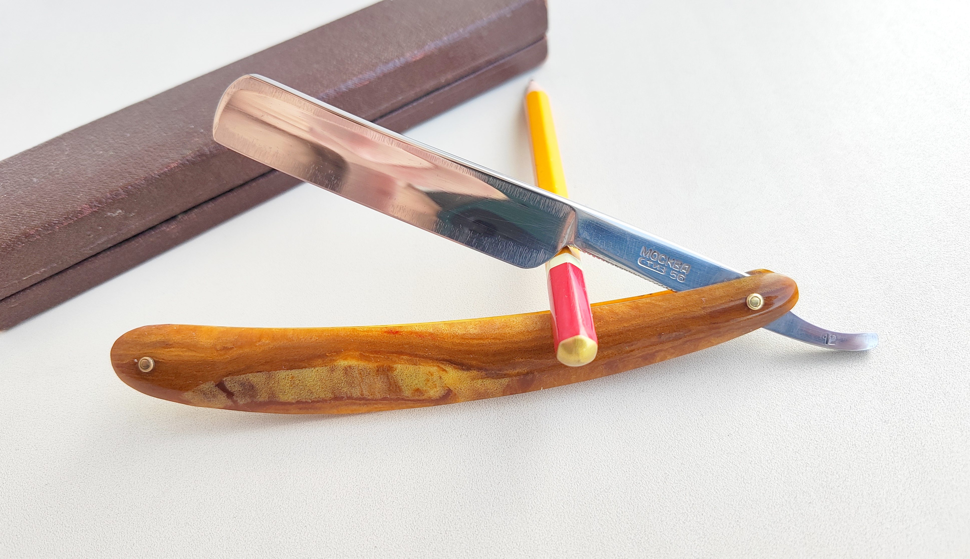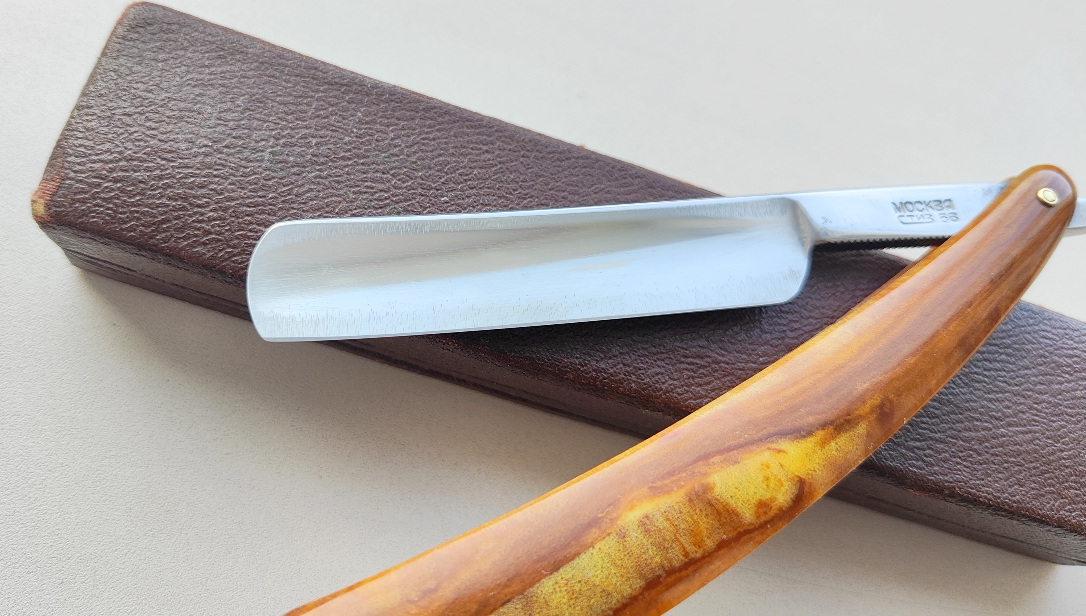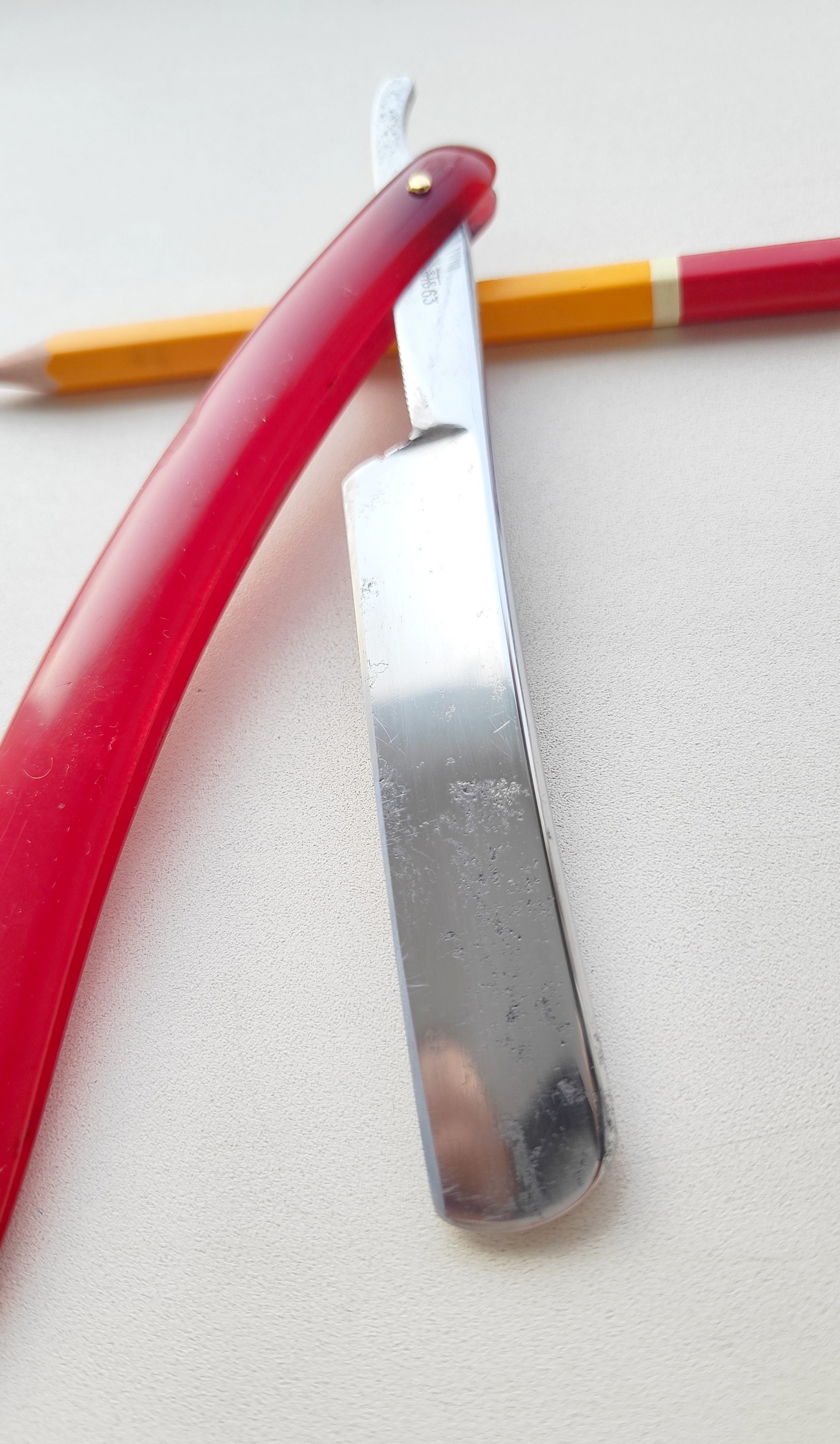 Опасная бритва Москва, завод СТИЗ, 1956 год. Была гравюра на полотне "Речной вокзал" (пришлось удалить). Ширина полотна 16.5 мм, все родное, футляр тоже. Почистил вручную полотно (осталось немного рисок от старого регринда) и заточил. Подготовлена мной к бритью. Хороший 1956 год, качественная углеродистая сталь, красивая оправа под янтарь/древесину. Цена 3710 руб. К бритве рекомендую приобрести ремень для правки опасных бритв моего изготовления из итальянской кожи (подробнее на странице 17, объявления: 261, 262, 264, 265). Spoiler Show