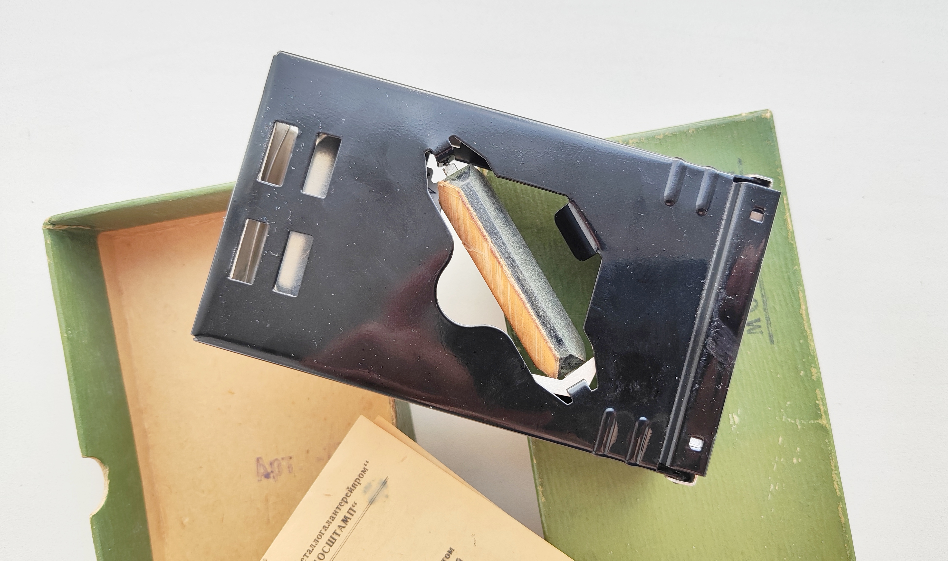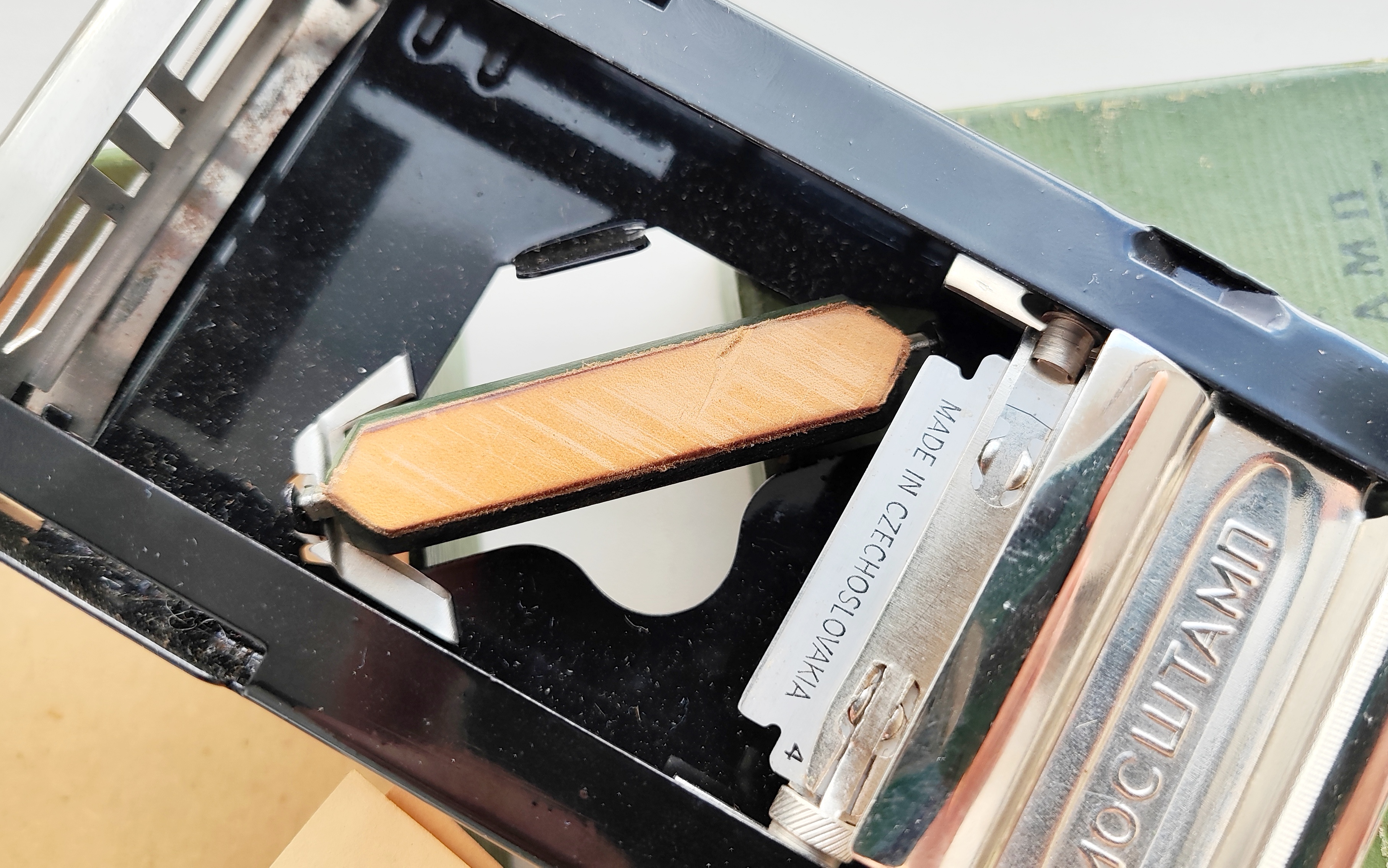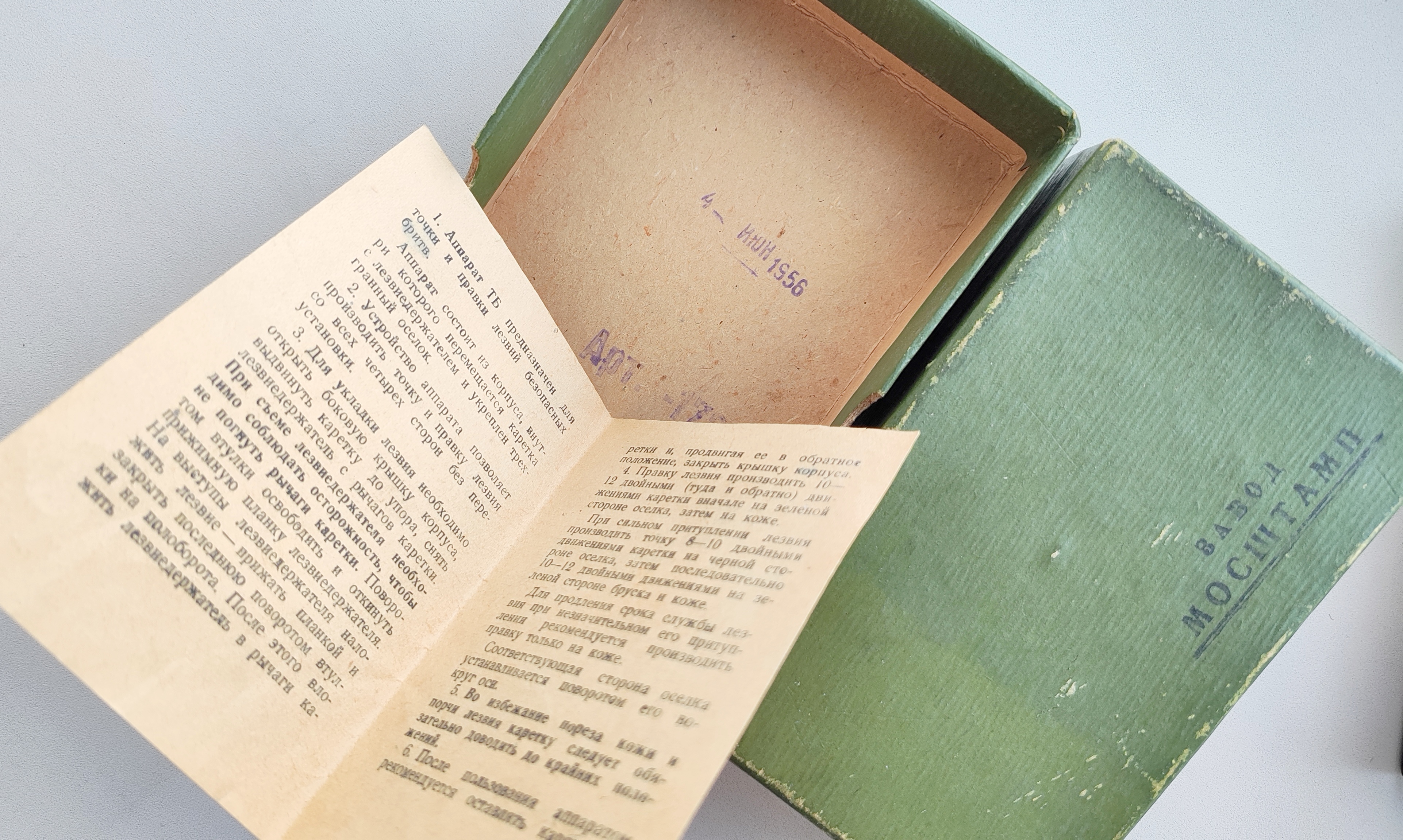 Аппарат для точки и правки лезвий безопасных бритв, завод Мосштамп, маркировка на коробке 4 июня 1956 г, СССР. Всё родное - коробка, инструкция, отличное состояние (разве что сторона с кожей с порезом - можно сошлифовать). Но главное - что прибор полностью работает как надо: каретка- держатель вынимается, лезвие ставится, ходит правильно, делает правильные перевороты, трёхсторонний камень крутится и фиксируется, проверял. В инструкции описан процесс пользования. В общем, не только в коллекцию, но и можно пользоваться. Очень редкий прибор, первый раз встречаю. Мосштамп раньше делал опасные бритвы и вот его продукция по безопасному бритью. Лезвия тут стандартные двухсторонние для бритвенных Т-станков, безопасных бритв. Цена 2410 руб. Spoiler Show