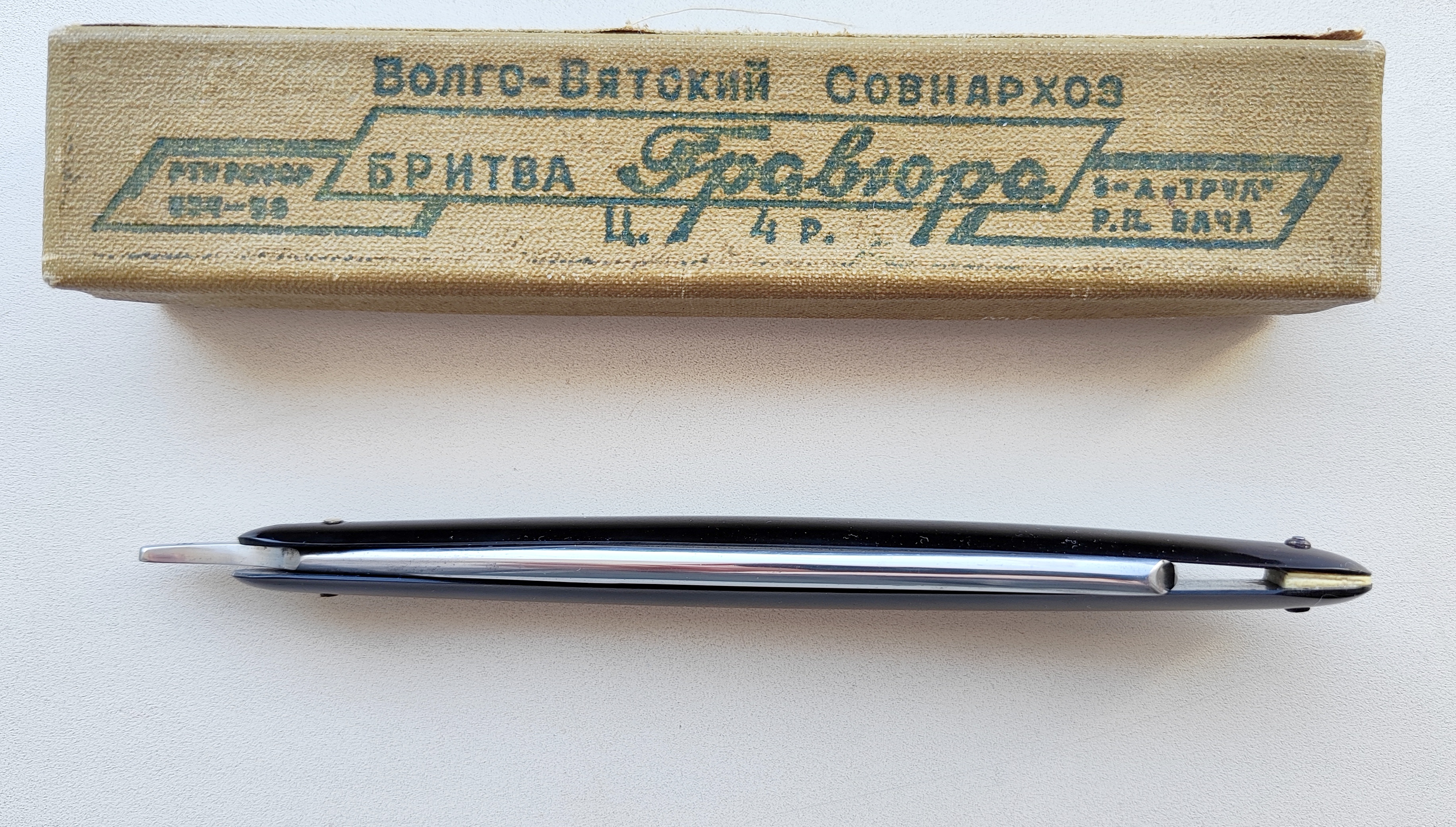 Опасная бритва Гравюра, завод ЗТВ (Вача), 1963 год. Ширина полотна 18 мм, все родное, потрёпанный футляр от другой бритвы ЗТВ без крышки. На полотне была гравюра "Горький". Пришла в коррозии, чистил вручную, поэтому гравюру пришлось удалить. Подготовлена мной к бритью. В советские годы бритвы Гравюра и Подарок относились к премиум-классу продукции ЗТВ. Качественная сталь, характерная для Гравюр и довольно бюджетная стоимость. Цена 4270 руб. К бритве рекомендую приобрести ремень для правки опасных бритв моего изготовления из итальянской кожи (подробнее на странице 17, объявления: 261, 262, 264, 265). Spoiler Show