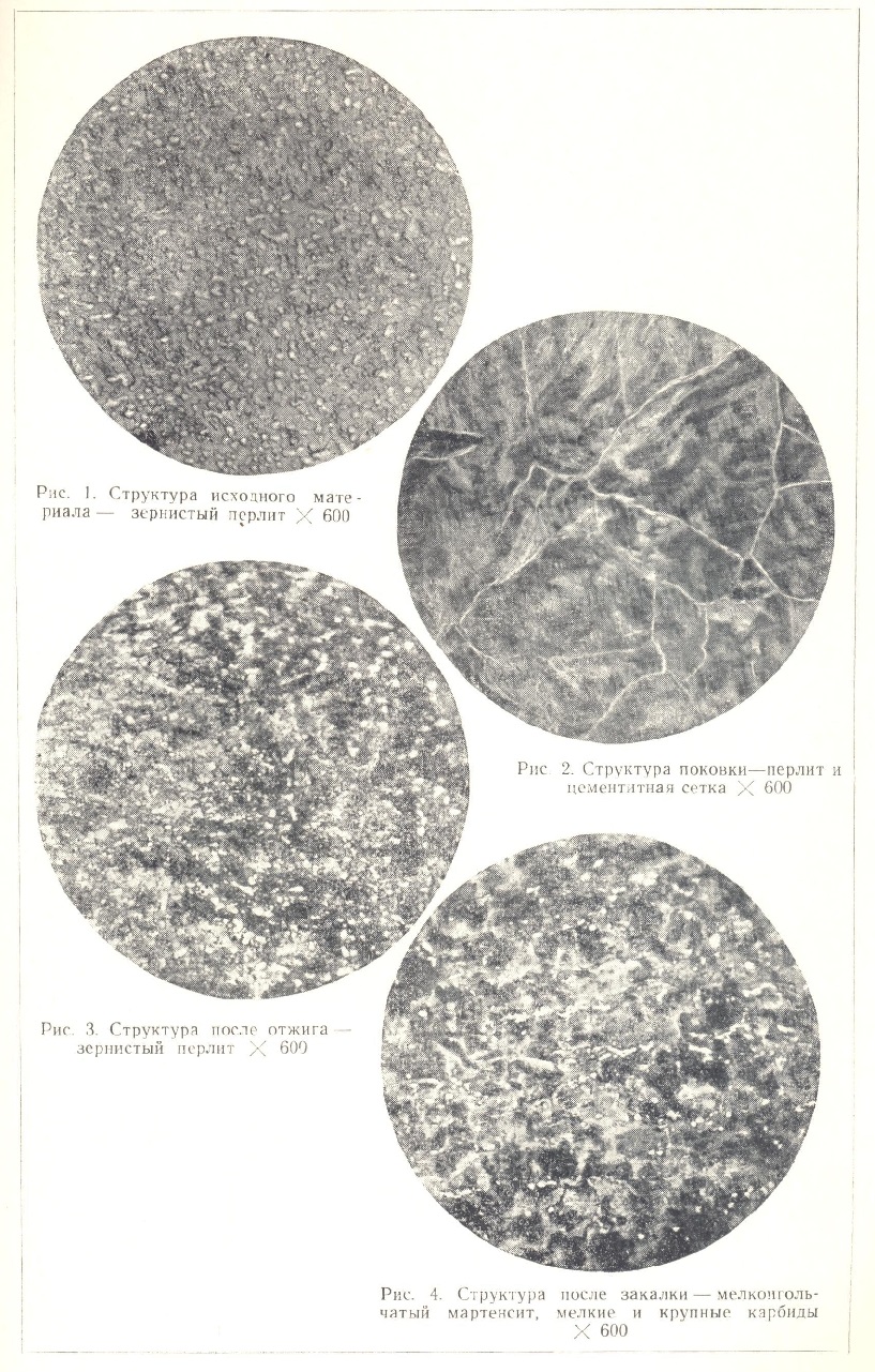 Рис. 1. Структура исходного мате риала зернистый перлит Х600 Рис 2. Структура поковки—перлит и цементитная сетка Х600 Рис. З. Структура после отжига зернистый перлит Х600 Рис. 4. Структура после закалки — мелкоигольчатый мартенсит, мелкие и крупные карбиды х600 (Х600 - увеличение металлографического микроскопа. - прим. моё) Исследование макроструктуры готовых бритв и заготовок после различных операций показало, что неметаллические включения расположены равномерно, скоплений их на режущей кромке не наблюдалось. Микроструктура поставляемого на завод проката представляет собой равномерный зернистый перлит (рис. 1). После штамповки заготовки бритвы имеет структуру пластинчатого перлита, часто окруженного цементитной сеткой. Последняя появляется вследствие перегрева перед штамповкой и недостаточно быстрого охлаждения после штамповки (рис. 2). После отжига структура снова становится зернистой, но зерна не такие равномерные, как у исходного материала; величина зерен местами больше. Сетка цементита часто уничтожается не полностью. Выборочный контроль структуры после отжига не дает возможности отбраковывать бритвы с цементитной сеткой. Весьма вероятно, что бритвы попадают на закалку с остатками цементитной сетки и крупными карбидами (рис. З). После закалки и отпуска бритва имеет структуру мелкоигольчатого мартенсита с большим количеством карбидов (рис. 4) . Величина наиболее крупных карбидов близка к толщине режущей кромки бритвы (2—4 m) . В мартенсите по данным рентгеновского анализа плохих бритв растворено 0.4 % углерода, остальная часть углерода находится в виде карбидов, а его в стали 1.2-1.4%. В некоторых бритвах рентгеновским анализом обнаружено 10—15% остаточного аустенита. В соответствии с изменением структуры изменяется твердость. Твердость исходного материала после штамповки Hb=311—340, после отжига Нb=187—213, после закалки Rc=64-68, после отпуска Rc=58-64. Очевидно, микроструктура бритв, изготовлявшихся кустарными способами, тоже состояла из мартенсита, карбидов и некоторого количества остаточного аустенита. Сталь по составу была заэвтектоидной, закалка неполной. От структуры бритв, выпускаемых в настоящее время, она могла отличаться только размерами зерен и количеством отдельных составляющих. Структура хороших бритв, очевидно, была мелкозернистой. Старые вачские мастера должны были обладать большим искусством, чтобы без приборов выдерживать режимы нагрева и охлаждения