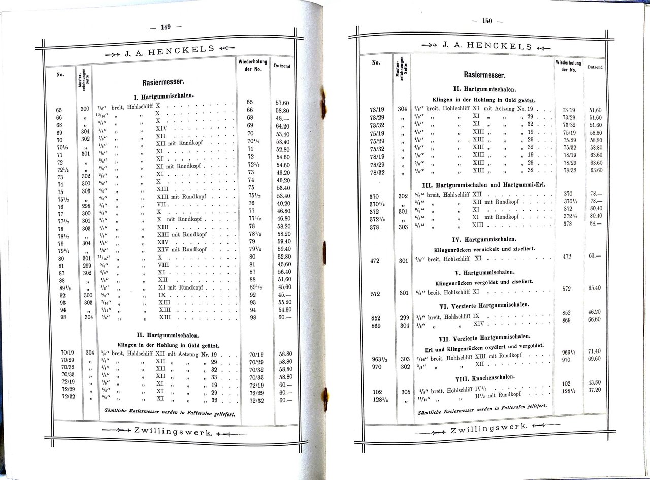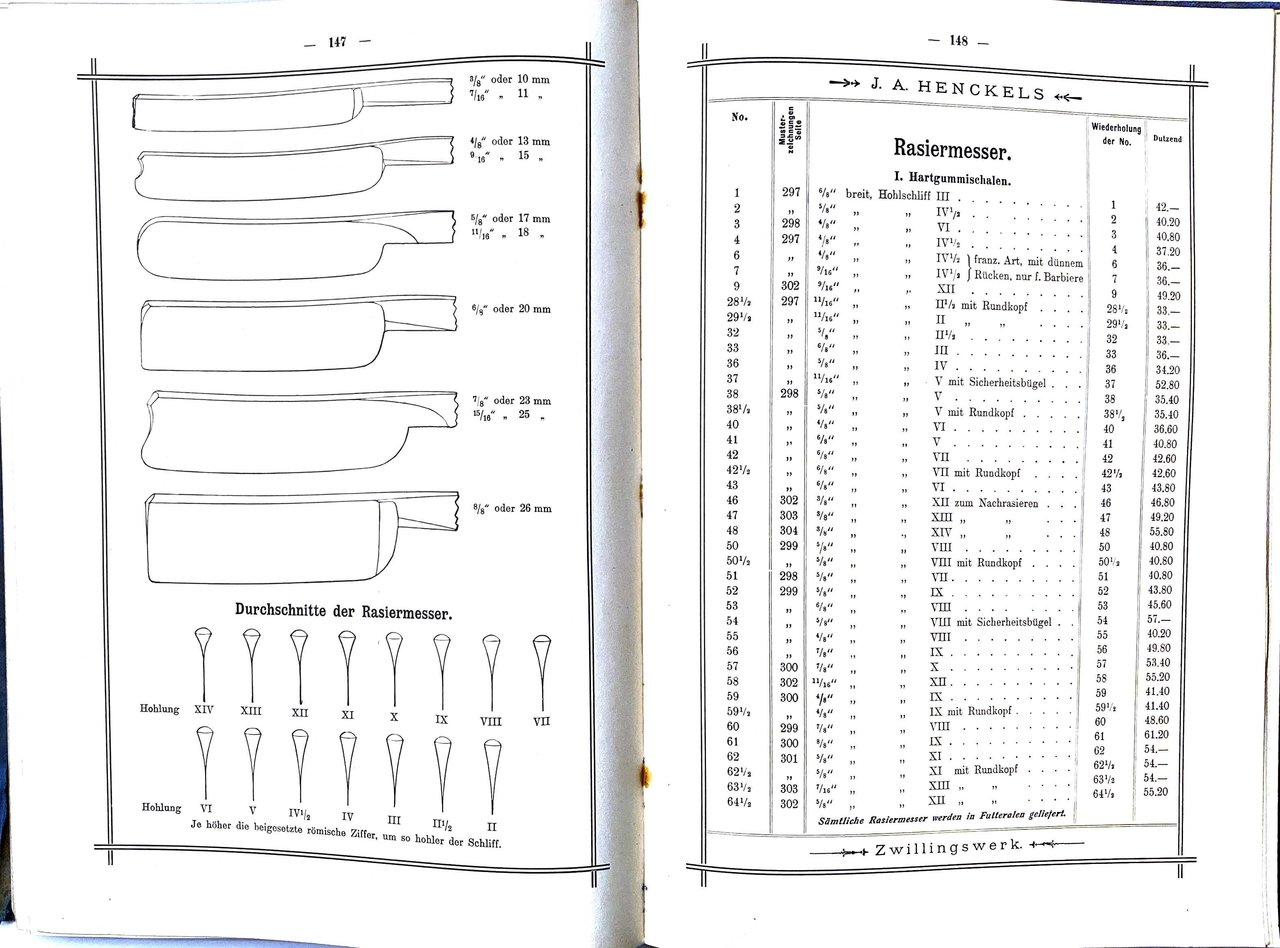 Фирма Henckels предоставила информацию, что в 1914 году у неё было 135 разных артикулов бритв. Только различные вариации ширины бритв, гравировки и материалов ручек могут быть источником столь широкого ассортимента бритв.