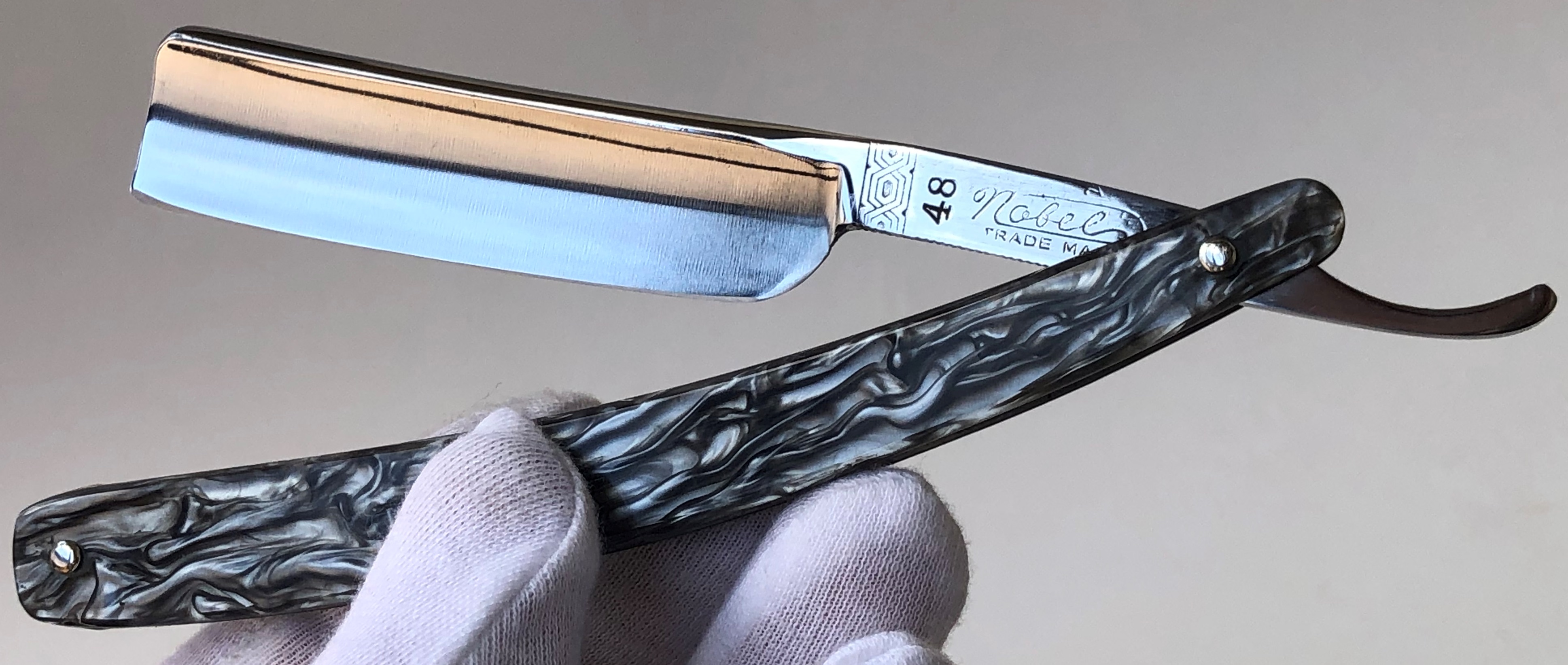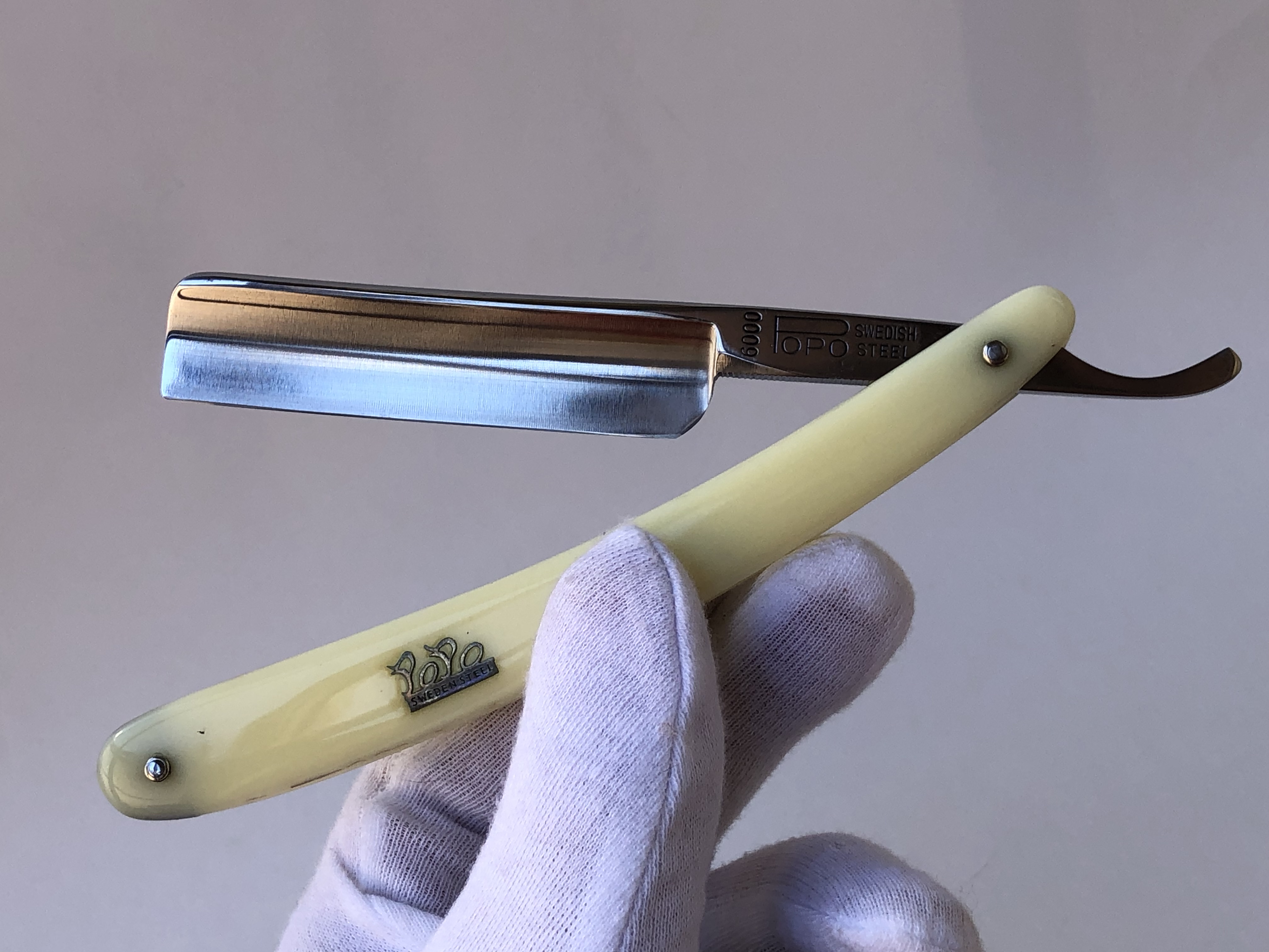 Бритва была разобрана, клинок по мере возможности приведён в порядок.Умеренная полировка. Кромочка немного широковата,но почти равномерна по всей длине полотна.Новые двух-цветные втулки и внутренние шайбы. Родная роговая оправа в хорошем состоянии,без критичных дефектов,но нужно сделать скидку на преклонный возраст материала.Но, внешних расслоений, трещин и разгрызанных мест нет.Удобная форма лезвия клинка. Бритва достаточно тяжёлая.