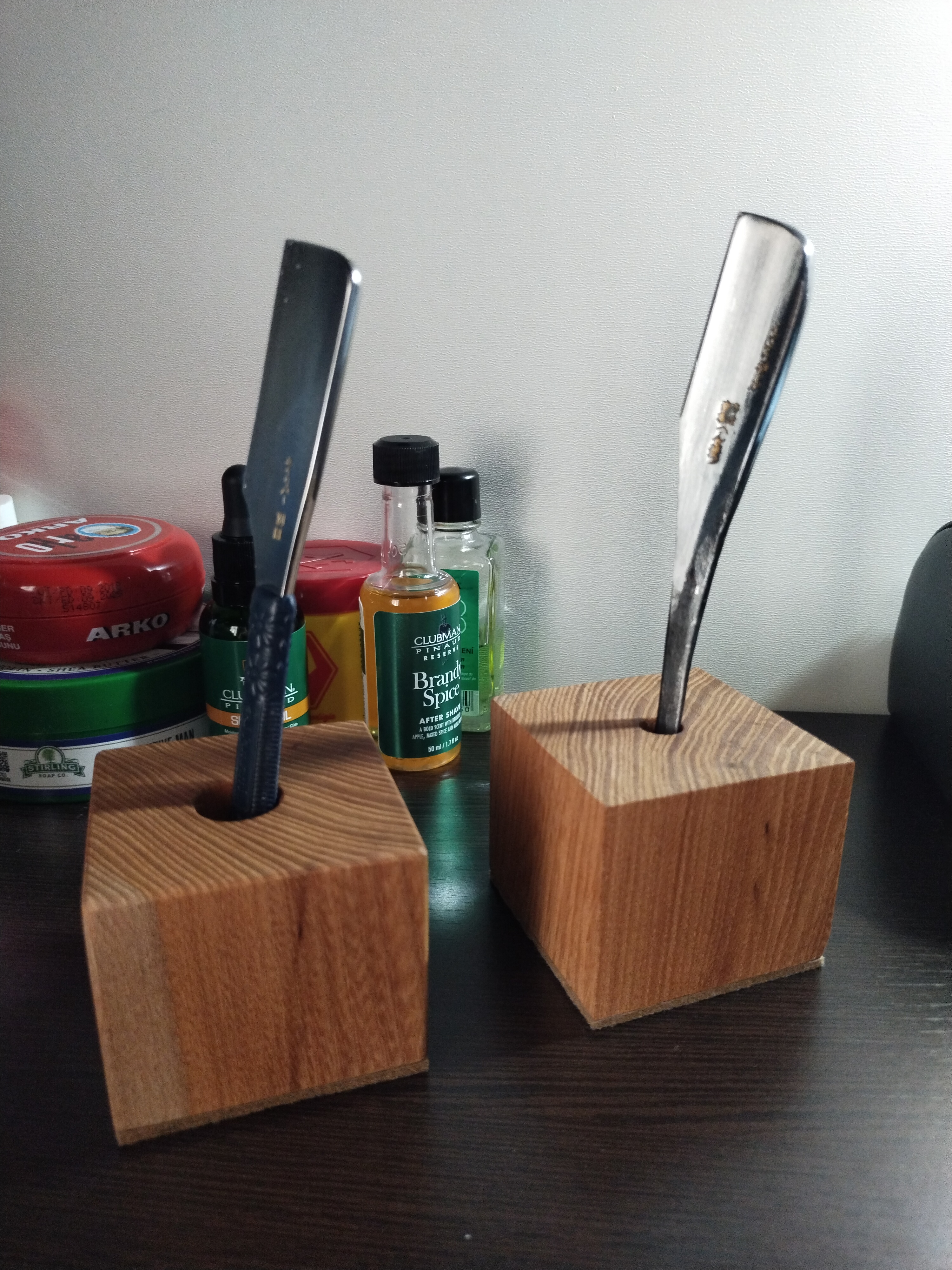Например, для классической японской бритвы камисори делал для себя подставку в двух вариантах исполнения: без и с шлифовкой и снятия фасок Дерево: Карагач Габаритные размеры: 62х62х52 (60х60х50) мм Размеры отверстий: диаметр 10мм (15мм), глубина примерно 4/5 высоты. Покрытие: Масло+воск бесцветный Накладка из искусственного войлока.