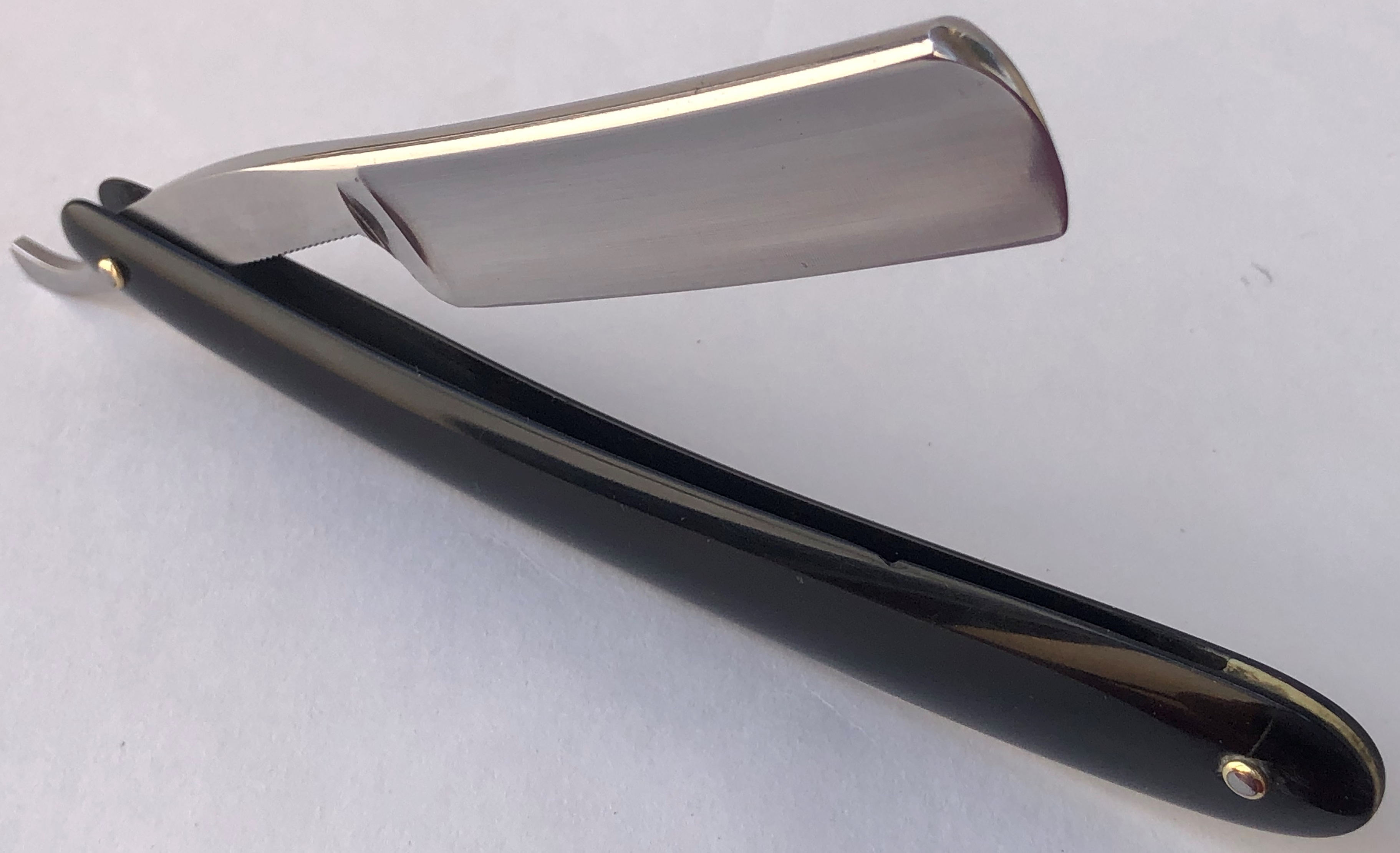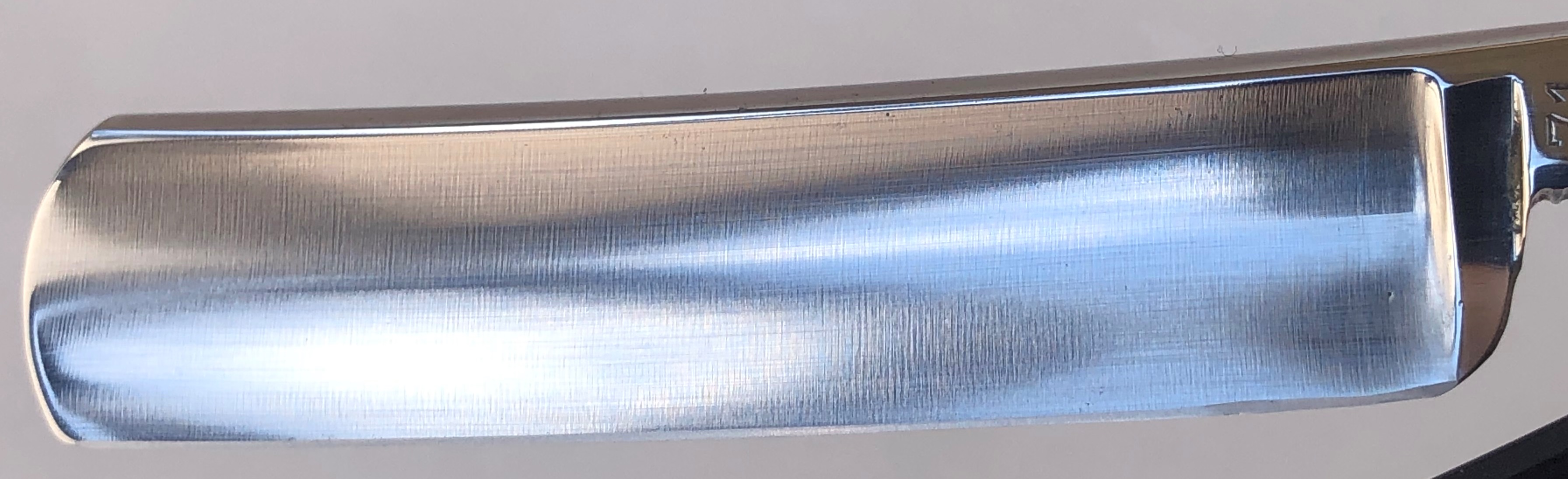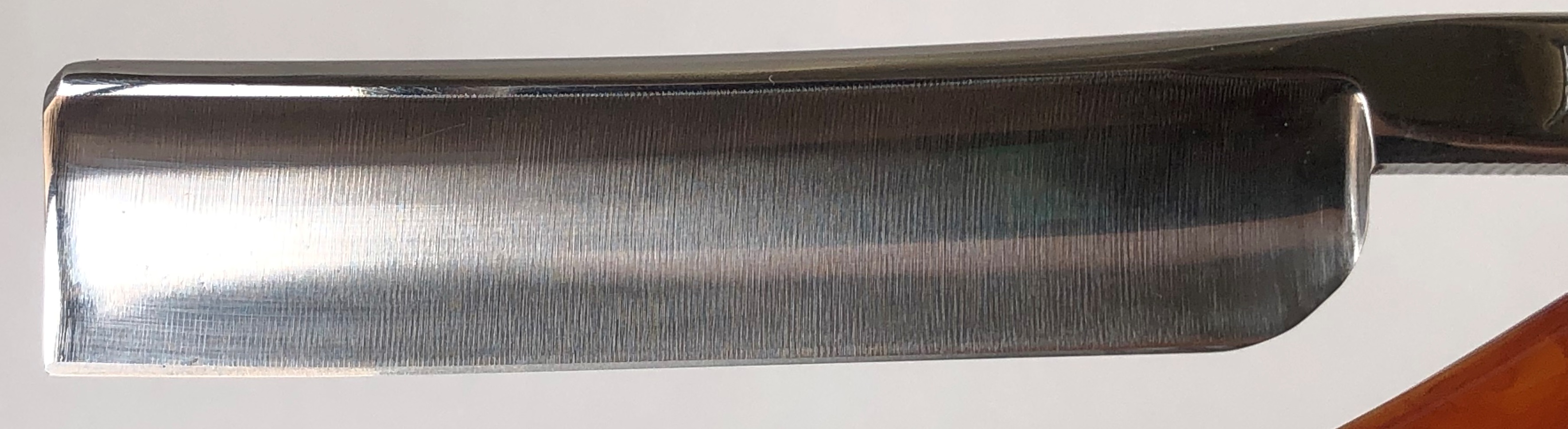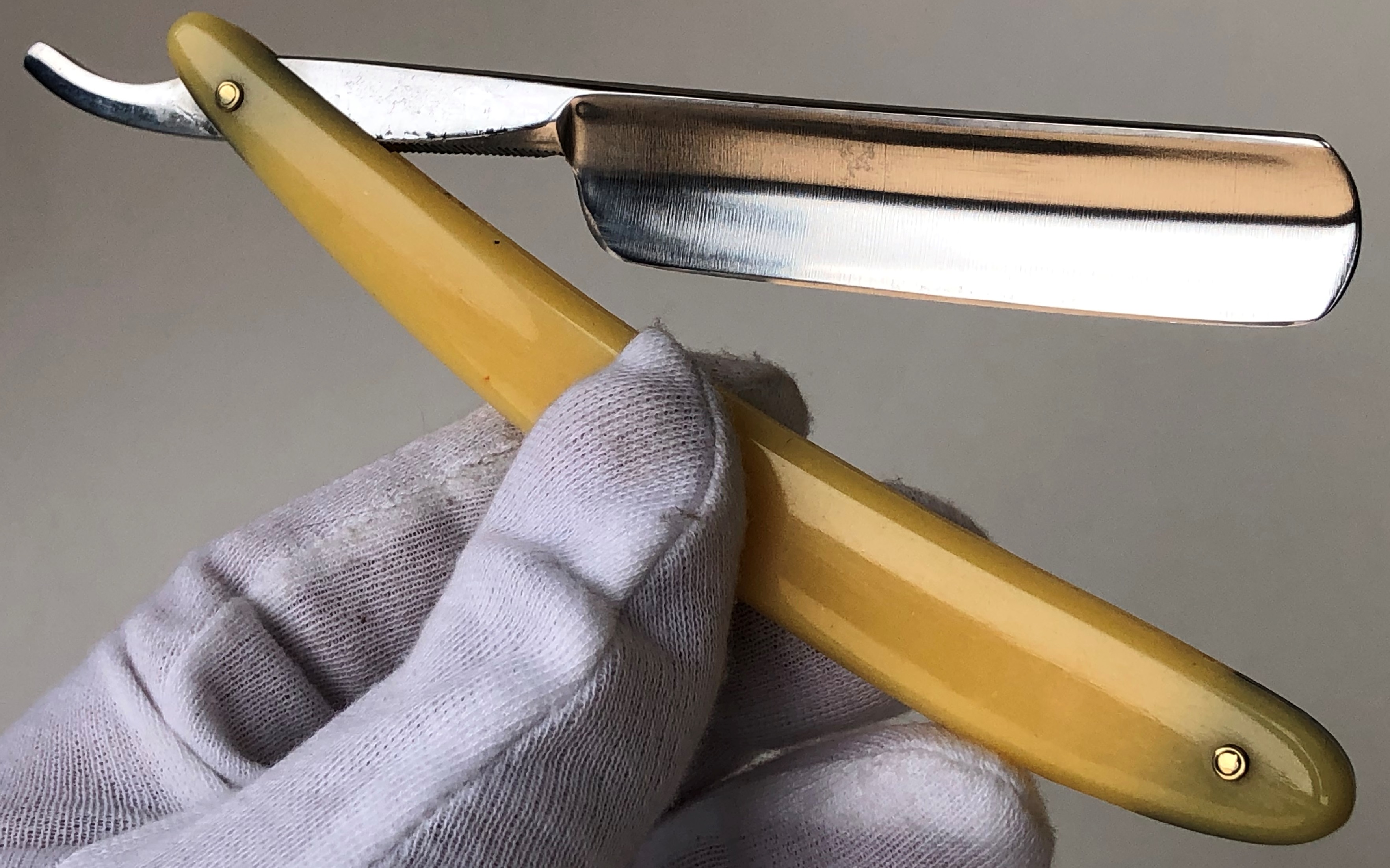 Бритва была разобрана, клинок по мере возможности приведён в порядок.Умеренная полировка. Кромочка немного широковата,но почти равномерна по всей длине полотна.Новые двух-цветные втулки и внутренние шайбы. Родная роговая оправа в хорошем состоянии,без критичных дефектов,но нужно сделать скидку на преклонный возраст материала.Но, внешних расслоений, трещин и разгрызанных мест нет.Удобная форма лезвия клинка. Бритва достаточно тяжёлая.