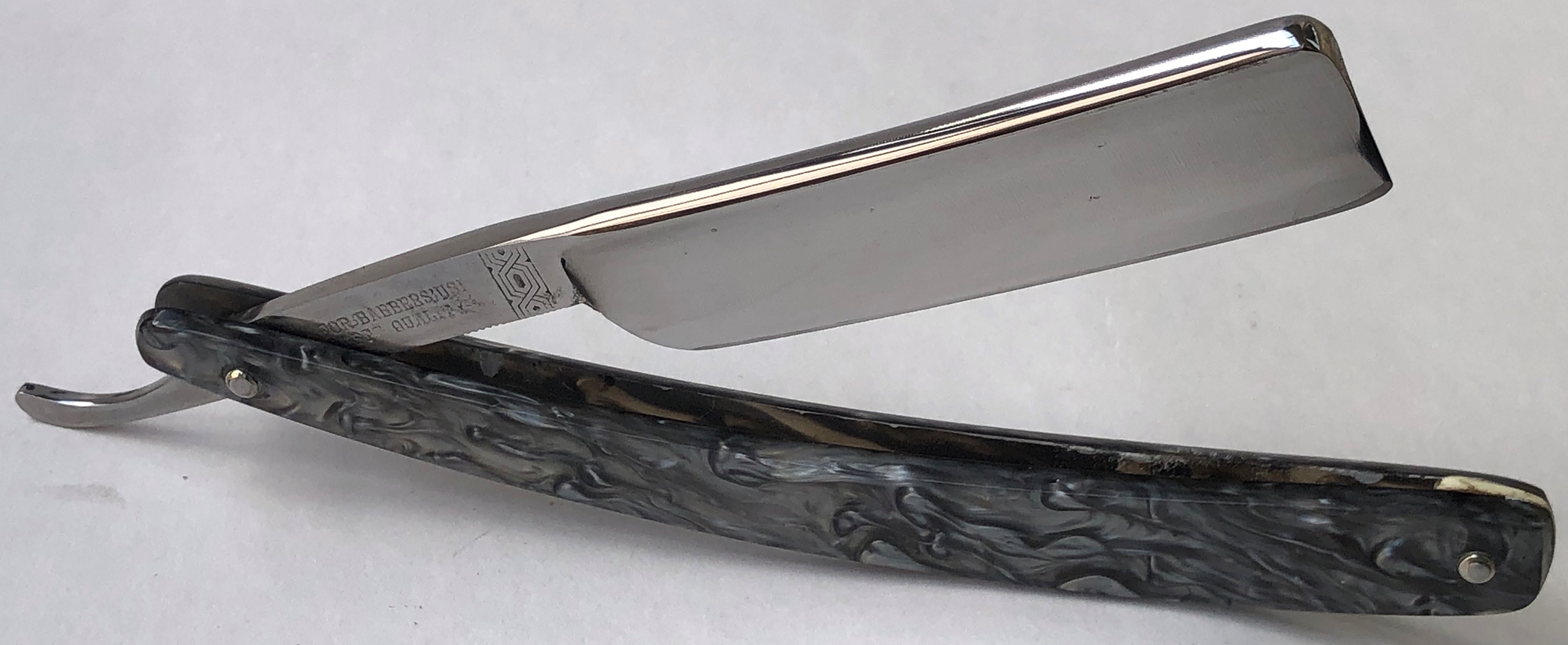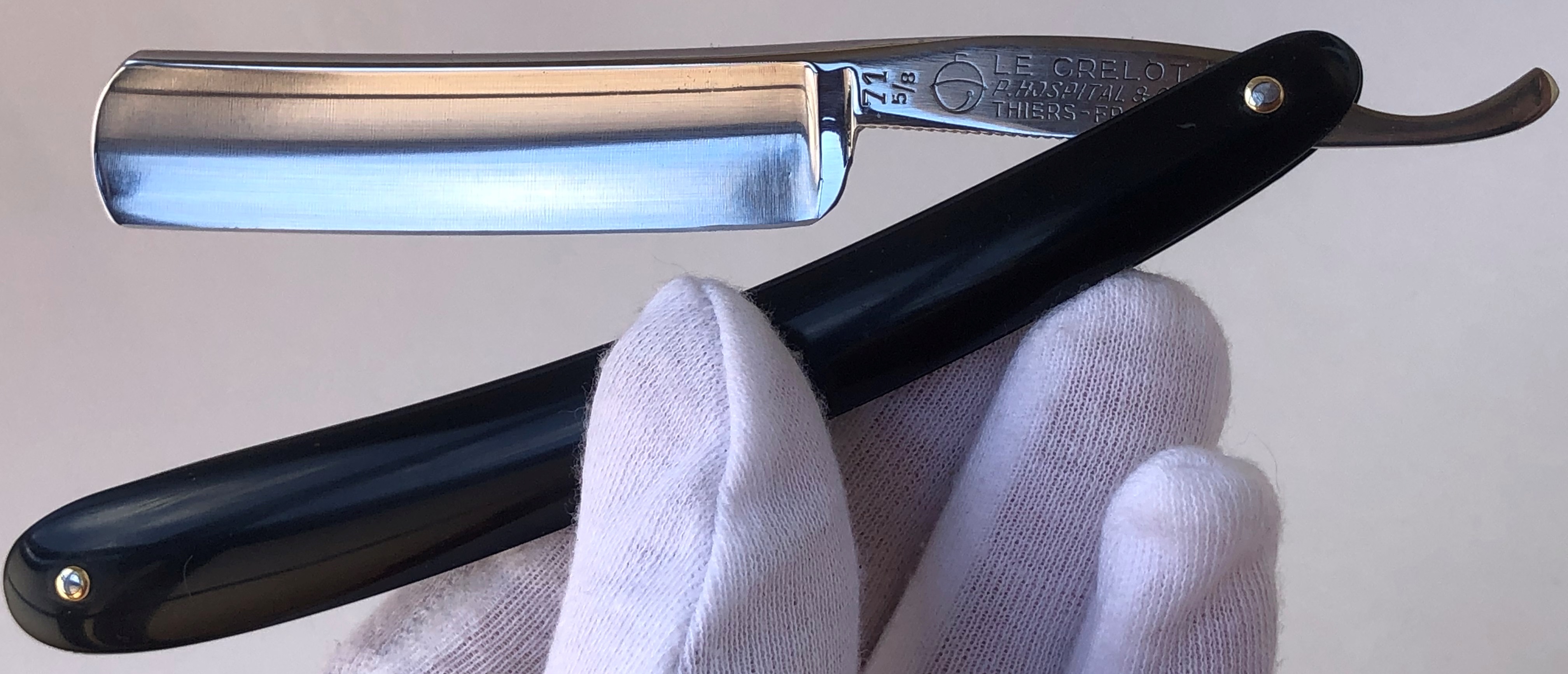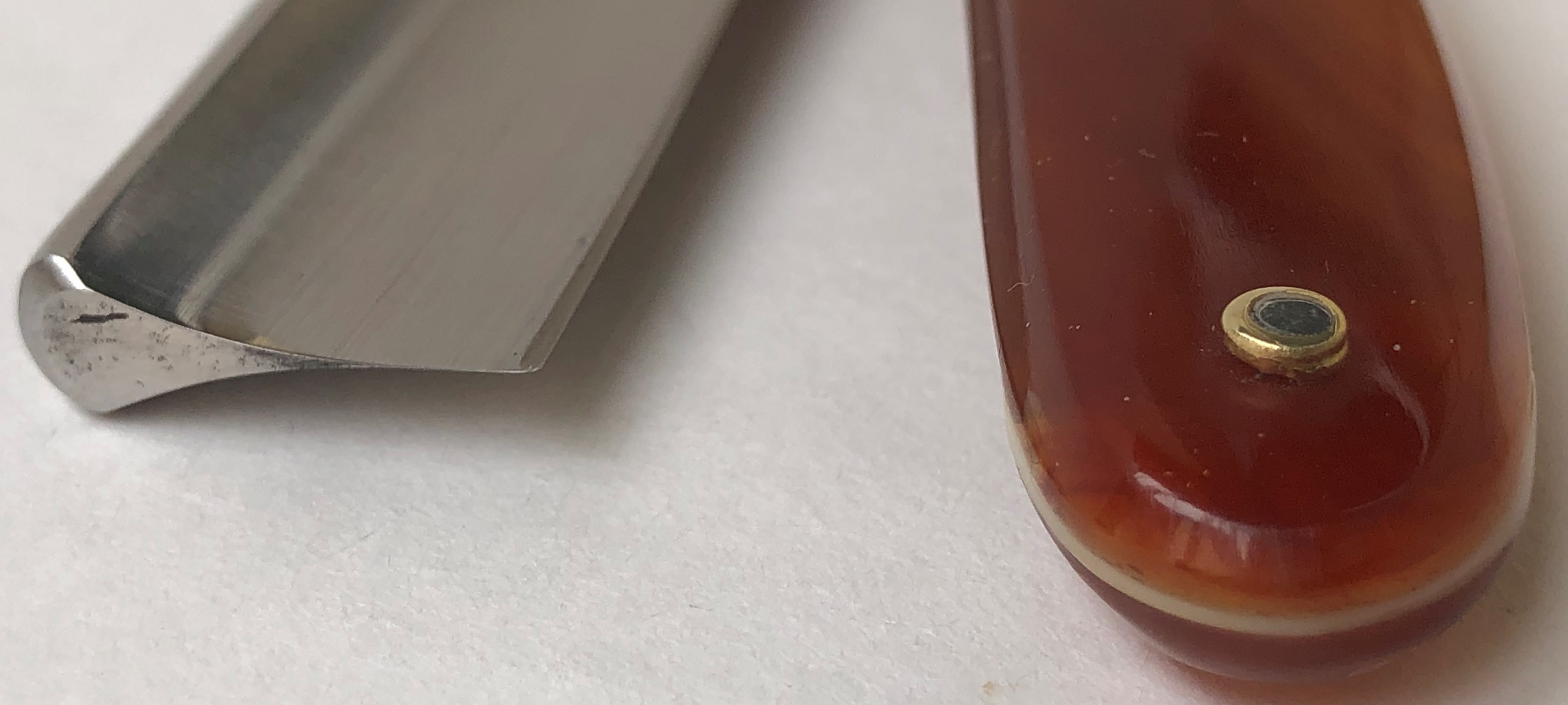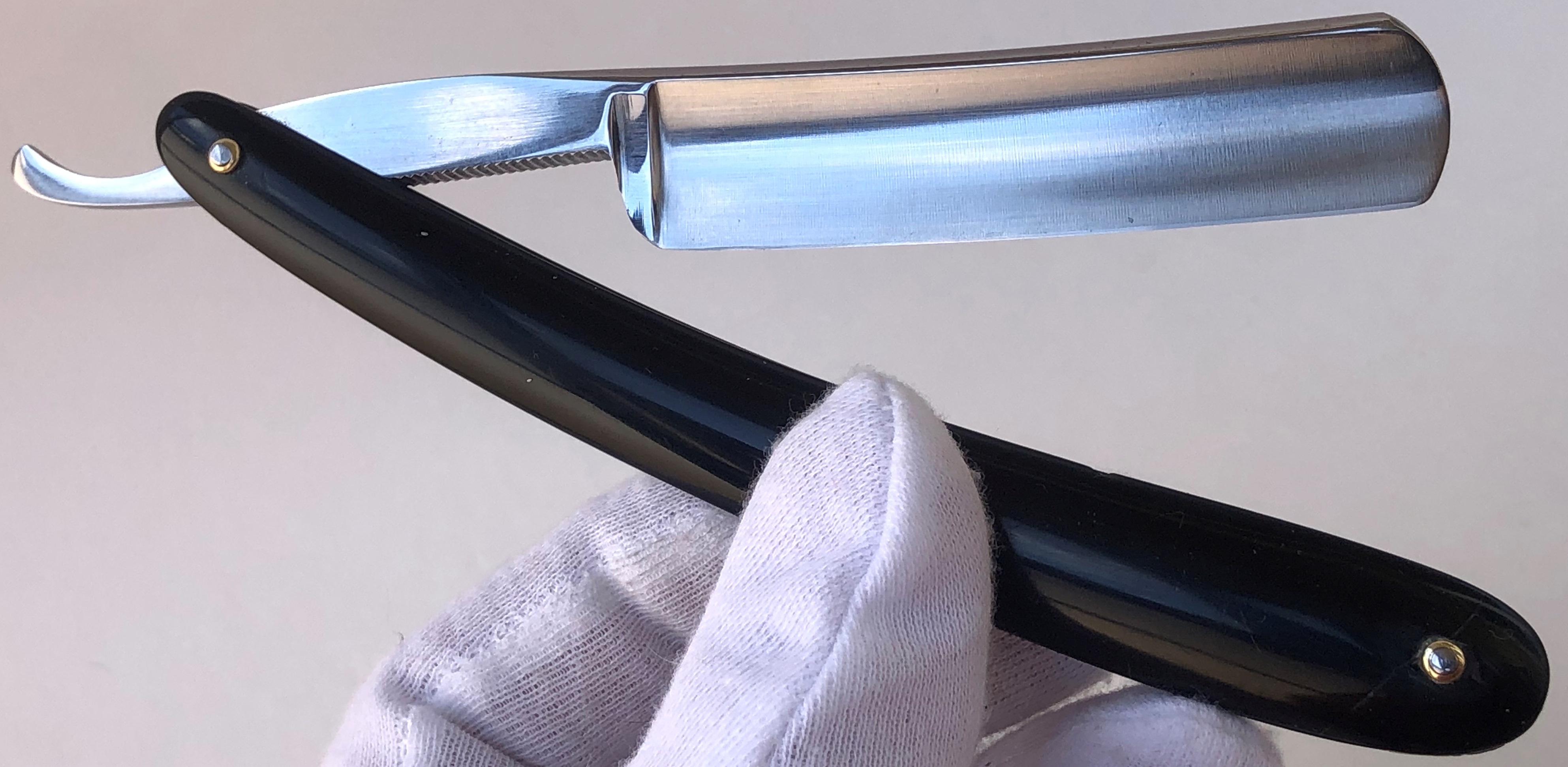 Бритва была разобрана, клинок по мере возможности приведён в порядок.Умеренная полировка. Кромочка немного широковата,но почти равномерна по всей длине полотна.Новые двух-цветные втулки и внутренние шайбы. Родная роговая оправа в хорошем состоянии,без критичных дефектов,но нужно сделать скидку на преклонный возраст материала.Но, внешних расслоений, трещин и разгрызанных мест нет.Удобная форма лезвия клинка. Бритва достаточно тяжёлая.