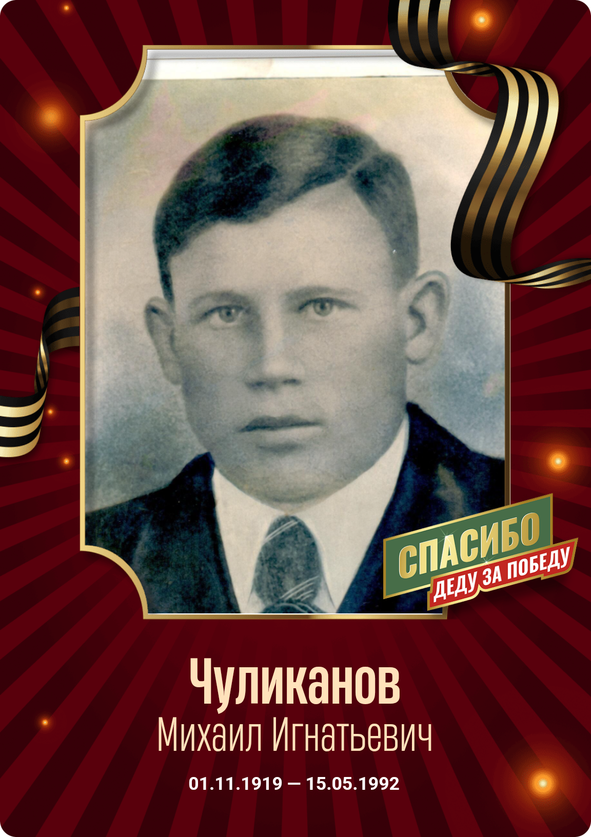 Тема поздравленийДед по отцу, Чуликанов Михаил Игнатьевич, воевал, но боевой путь был короткий. В первом же бою в окоп прилетела мина с миномёта. Ренение в ногу. Пока долставляли в санчасть (волоком под пулями, она далеко была) началась гангрена. Ногу орезали по колено. Госпиталь, комиссовали. Вернулся в деревню Мелекшино. Работал плотником, всю деревню с мужиками (такими же бедолагами и старыми) отстроил.