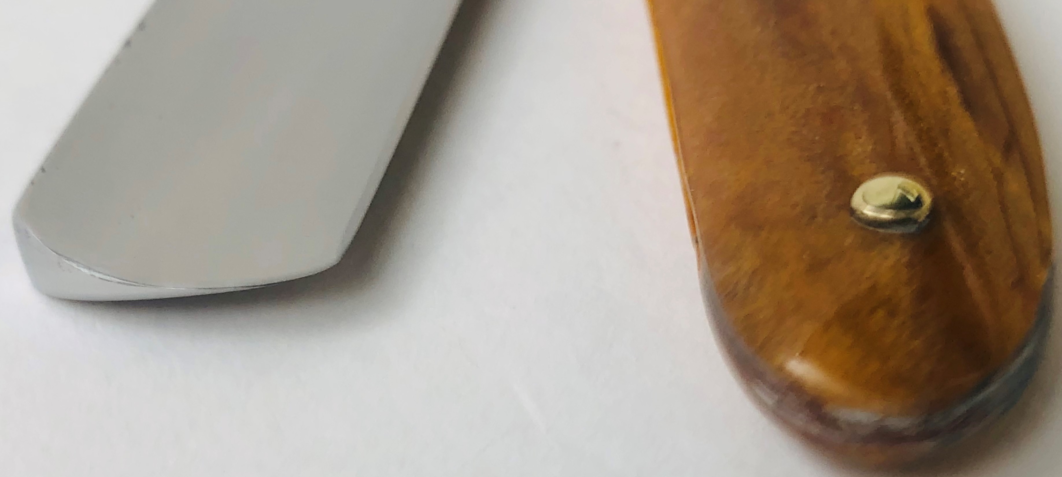 Разобрал, для удаления окисления в районе осевого пина и царапин на полотне.Минимальная шлифовка и полировка. Идеальная геометрия клинка:кромочка равномерна по всей длине.Заточена и готова к бритью.